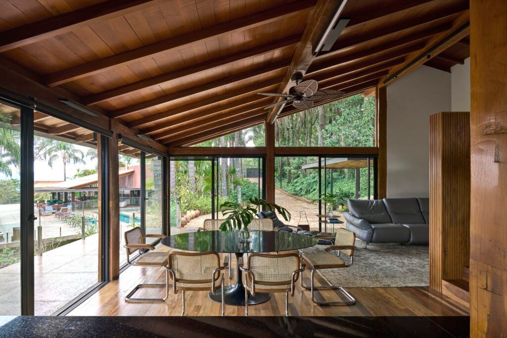 Uma das intervenções mais marcantes foi a criação de um pavimento de 200 m² em balanço sobre o vale. A nova laje, com nove metros de extensão, resultou em varanda e terraço voltados para a mata, dissolvendo limites entre interior e exterior. Painéis de vidro substituíram os antigos guarda-corpos metálicos, permitindo que a paisagem se tornasse protagonista.