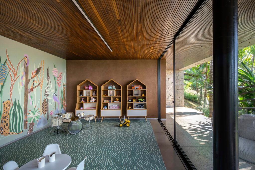 O nível inferior, antes pouco explorado, se tornou um polo de convívio. Varanda, sala de conversas, adega, sala de jogos, espaço infantil e ateliê compõem uma dinâmica de uso mais diversa e integrada ao terreno em desnível.