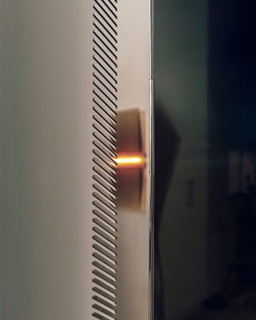 Com mais de três décadas dedicadas à serralheria artística, a Villa Ferg, ateliê paulistano reconhecido por unir precisão industrial e maestria artesanal, assina a execução de uma peça de destaque em colaboração internacional. O estúdio foi responsável pela materialização de um espelho escultural em aço inoxidável, concebido como peça central da exposição, que propõe uma releitura contemporânea do tradicional espelho.