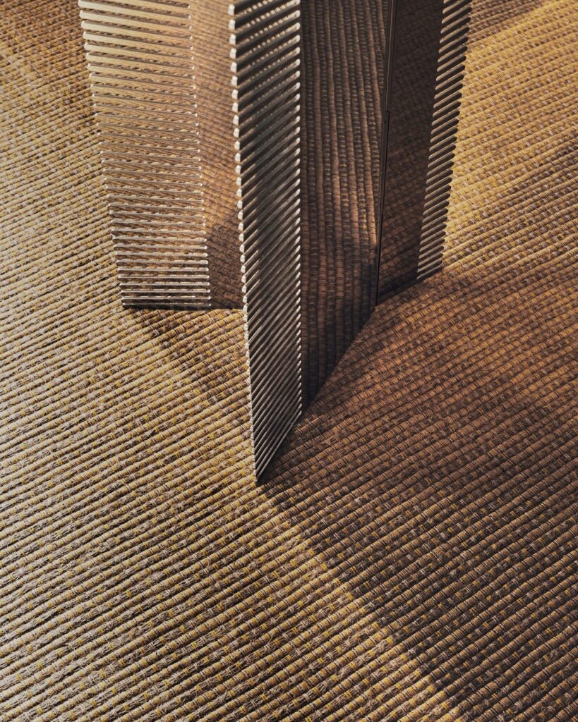 Inspirado em formas Art Déco e na estrutura de um biombo, o espelho possui três planos articulados por uma dobradiça central, o que permite sua movimentação e transforma o reflexo em uma experiência dinâmica e mutável. As finas cerdas cortadas a laser, aplicadas às bordas, produzem um efeito delicado de difusão da luz, um jogo entre o visível e o invisível, entre a matéria e o reflexo.