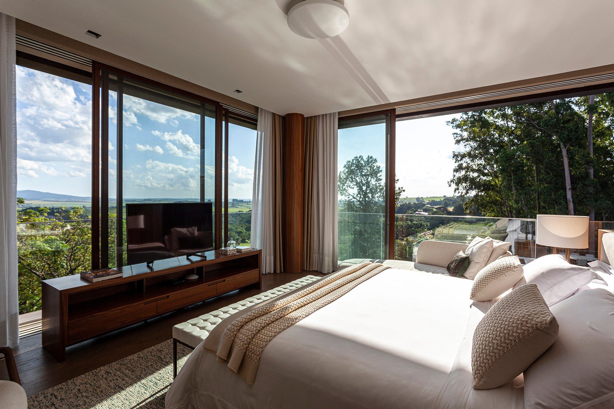 Os espaços sociais e íntimos da residência foram cuidadosamente projetados para se abrirem à paisagem, o que gera uma sensação de fluidez e conexão com o ambiente. A arquitetura moderna se destaca pelas amplas aberturas e pela presença marcante dos brises, que filtram a luz natural e proporcionam um ambiente confortável e acolhedor.