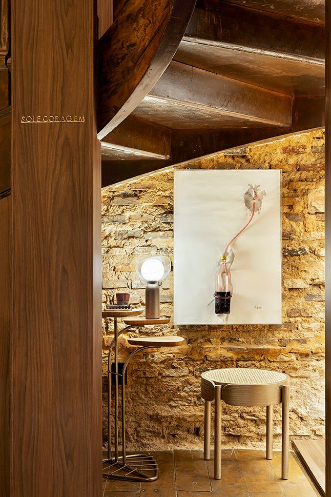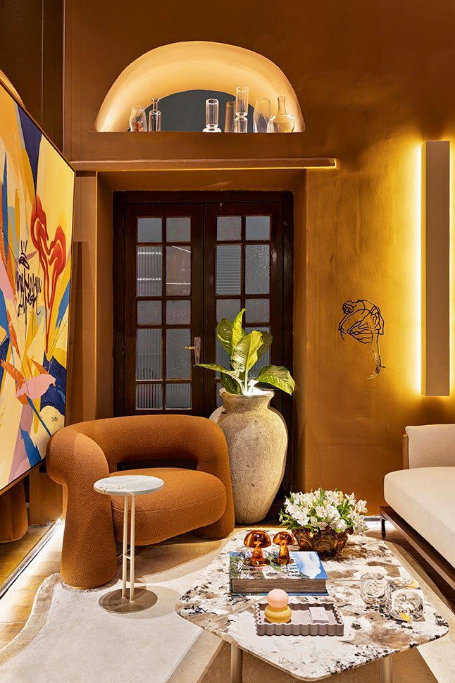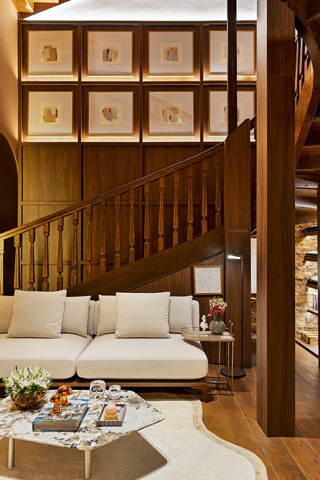 O projeto ganha força na delicada fusão entre passado e contemporaneidade. A Casa Nossa Senhora das Mercês serviu de inspiração para elementos preservados, como a escada restaurada, que dialoga com o MDF Aalto da Dell Anno em perfeita continuidade estética. Formas curvas, texturas orgânicas e materiais naturais foram escolhidos para despertar sensações táteis e convidar à contemplação.