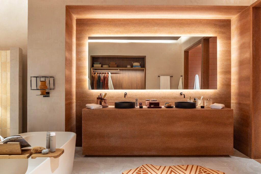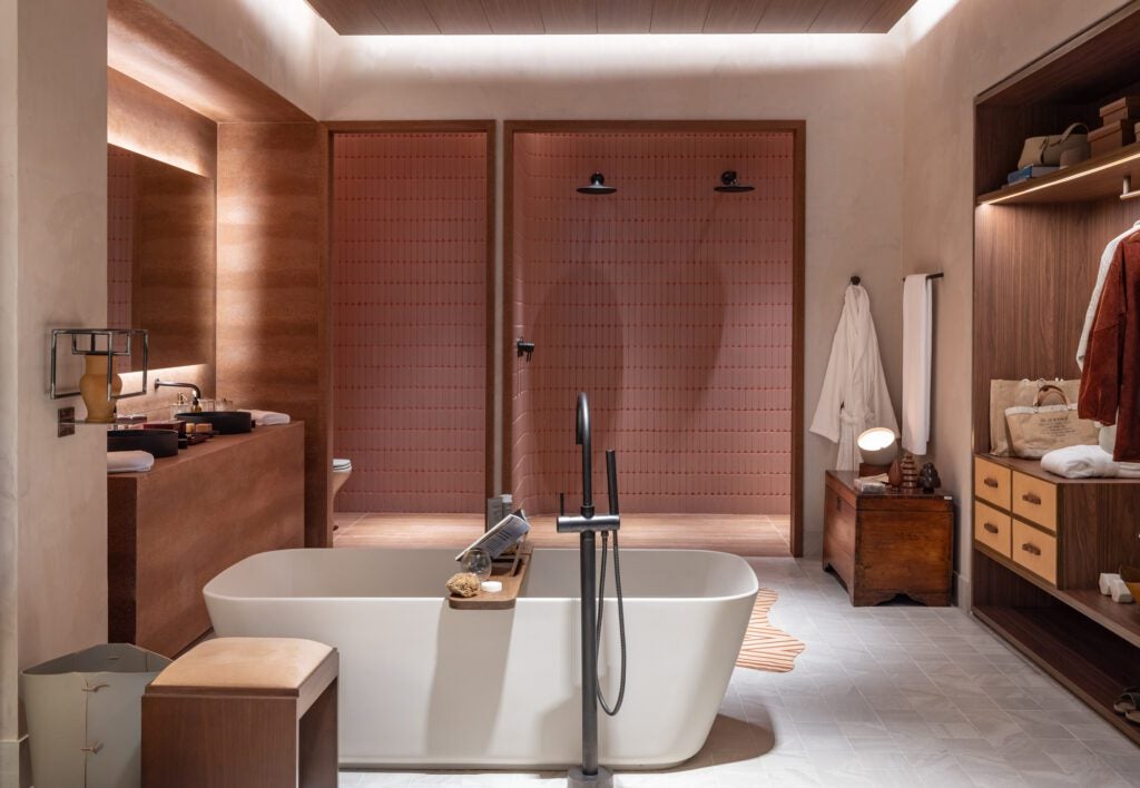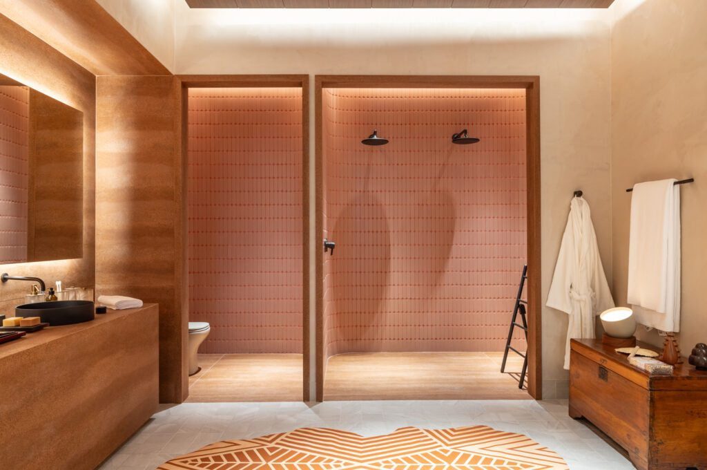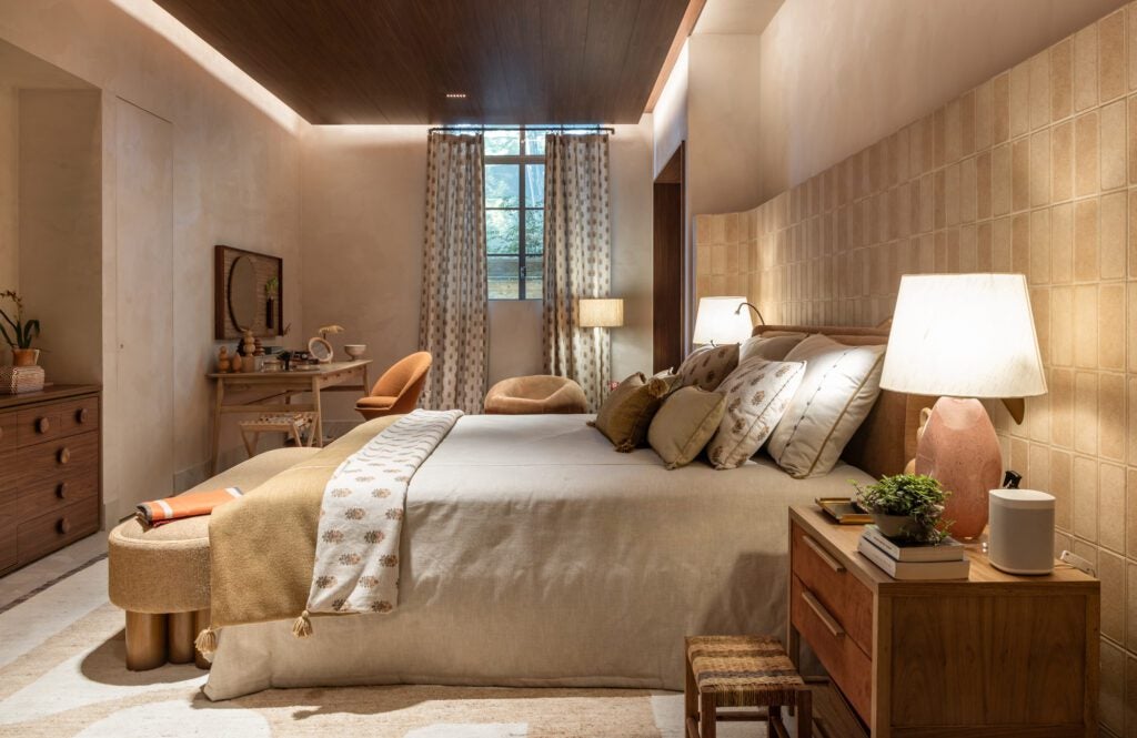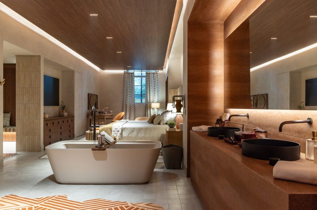 Nesta edição, Marina também assina peças de mobiliário exclusivas, como o sofá Encontro para a +55 Design, a cama Atacama para a Casapronta, a banqueta Apruma para a Franccino e mesas de jantar e de centro que exploram a materialidade dos revestimentos Portinari.