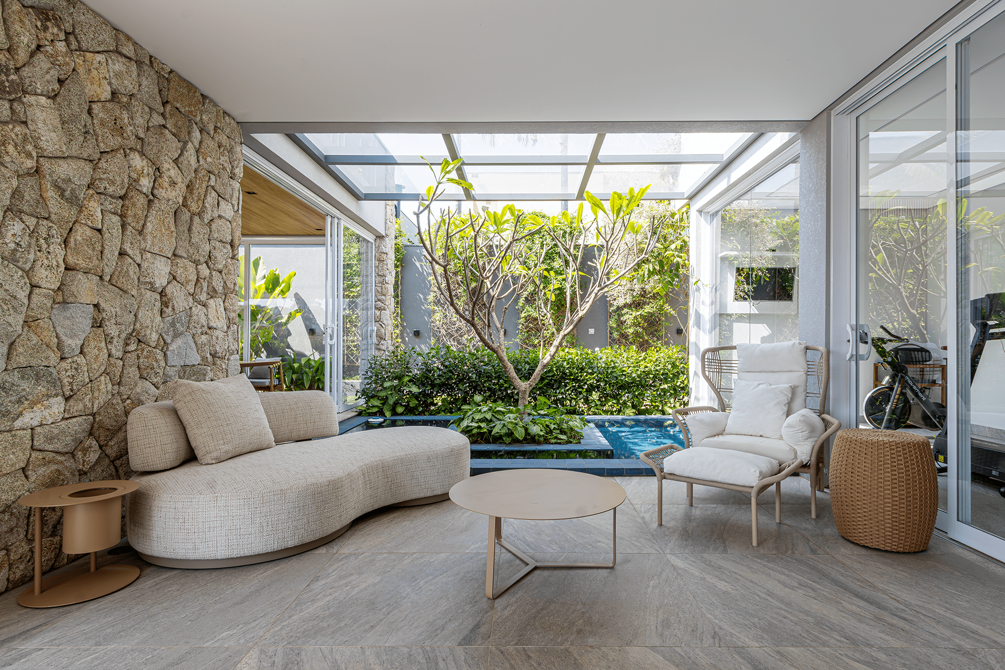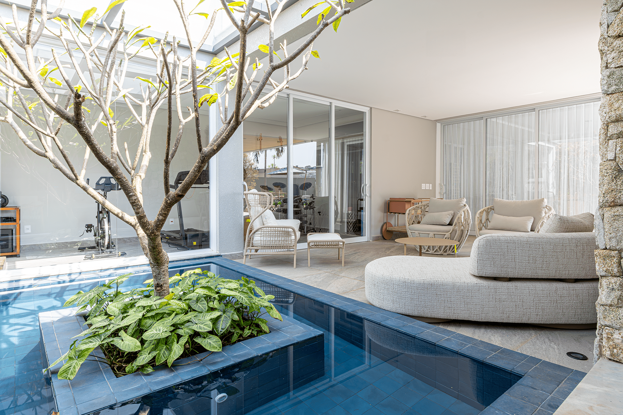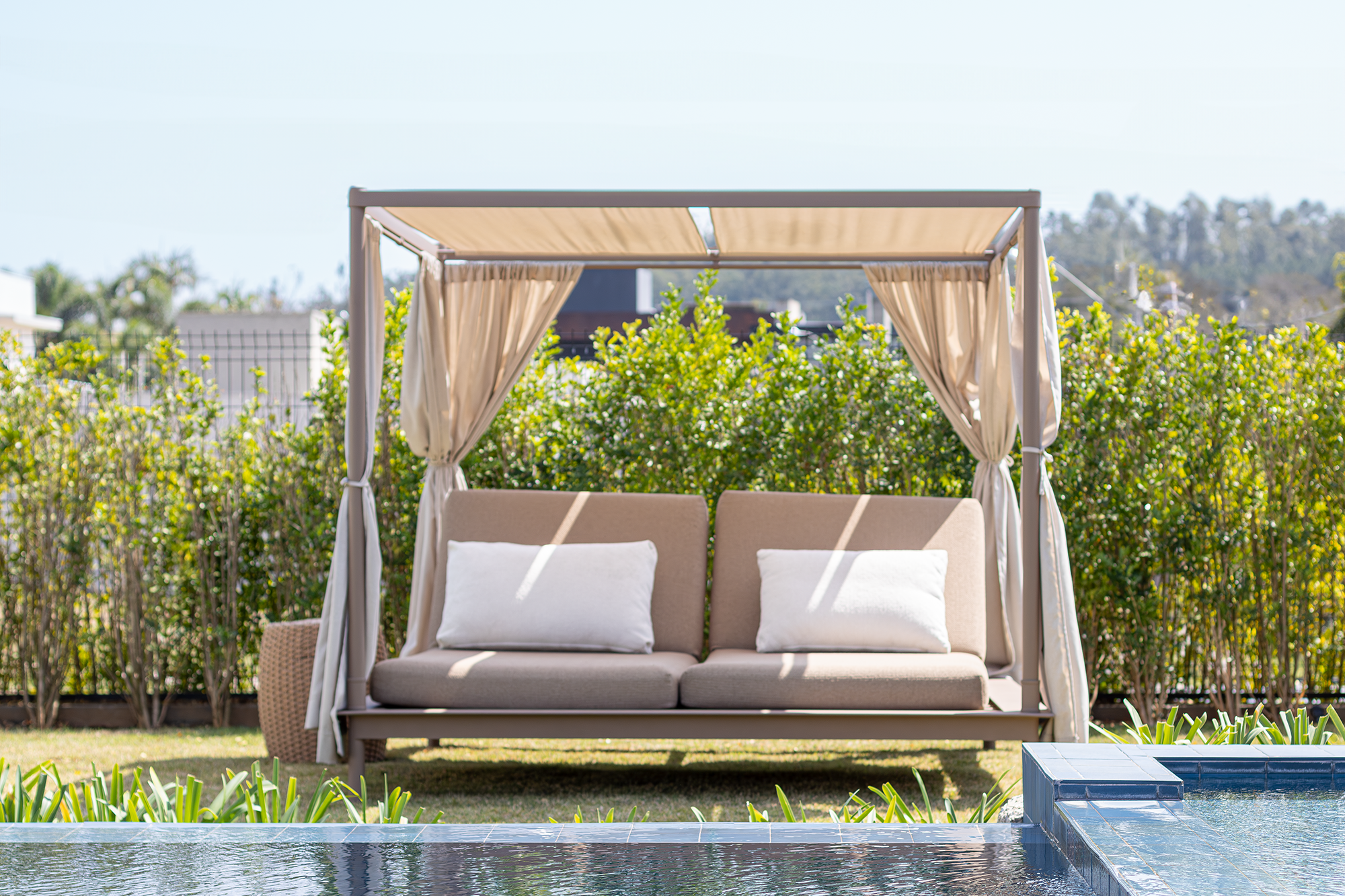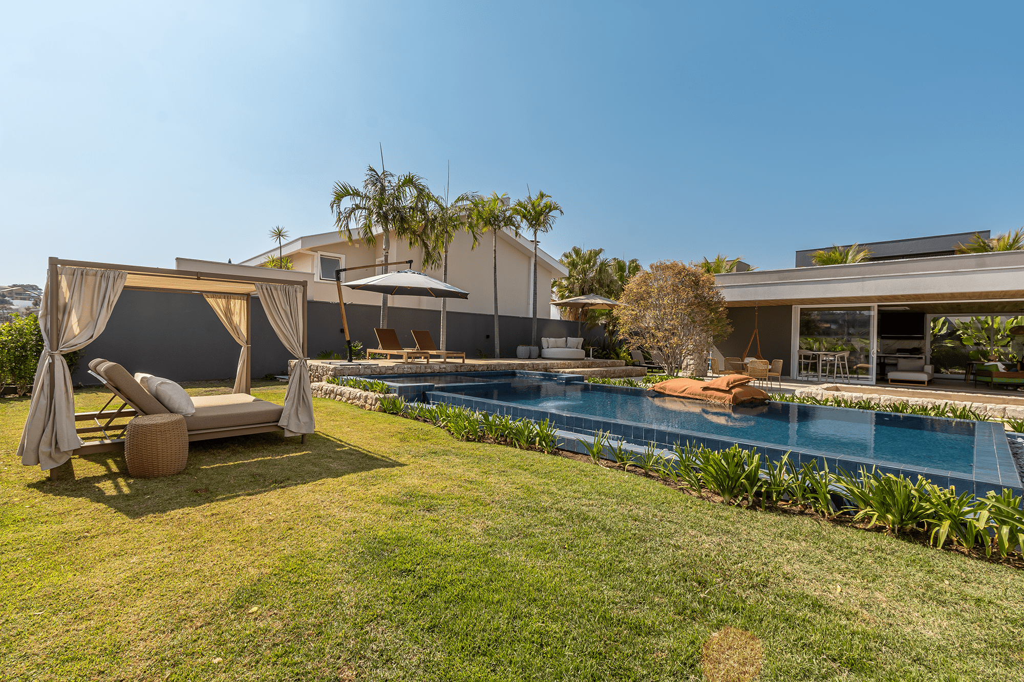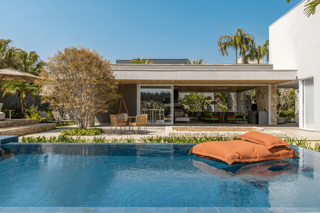 A nova piscina amplia os espaços ao ar livre e acompanha o estilo de vida descontraído da família.