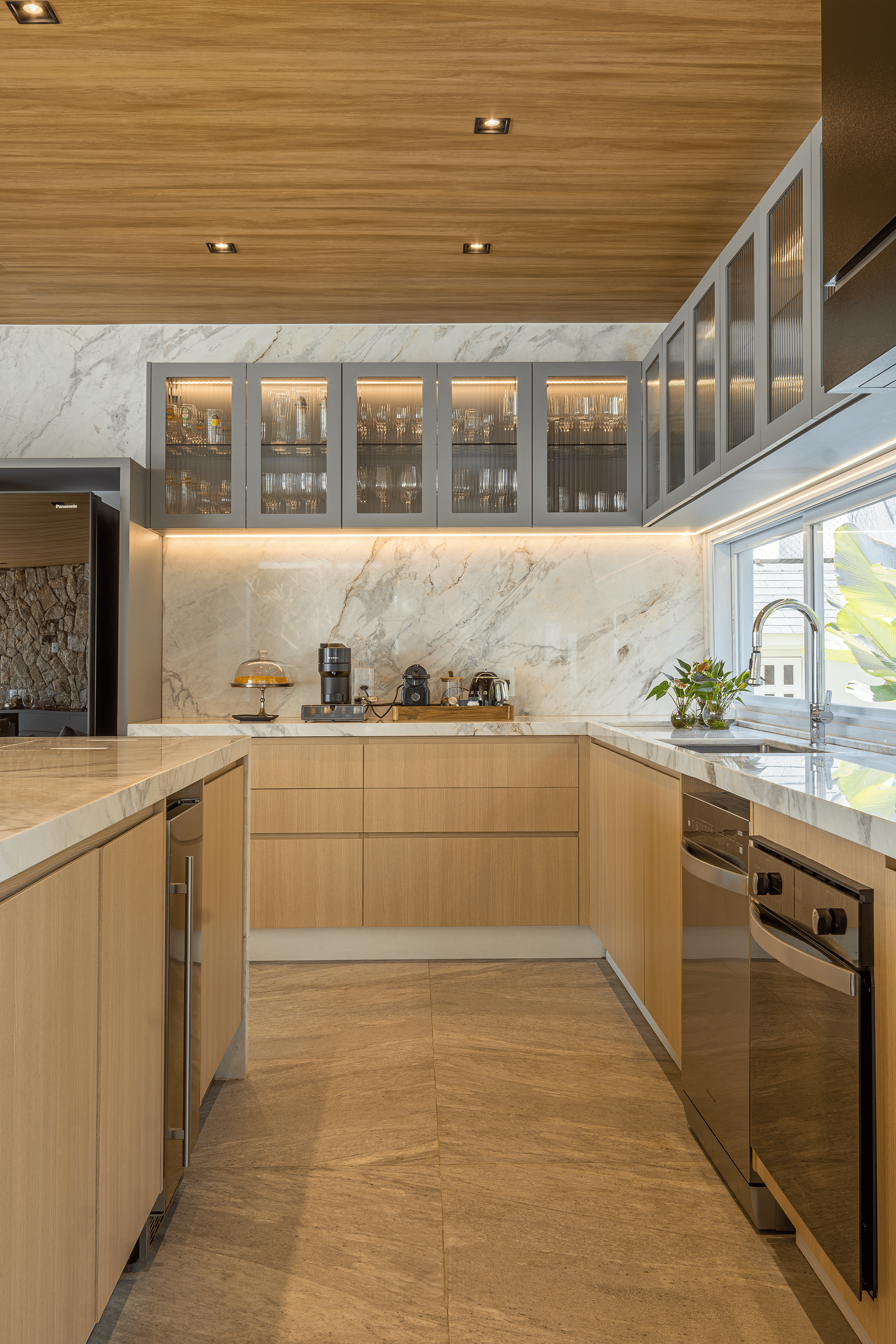 A harmonia entre cozinha, jantar e bar favorece o uso social e torna o ambiente mais acolhedor.