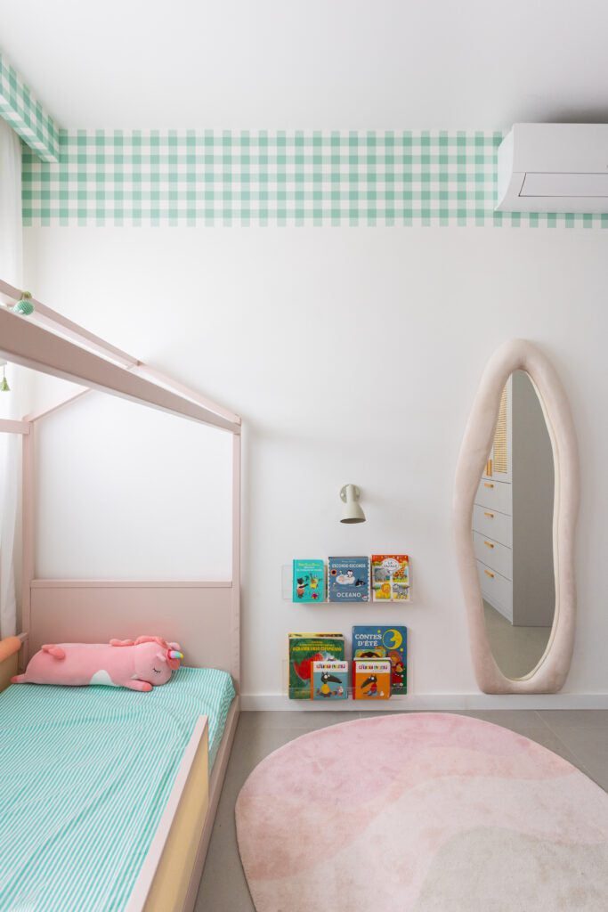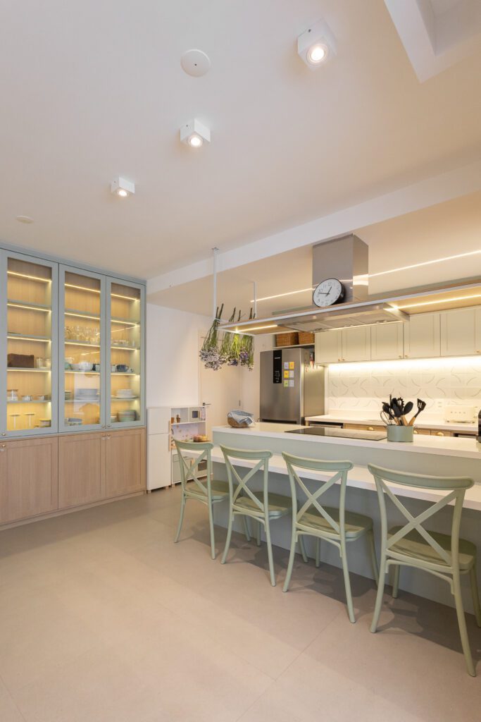 Na área social, o destaque é a integração entre sala, cozinha e jantar, costurada por escolhas de marcenaria sob medida e elementos que evocam memórias afetivas. Um dos detalhes mais comentados do projeto está na cozinha: uma delicada composição de flores, colocadas pela própria moradora na serralheria que divide o ambiente. Pequeno gesto, grande significado. “É ali que o projeto ganha alma, quando ele começa a receber a história de quem vive”, comenta Rafaella no vídeo de apresentação.