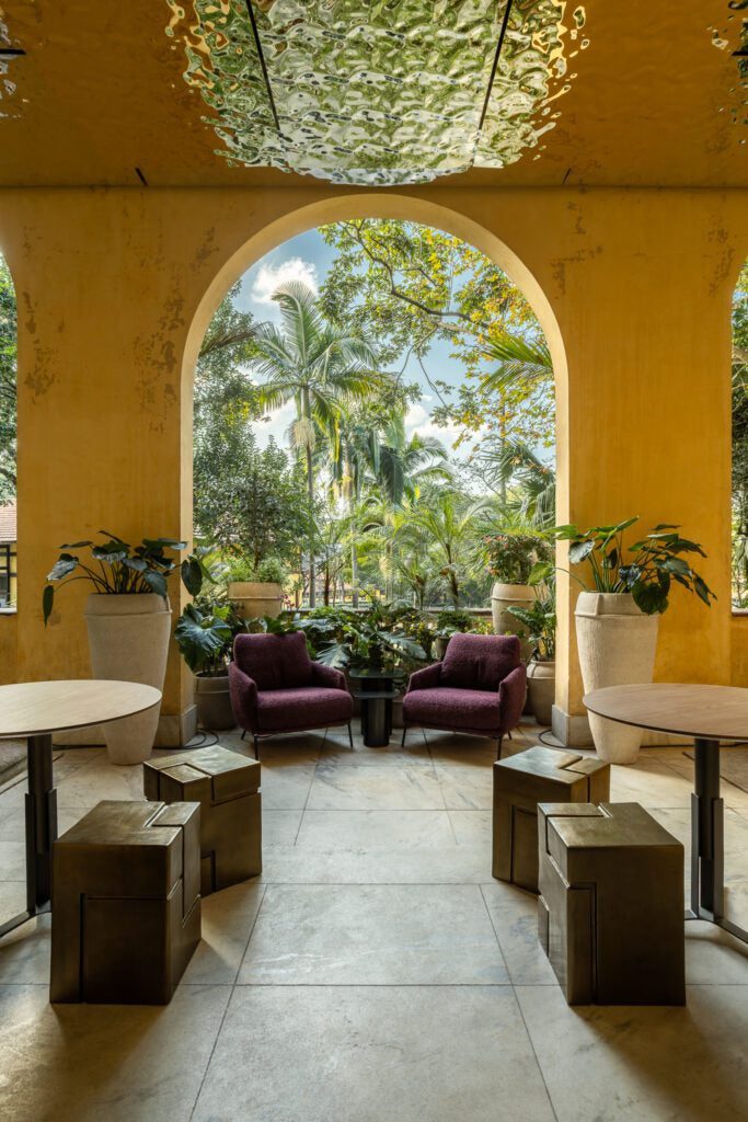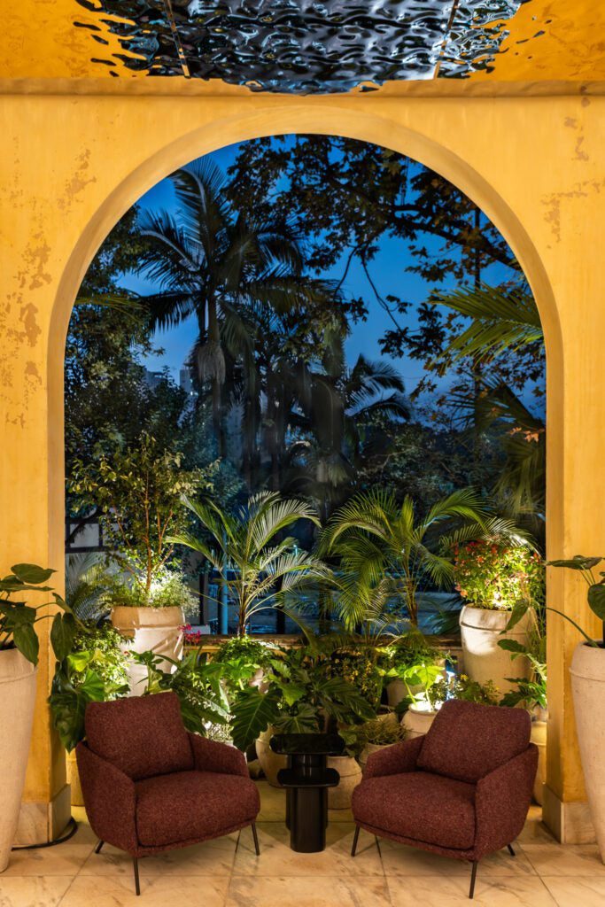 A escolha das plantas não é decorativa: mini-pitangas, palmeiras jussara e petrópolis, goiaba-da-serra, capim-dos-pampas e philodendros criam um jardim narrativo que abraça quem chega, despertando sentidos e memórias ancestrais.