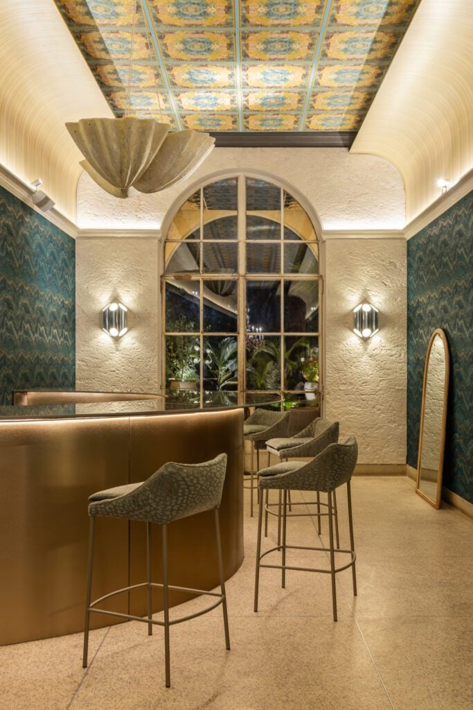 Ao fundo, a concha que ecoa Botticelli flutua entre instalação e escultura. É uma peça-instalação que transforma o bar em altar, entre drinques e deuses. Já o balcão e os pórticos, em pedra, reforçam a matéria ancestral que ancora o espaço, equilibrando o lúdico com o terreno.