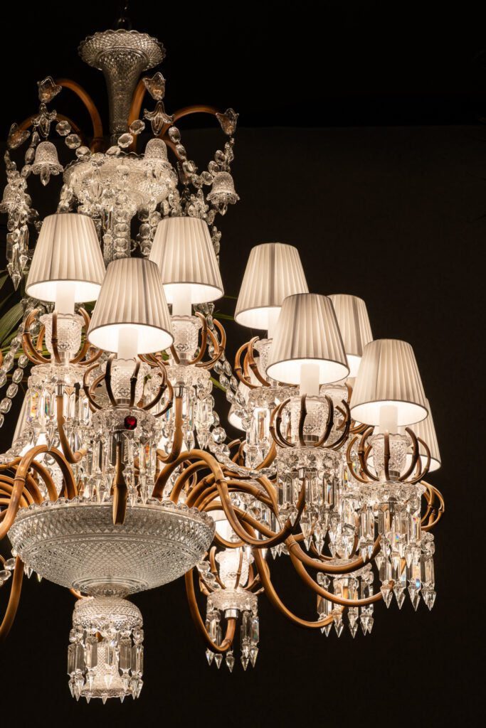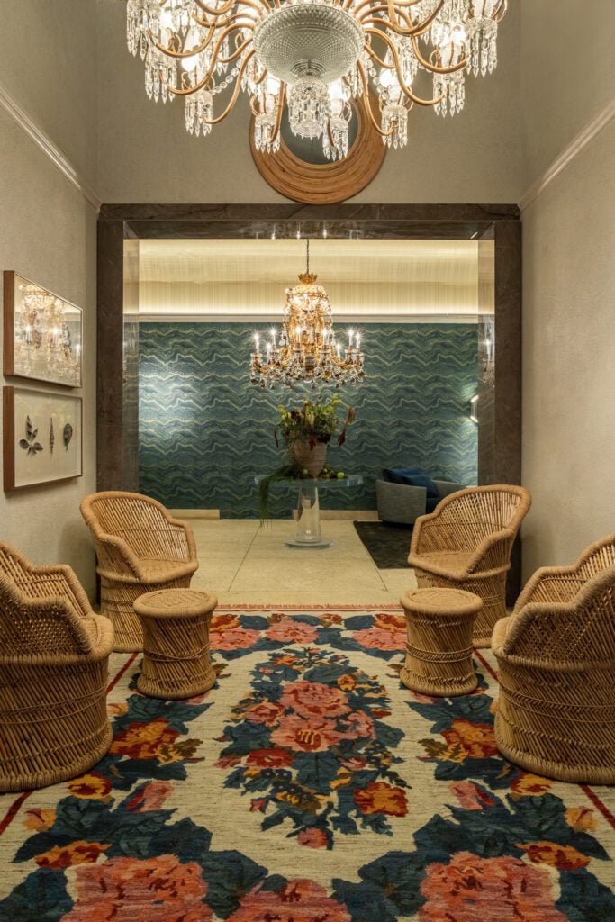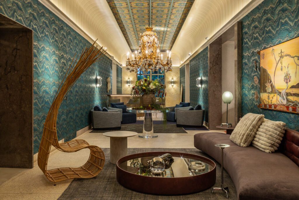 Logo na entrada, a poltrona Vertigem, em rattan natural, recebe o visitante como um símbolo vivo da delicadeza que resiste. No teto, o papel de parede da grife Versace imprime ornamentos dourados que dançam com a luz, enquanto um Baccarat do século XIX paira acima de uma mesa italiana de acrílico maciço — como uma joia que não pertence a esta era. As flores, secas e frescas, misturam eucalipto, urucum, musgos e frutas, refletindo os cristais do lustre e completando a mise-en-scène.