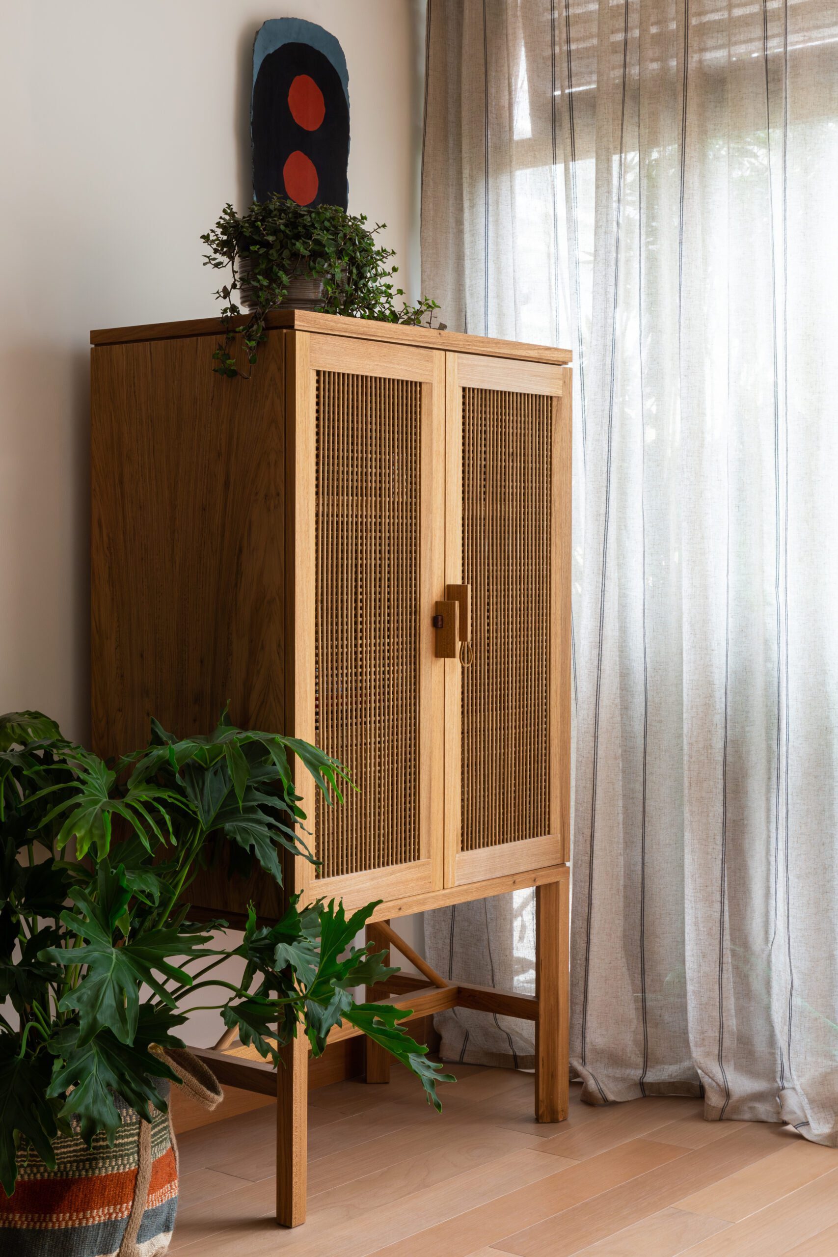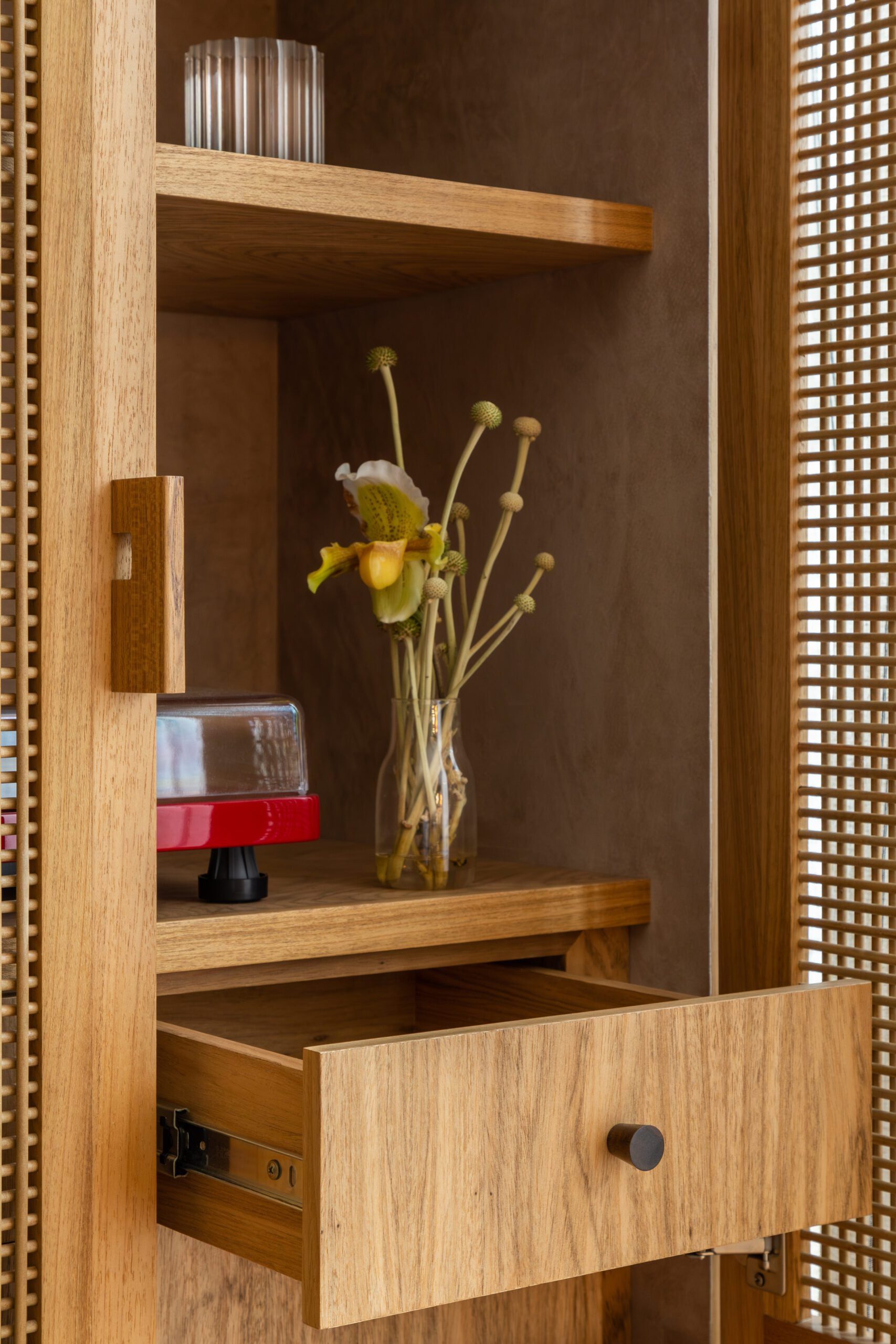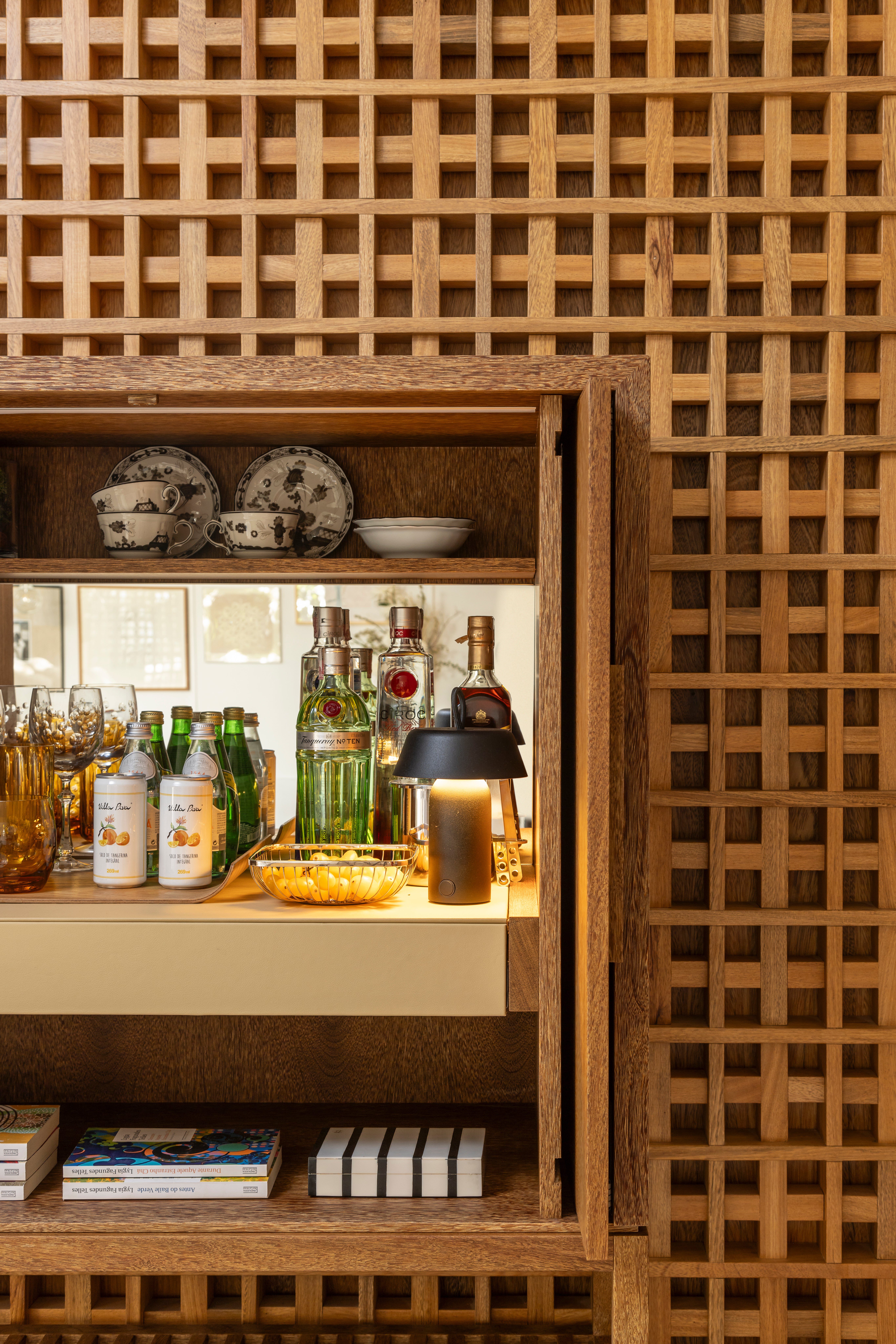 Assim é o bar Omero, com desenho da designer Isabelle de Mari para a Olho Móveis Artesanais, que foi customizado pelas arquitetas, especialmente para a mostra, com portas retráteis que ficam ocultas enquanto o móvel está aberto, tendo em seu interior prateleiras e gavetas. Na versão para a CASACOR, o revestimento externo é palha, mas pode ser personalizado com pergaminho.