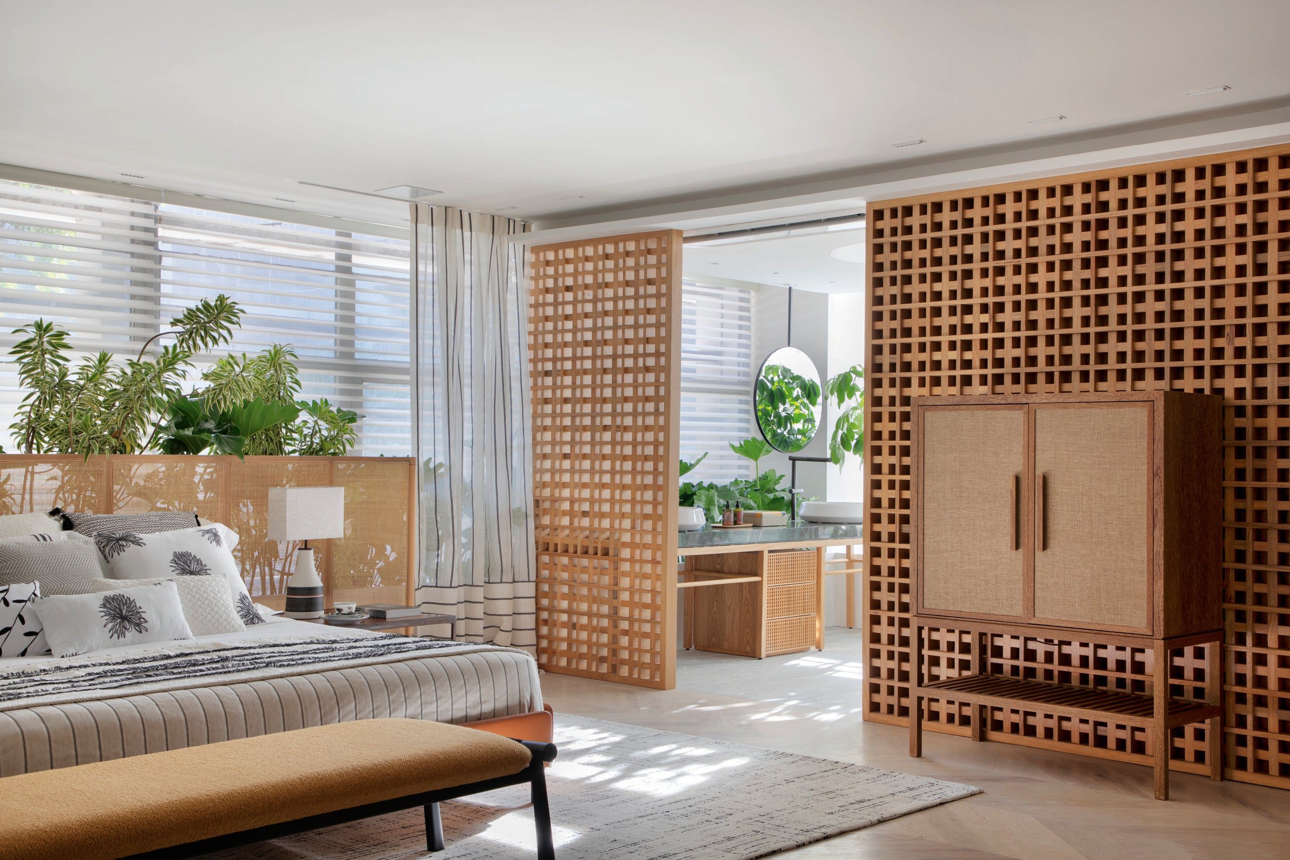 Na Suíte do Casal, as arquitetas Adriana Valle e Patricia Carvalho, do escritório @migsarquitetura, imprimiram o lado autoral nos desenhos de marcenaria, que é a paixão de ambas —amigas desde a infância e sócias há 18 anos.  Elas gostam de pensar em todos os detalhes das peças, incluindo versões perfillsonalizadas, a fim de que o mobiliário atenda a demandas práticas e, ao mesmo tempo, seja parte essencial no resultado harmônico do ambiente.