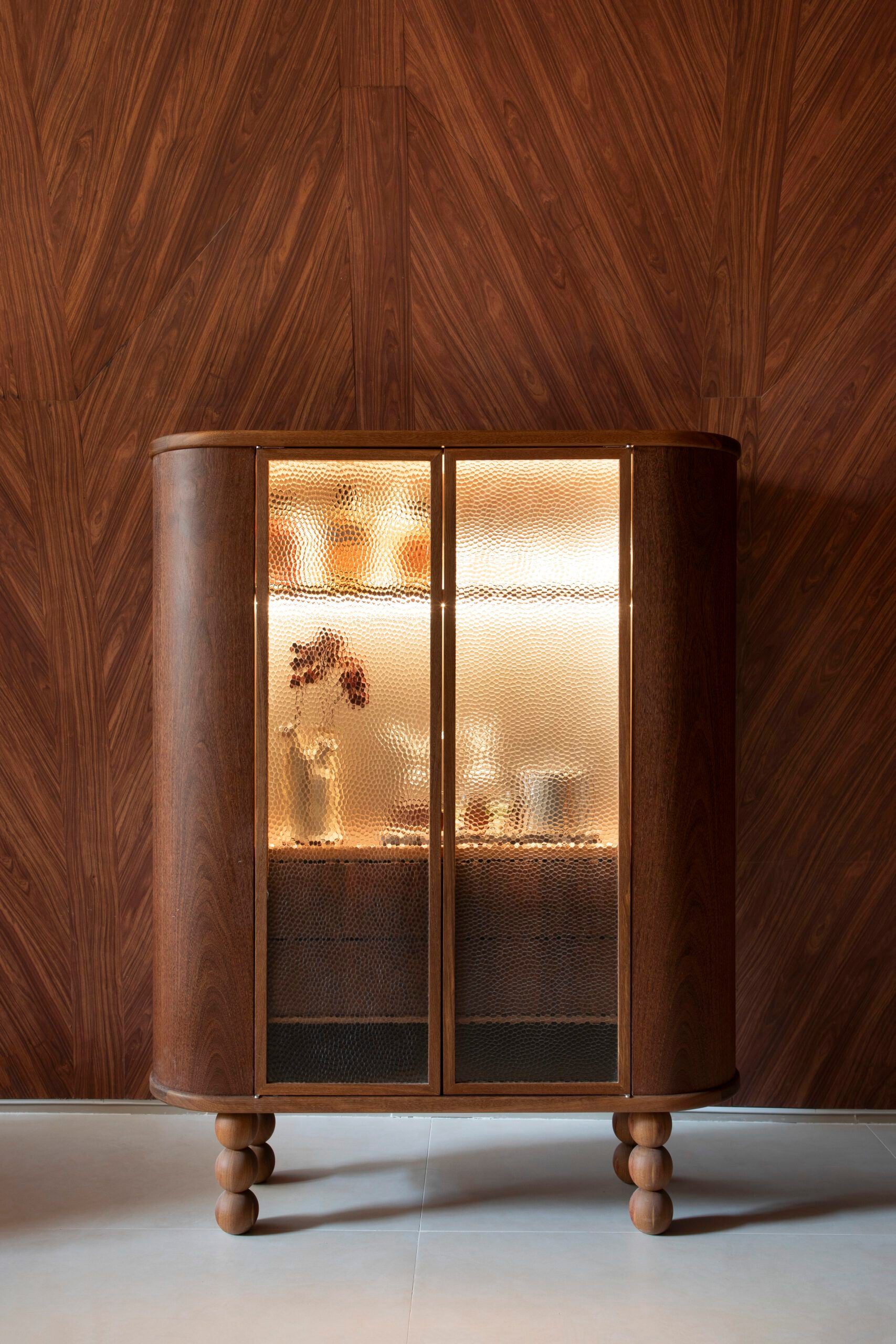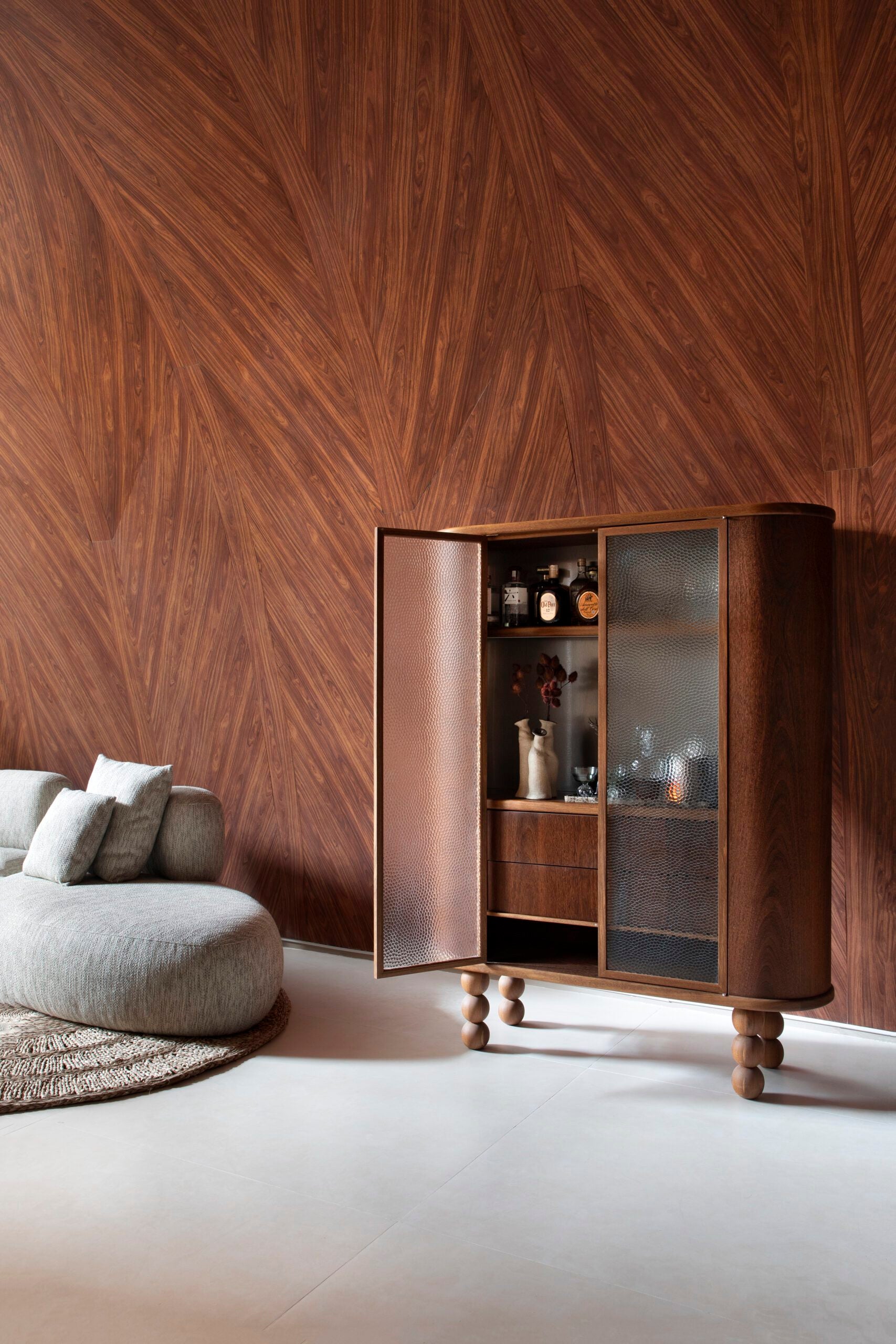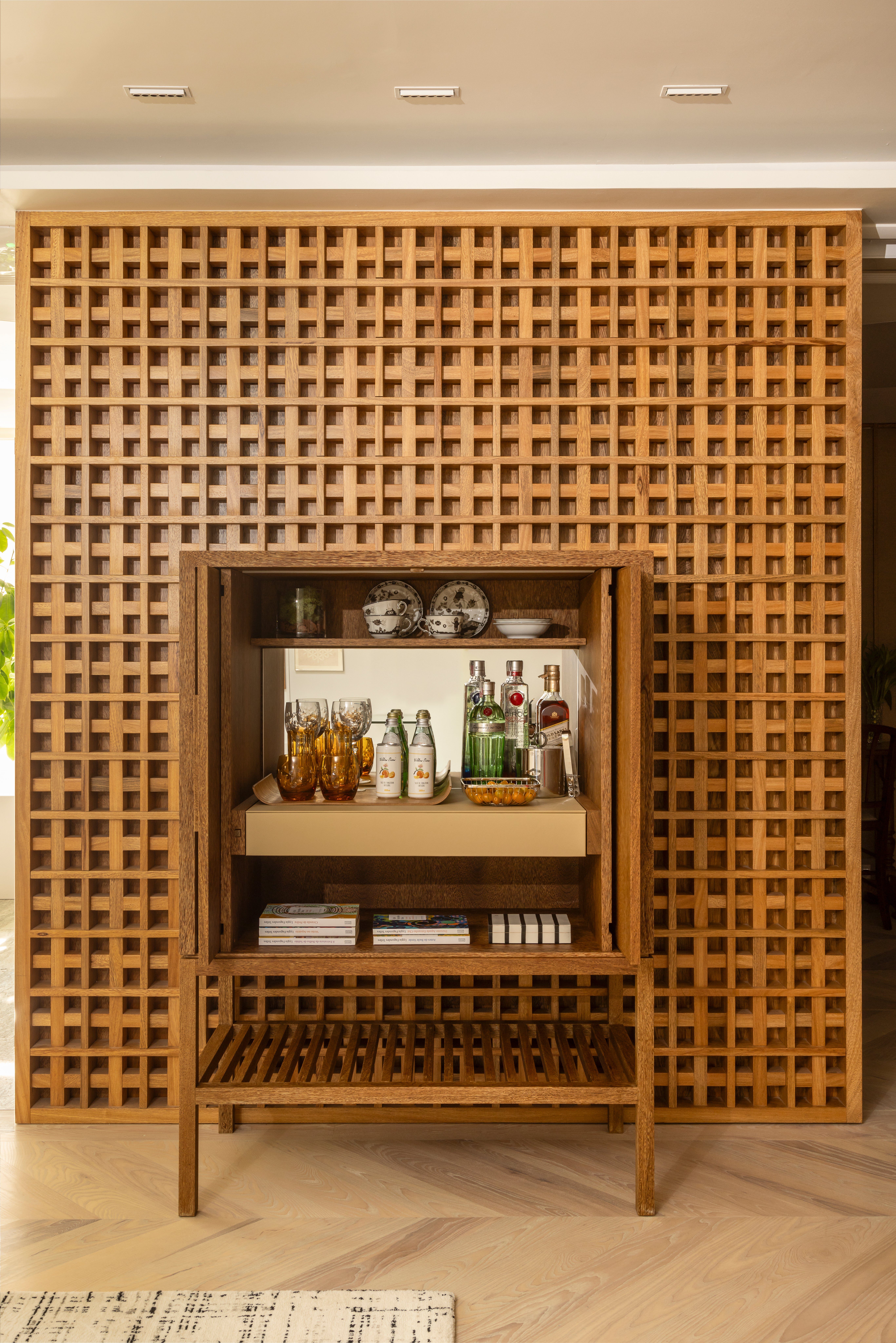 O escritório SALA2 Arquitetura, de Vanessa Martins Miranda, criou para a Casa Urucum, ambiente que desenvolveu em CASACOR, uma peça única: o Oratório Bar. Feito de madeira sucupira, formica Steel Gray e vidro martelado, o Oratório Bar tem prateleiras e gavetas internas, que permite armazenar além de bebidas, objetos pessoais, destacando-se também por seus pés esféricos.
