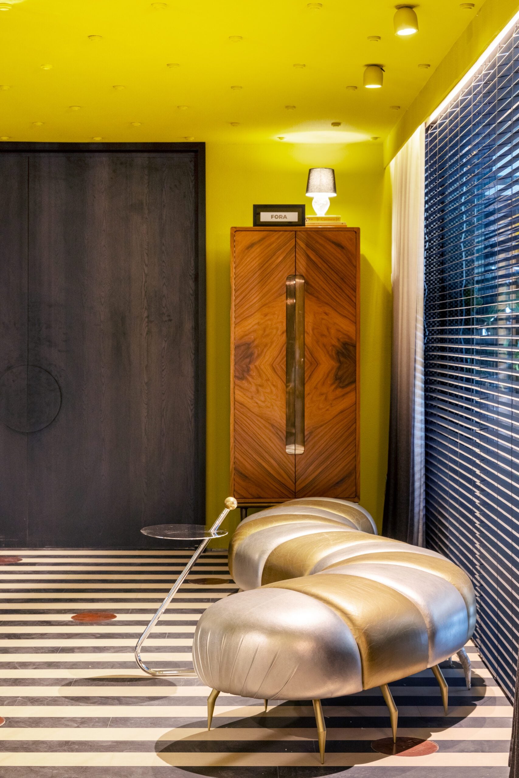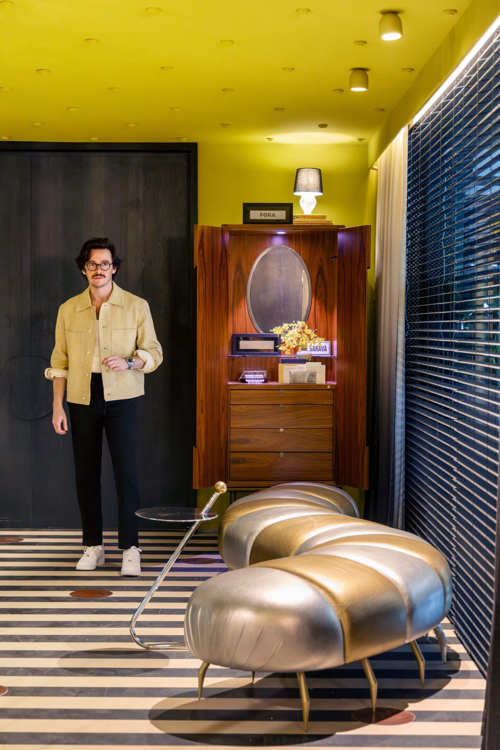 No hall do apartamento do arquiteto curitibano Gustavo Scaramella, em CASACOR São Paulo, o armário DEVA, da Vermeil Móveis, ocupa local de destaque.  Com medidas 75 x 45 x 190 cm, a peça é feita de pau-ferro natural, tem gavetas internas, iluminação e até um espelho. O móvel ajuda a organizar os ambientes e a expor correspondências e objetos pessoais.