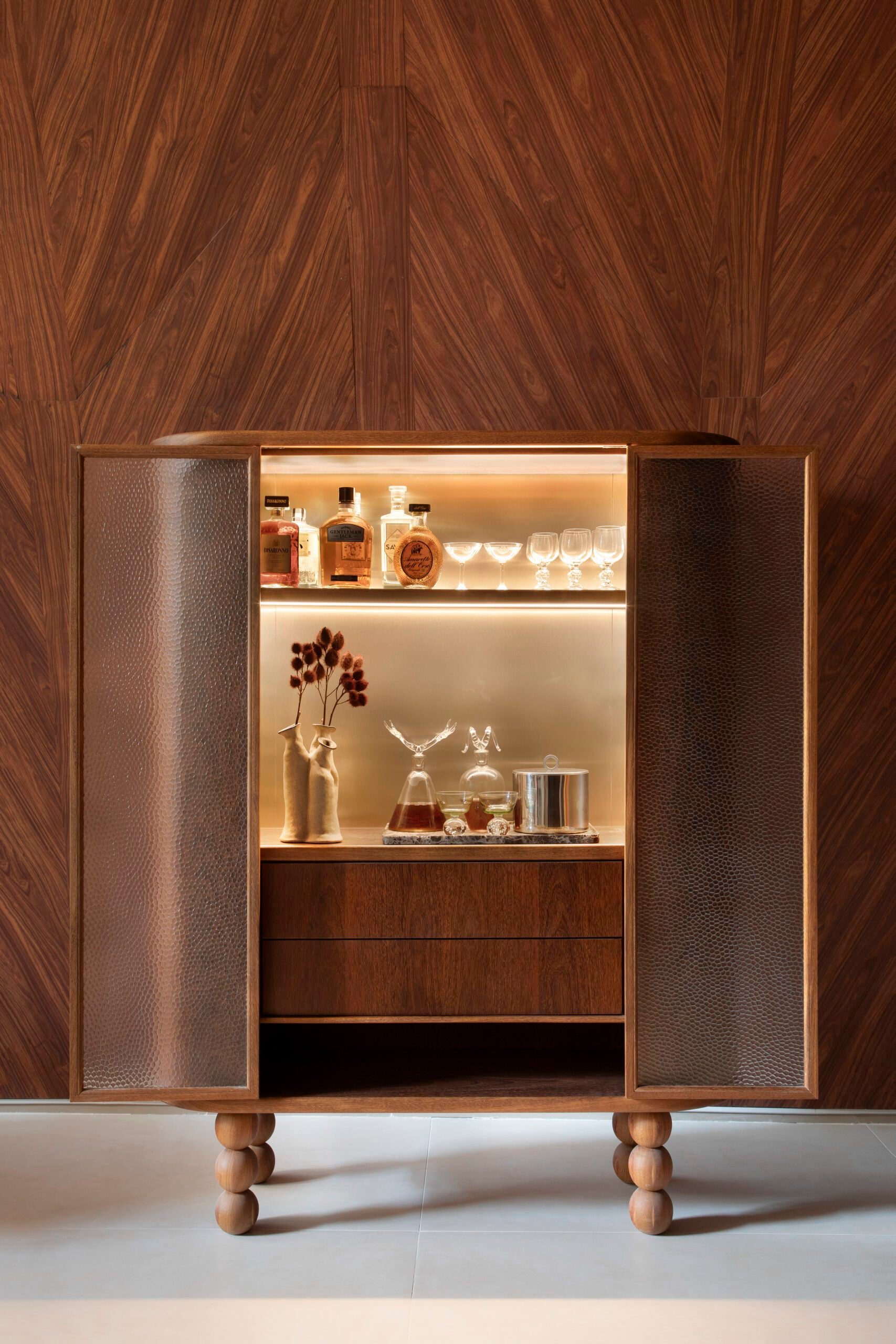 Versáteis, os armários multiúsos no estilo bar ganharam versões diferentes e criativas nos ambientes da CASACOR São Paulo. De madeira, com mármore ou com portas embutidas, as peças são verdadeiros coringas em salas de estar e jantar, mas também em quartos e até halls. São ideais para acomodarem taças e garrafas, memórias afetivas, adereços decorativos e muito mais.