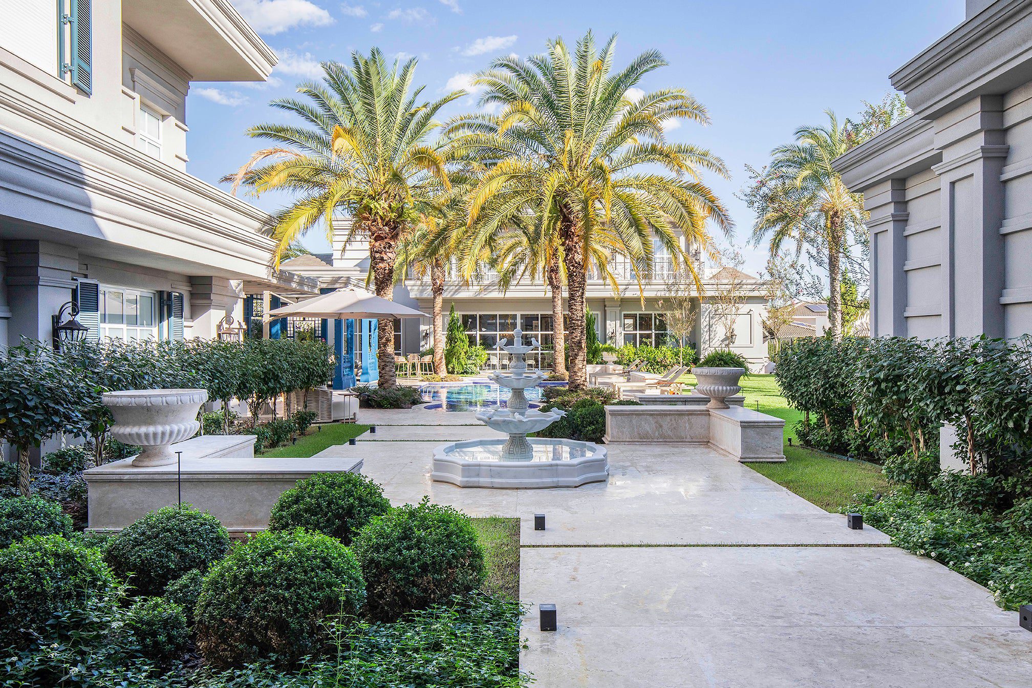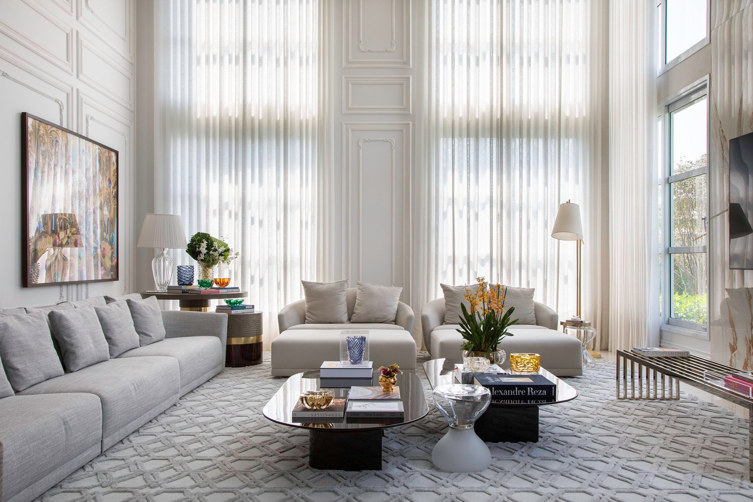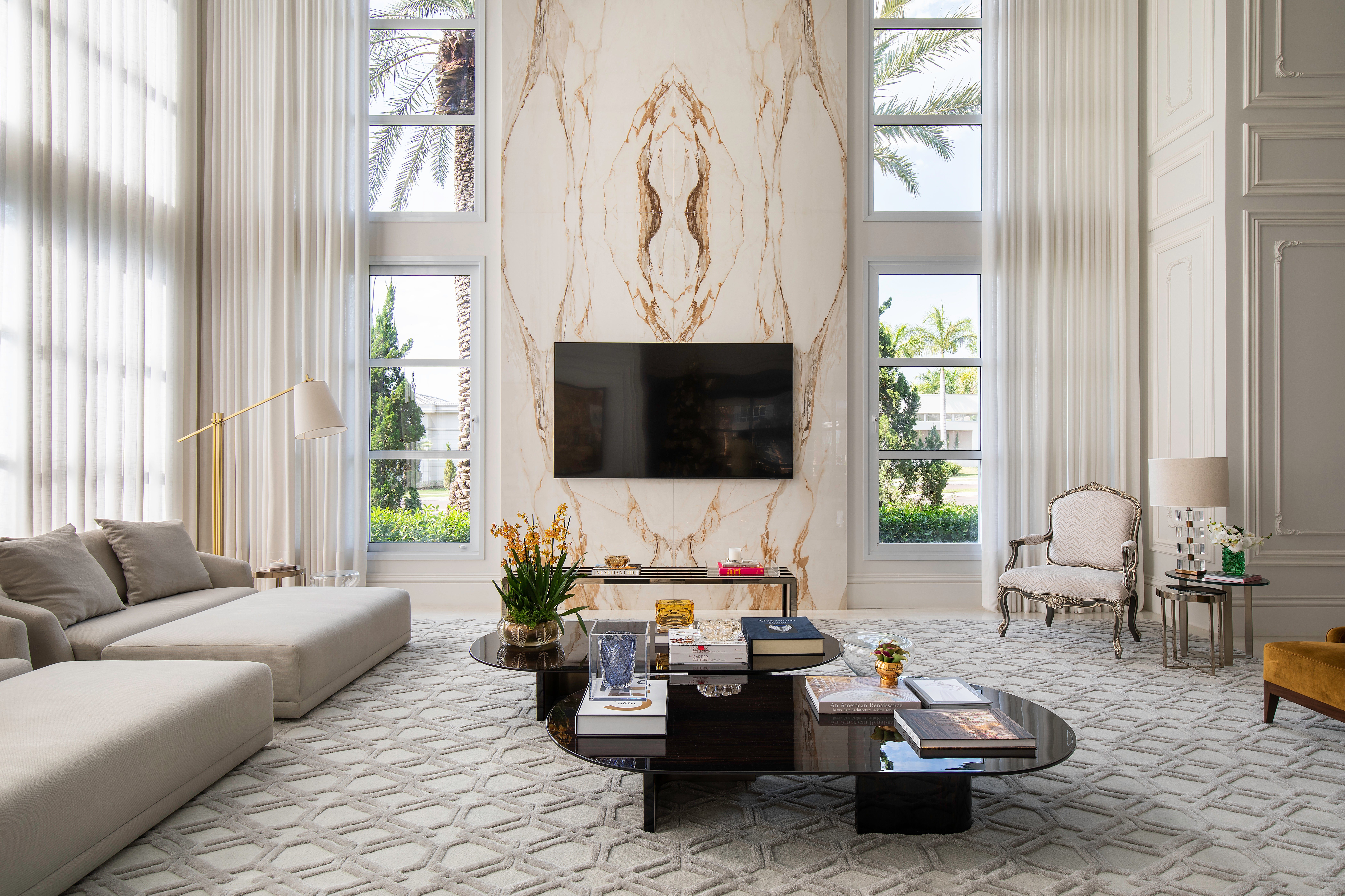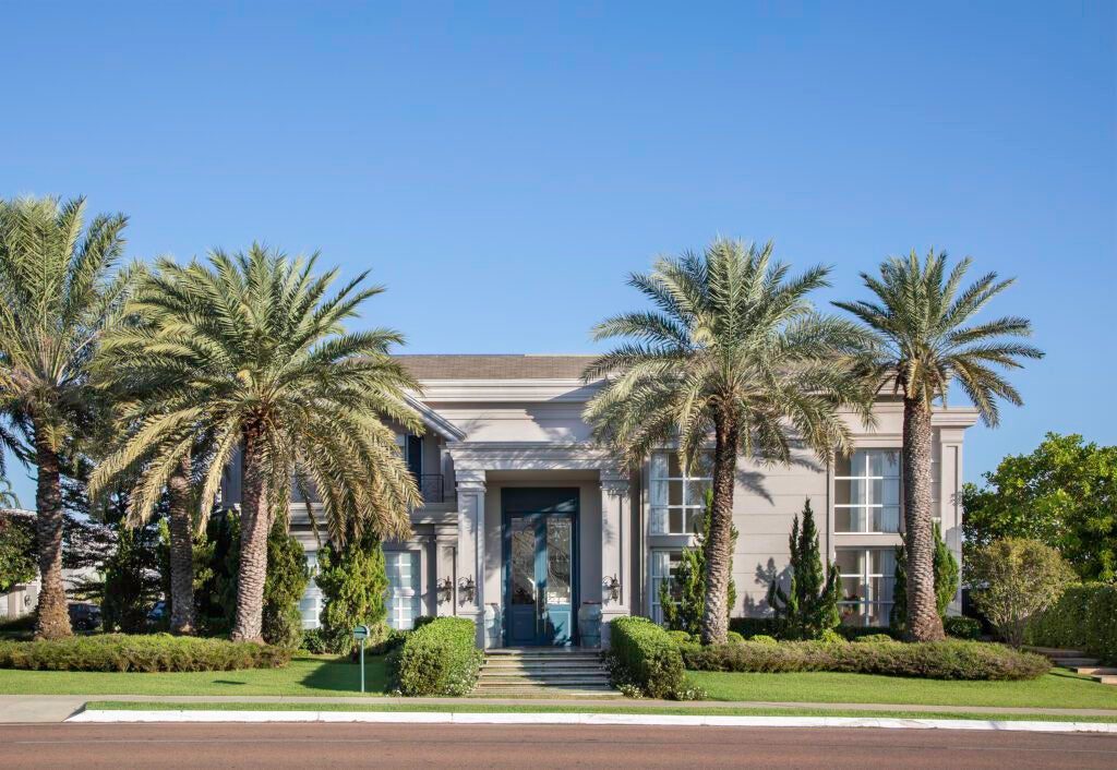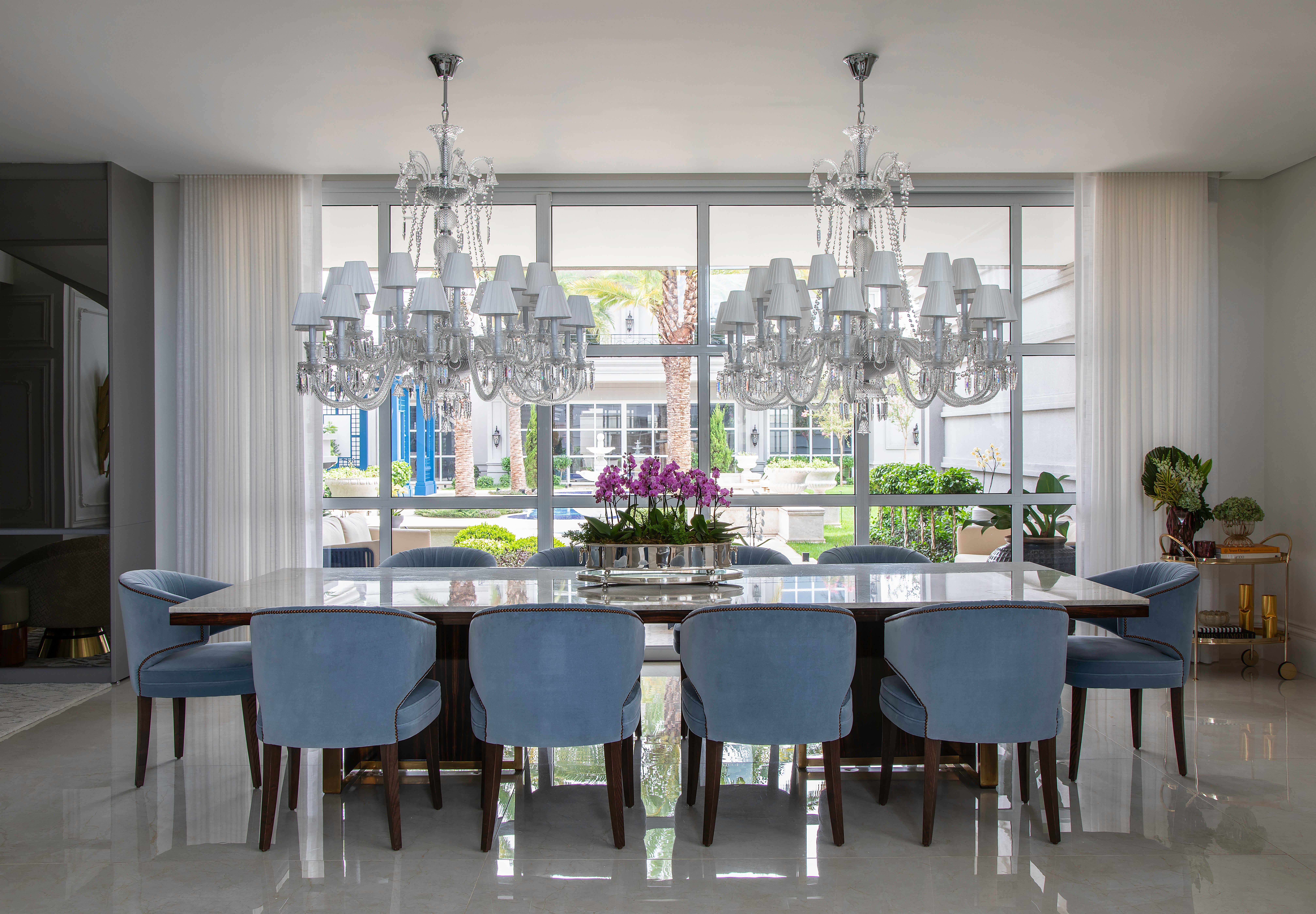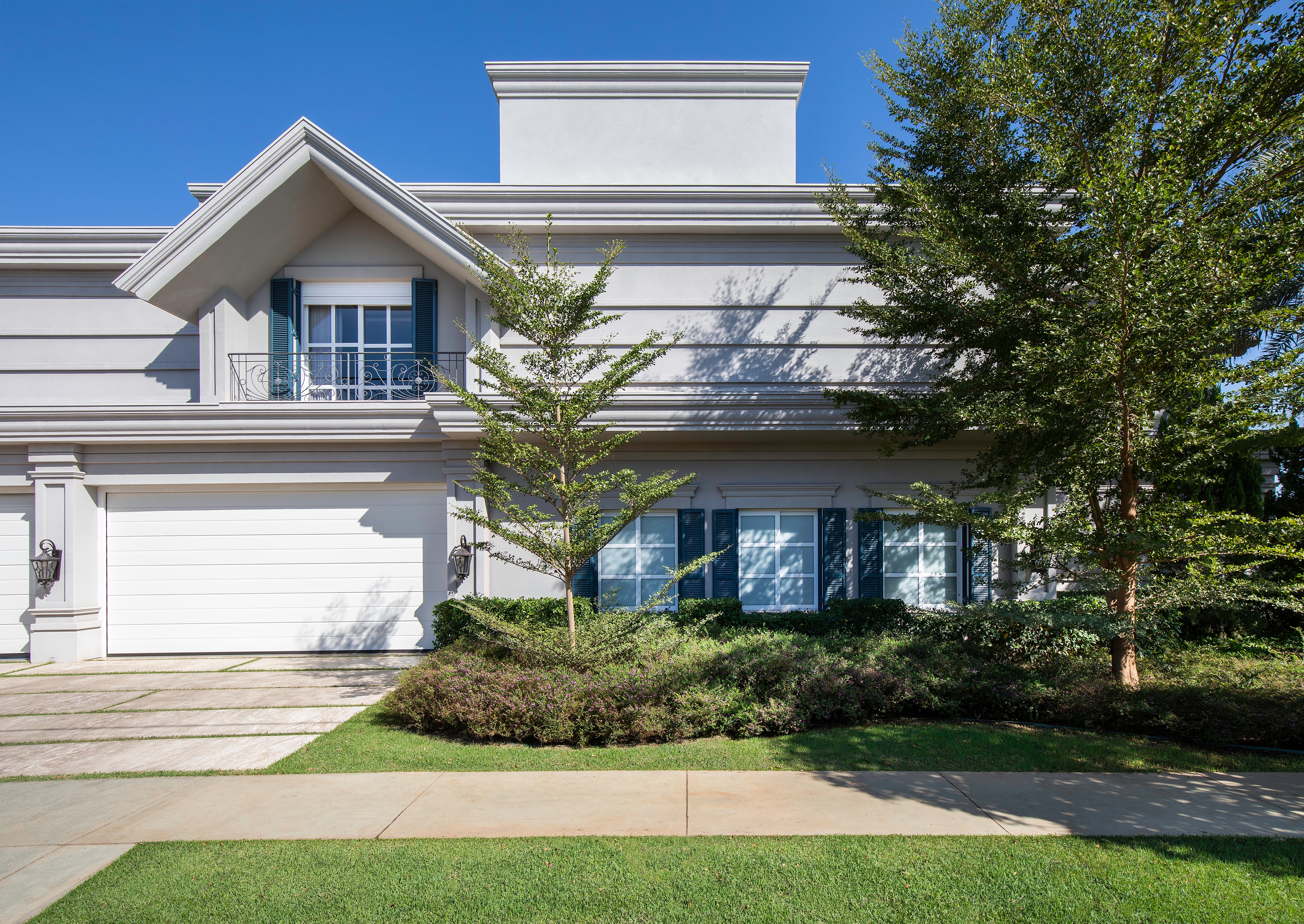 Misturando referências do clássico europeu ao frescor do moderno, a arquitetura revela fachadas ricamente detalhadas, enquanto os interiores apostam em uma elegância atemporal. O décor combina mobiliário nacional e importado, uma variedade de texturas em tapetes, tecidos e cortinas, nuances de azul e obras de arte contemporâneas, como a tela de Flávia Junqueira no living. É esse conjunto que compõe o estilo que a arquiteta Ilana Santiago define como um “clássico rejuvenescido, despretensioso”.
