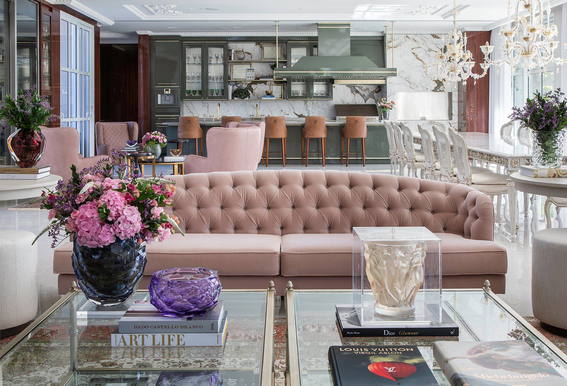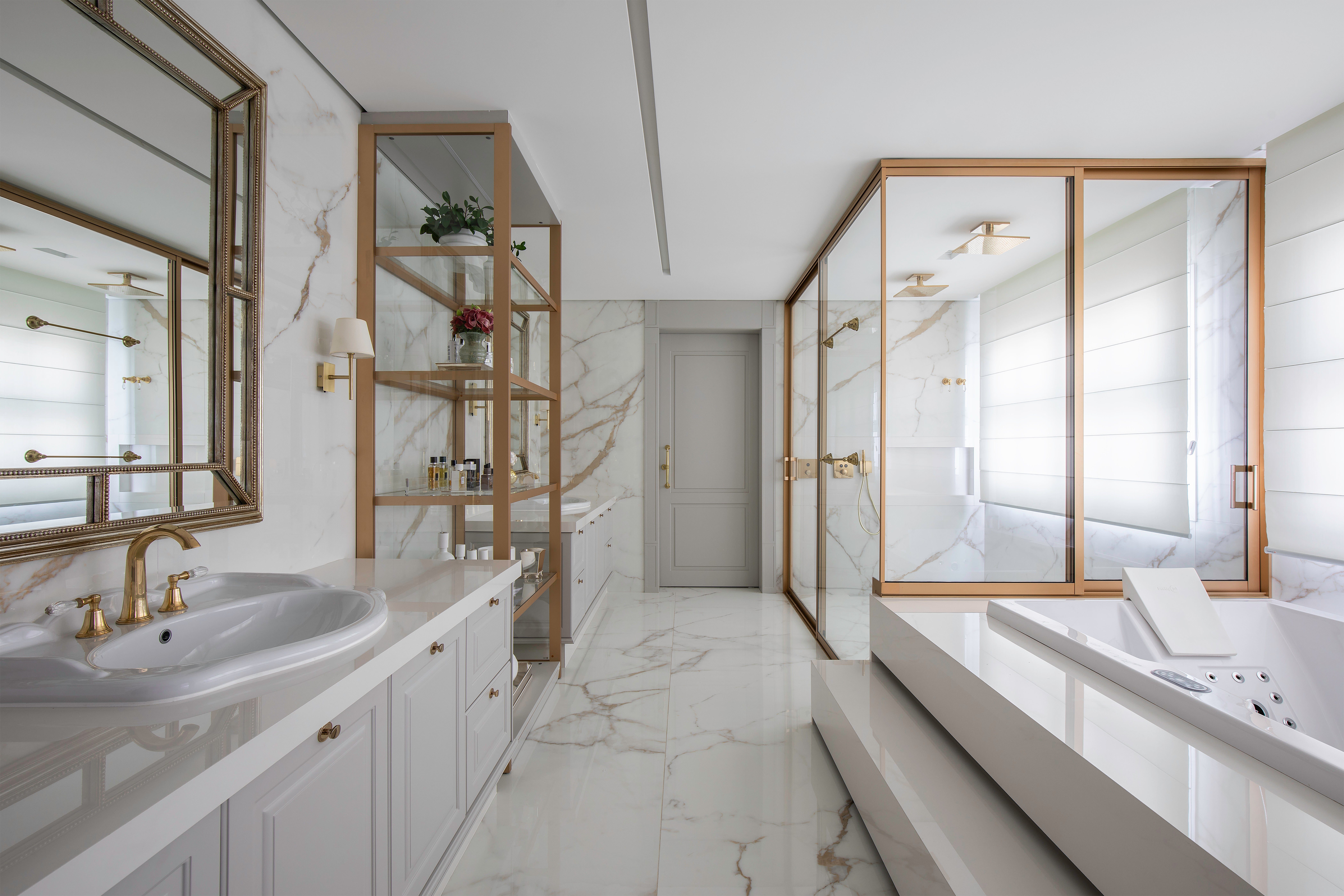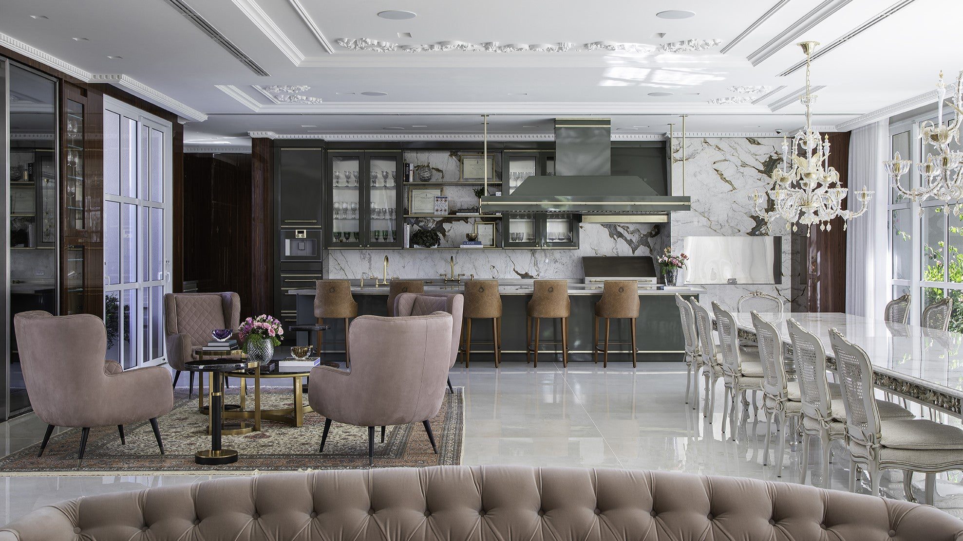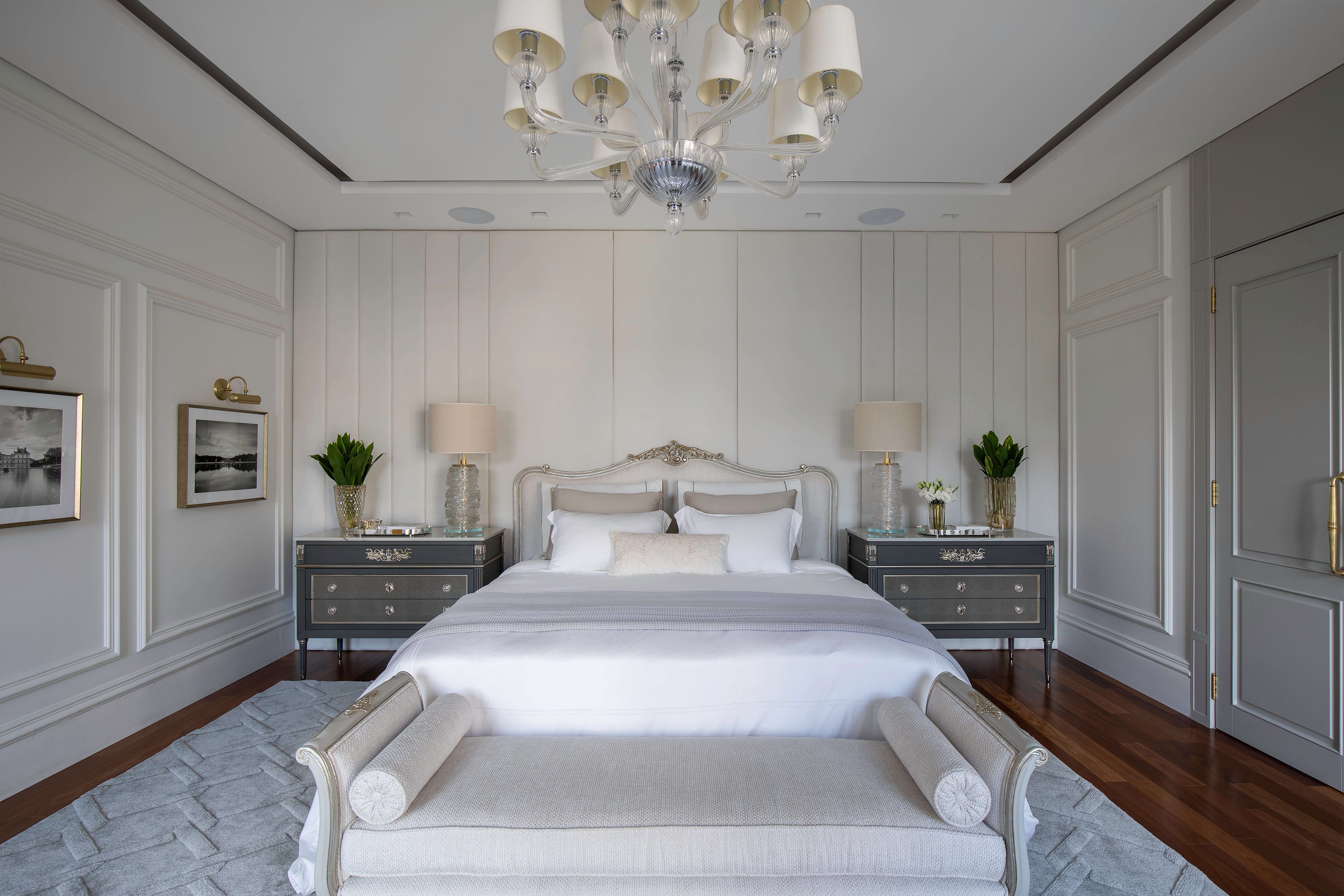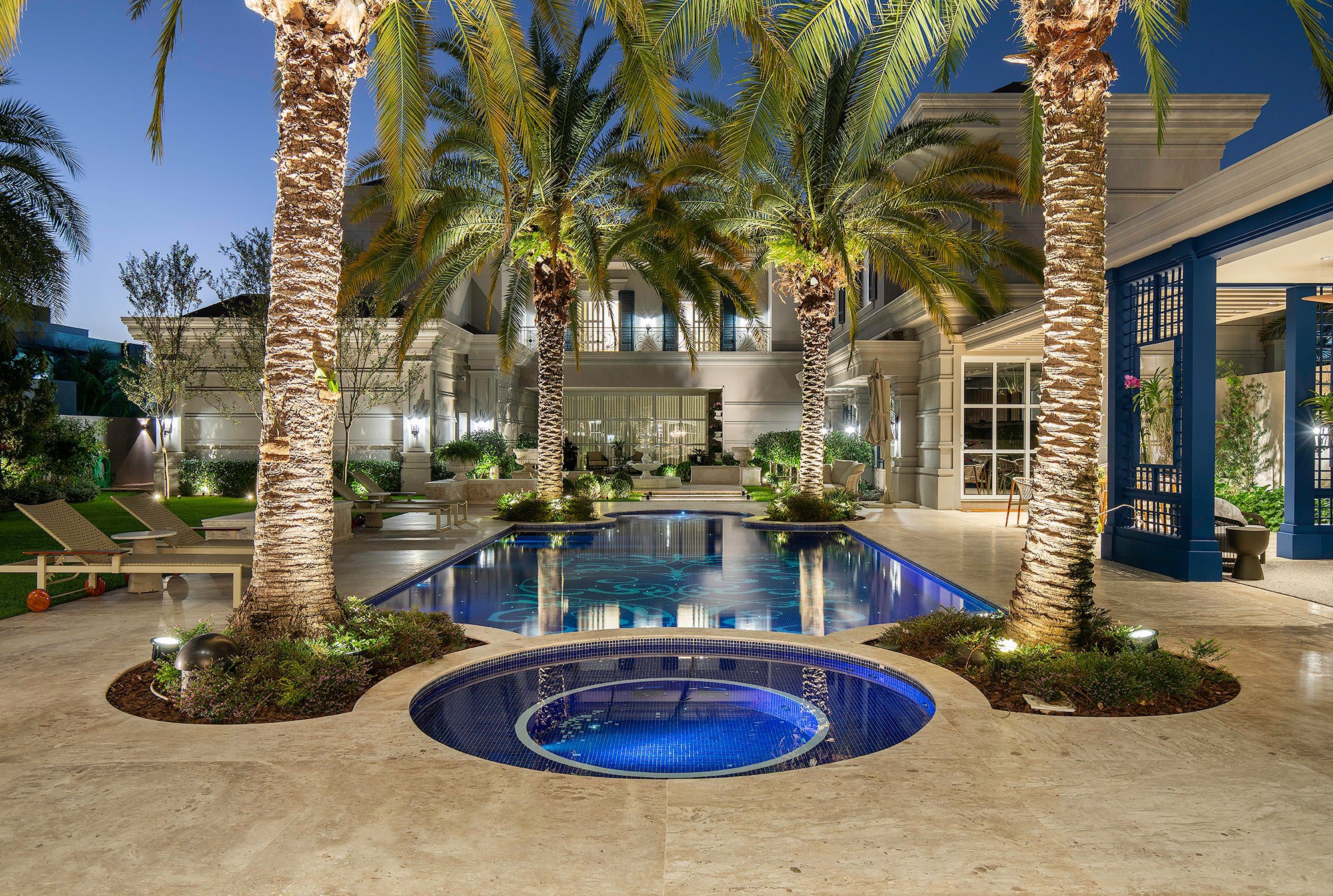 Misturando referências do clássico europeu ao frescor do moderno, a arquitetura revela fachadas ricamente detalhadas, enquanto os interiores apostam em uma elegância atemporal. O décor combina mobiliário nacional e importado, uma variedade de texturas em tapetes, tecidos e cortinas, nuances de azul e obras de arte contemporâneas, como a tela de Flávia Junqueira no living. É esse conjunto que compõe o estilo que a arquiteta Ilana Santiago define como um “clássico rejuvenescido, despretensioso”.