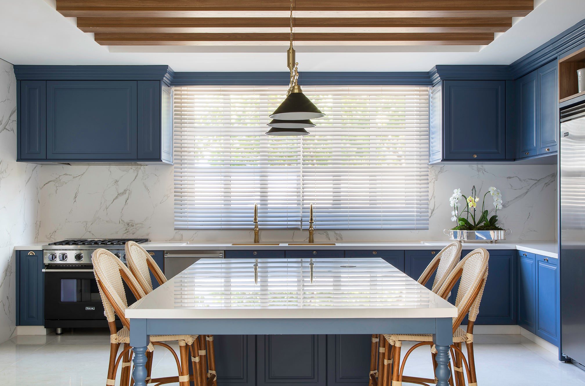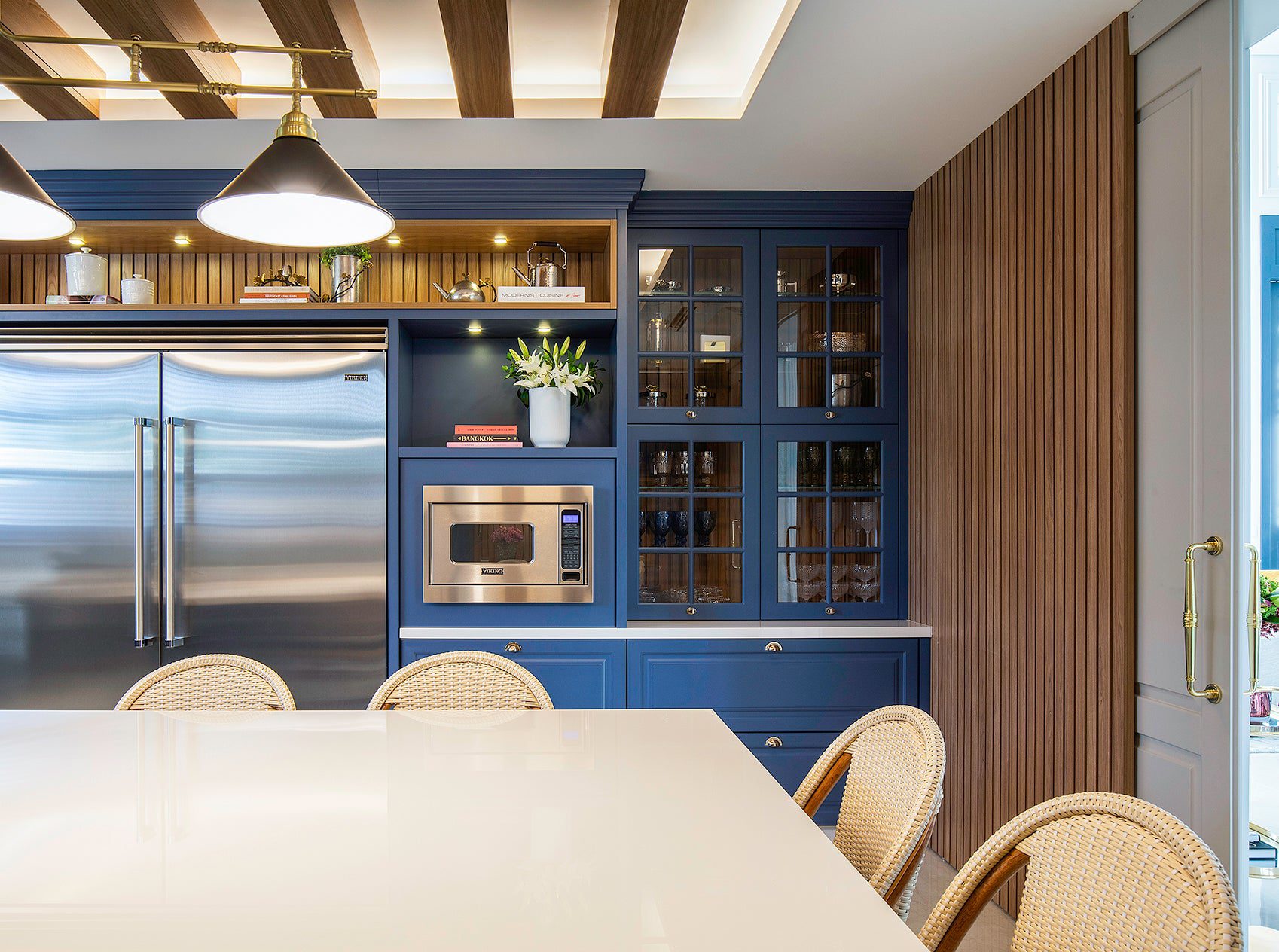 No anexo construído do outro lado da piscina, tudo muda de clima. Nasce o espaço gourmet inspirado na temporada em que a moradora estudou na Le Cordon Bleu, em Paris. Ali, a cozinha assinada pelo L’Atelier de Paris Haute Design é o grande destaque, com bancadas e armários em inox que convivem com tapetes persas feitos sob medida e uma tela de Vik Muniz que recebe os convidados na entrada independente. “Tudo nessa cozinha é muito especial”, reforça a arquiteta.
