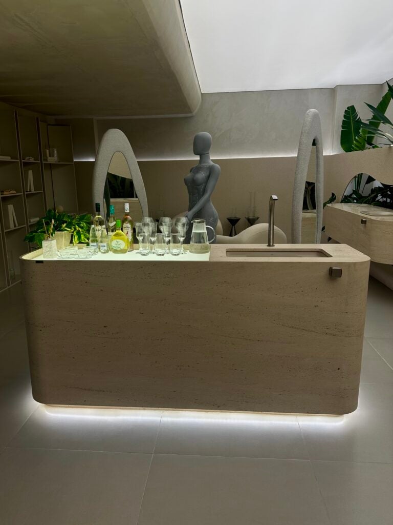 Móveis com traço simples, porém orgânico, parecem flutuar no ambiente fluido. A paleta neutra e os volumes arredondados dispensam distrações, convidando a um olhar mais atento ao espaço, ao outro, a si mesmo. A instalação é quase minimalista, mas profundamente humana.