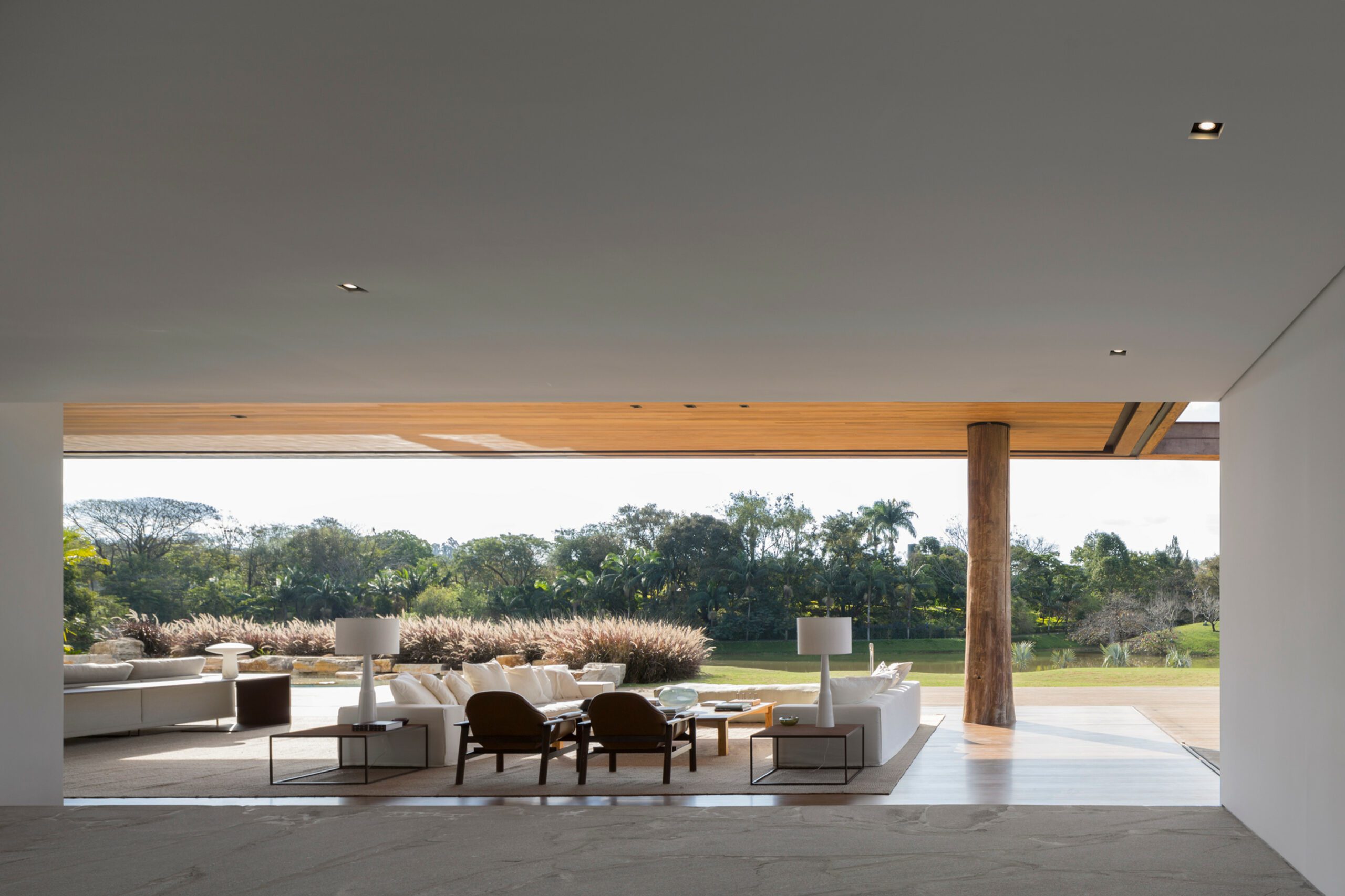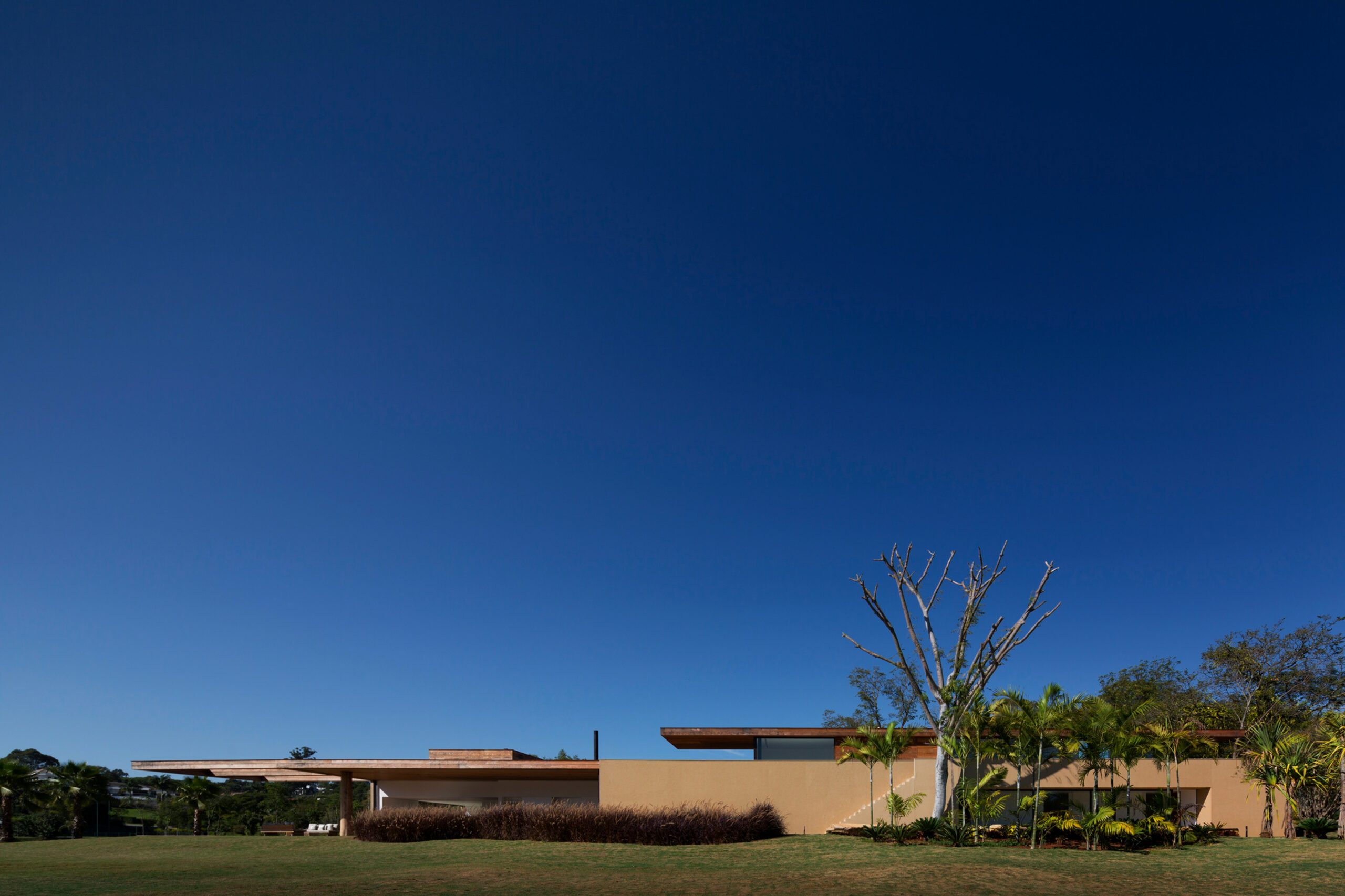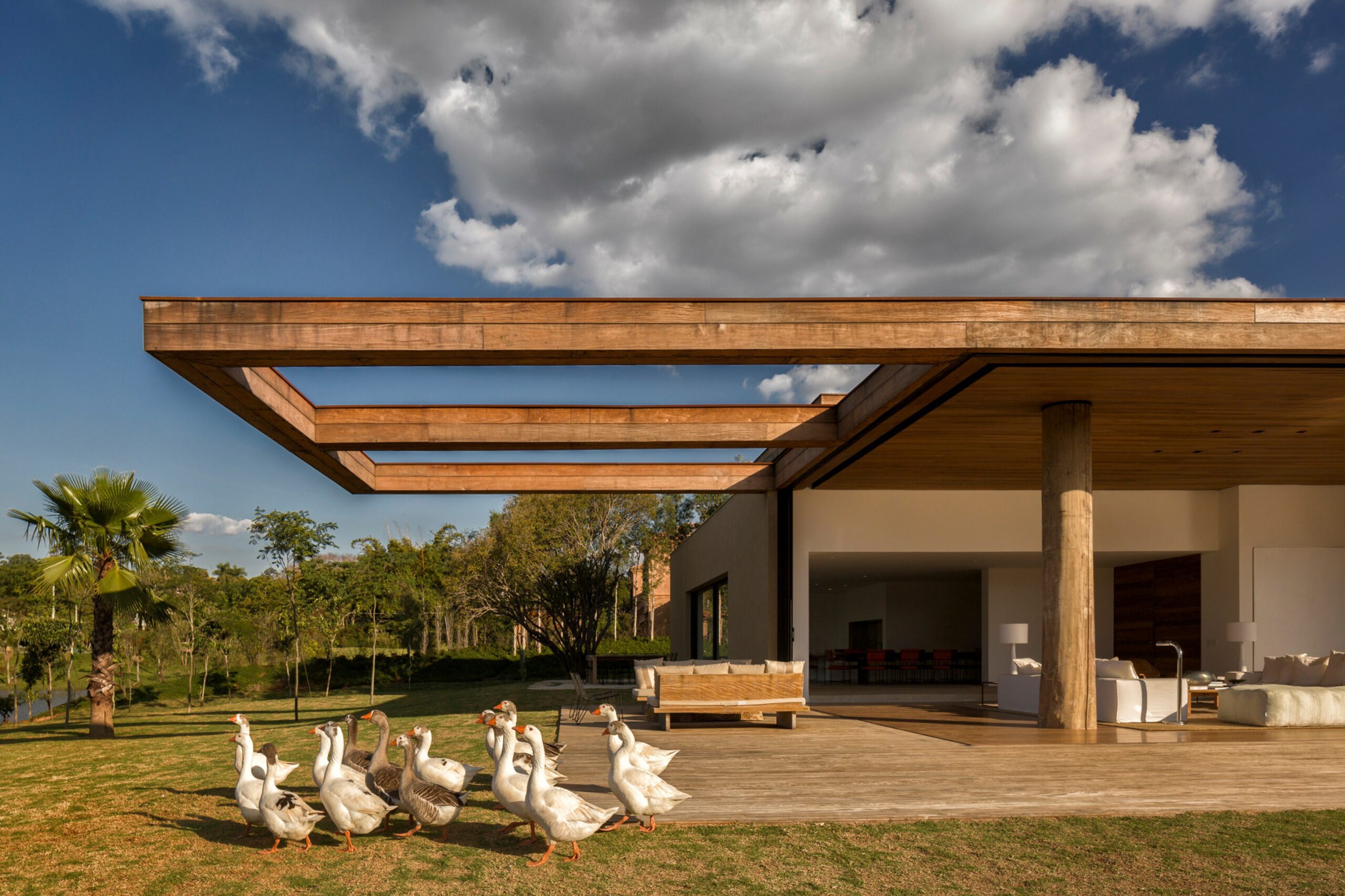 Com sua estrutura em forma de L, a casa integra-se sutilmente ao cenário, utilizando tintas derivadas de terra local para camuflar sua presença e respeitar a estética natural. A escolha de materiais como a madeira cumaru certificada e um sistema avançado de captação e reciclagem de água destaca o compromisso do projeto com a sustentabilidade ambiental, fazendo desta casa um exemplo de design responsável e consciente.
