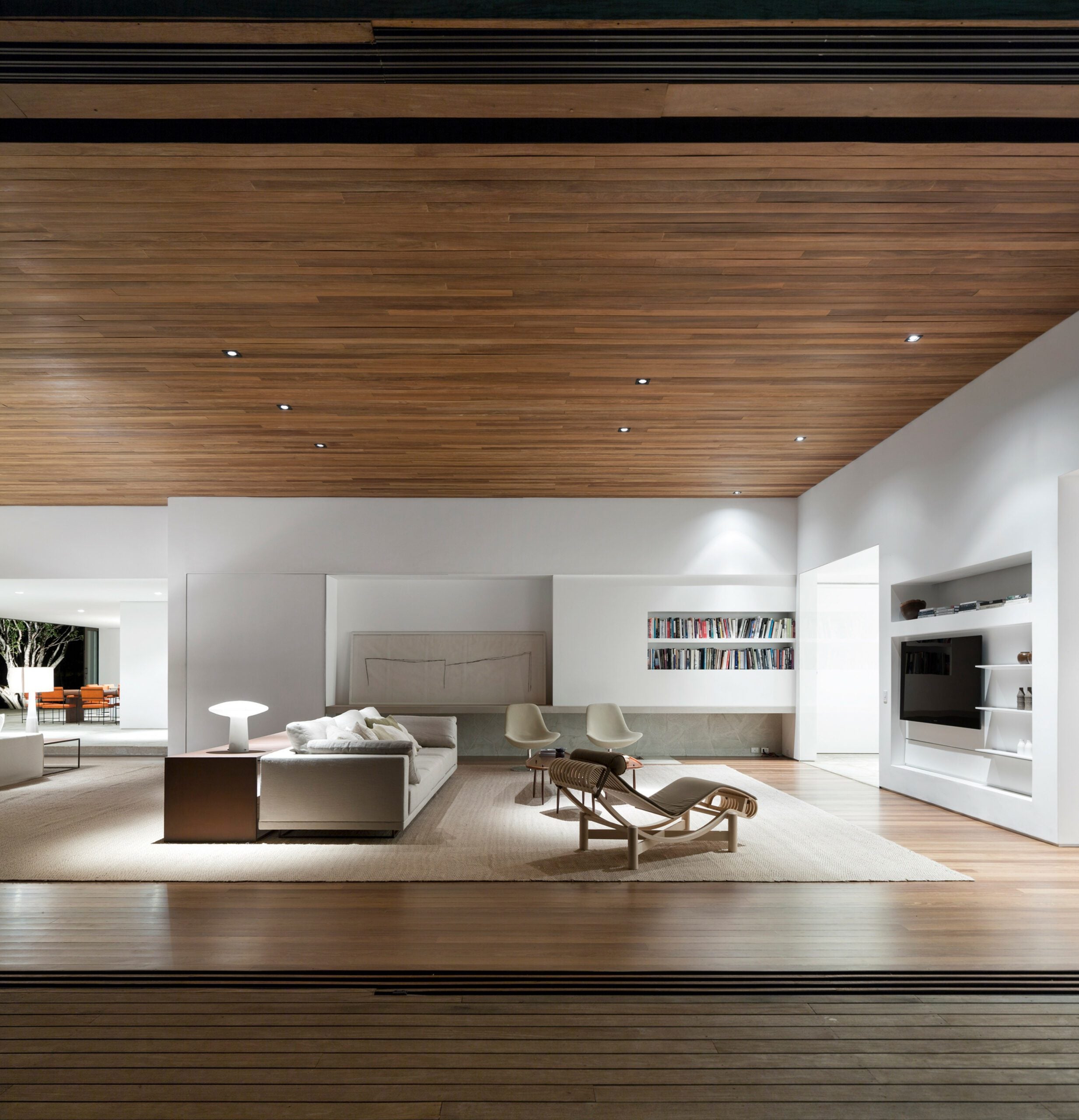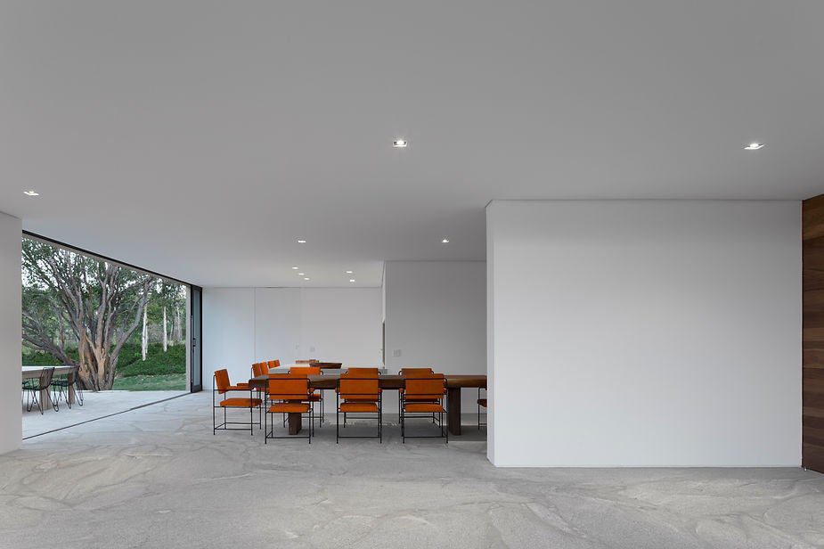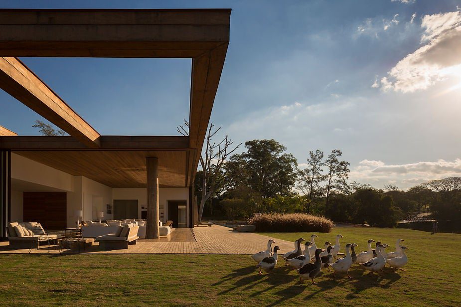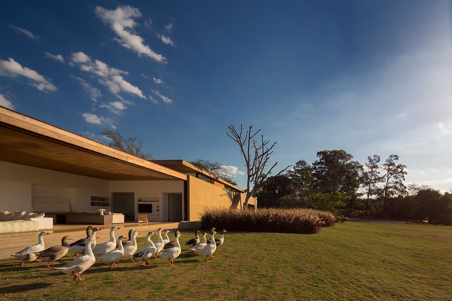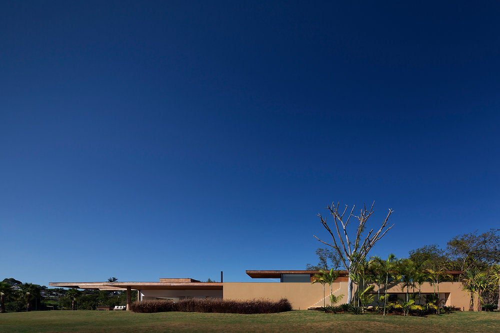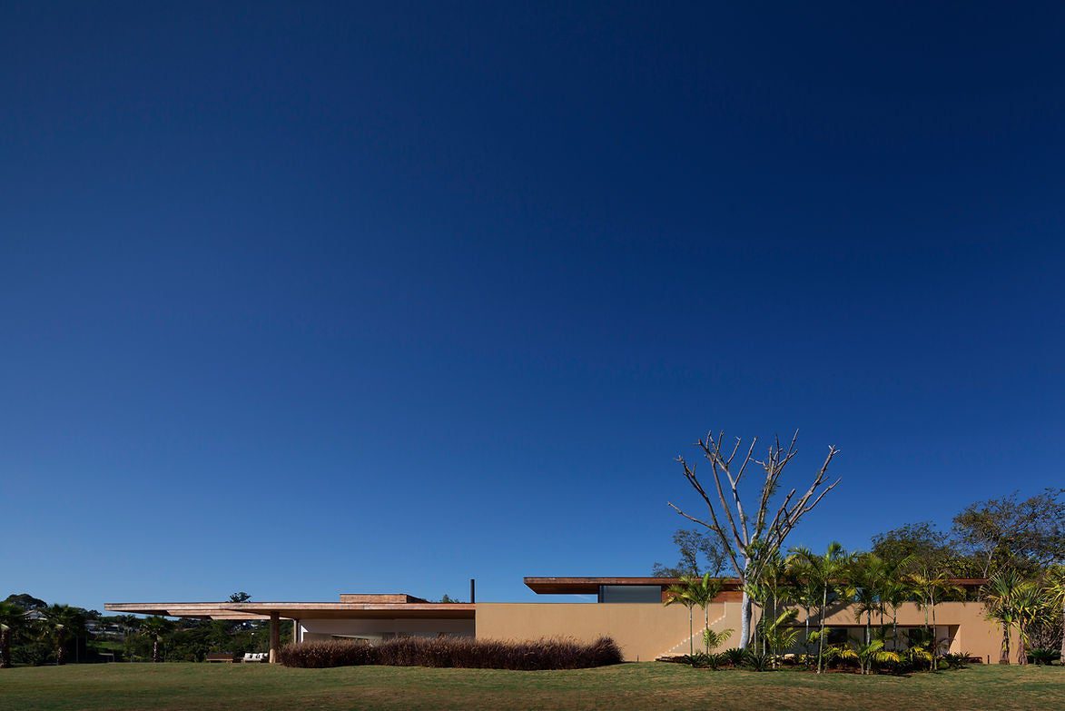 Com sua estrutura em forma de L, a casa integra-se sutilmente ao cenário, utilizando tintas derivadas de terra local para camuflar sua presença e respeitar a estética natural. A escolha de materiais como a madeira cumaru certificada e um sistema avançado de captação e reciclagem de água destaca o compromisso do projeto com a sustentabilidade ambiental, fazendo desta casa um exemplo de design responsável e consciente.