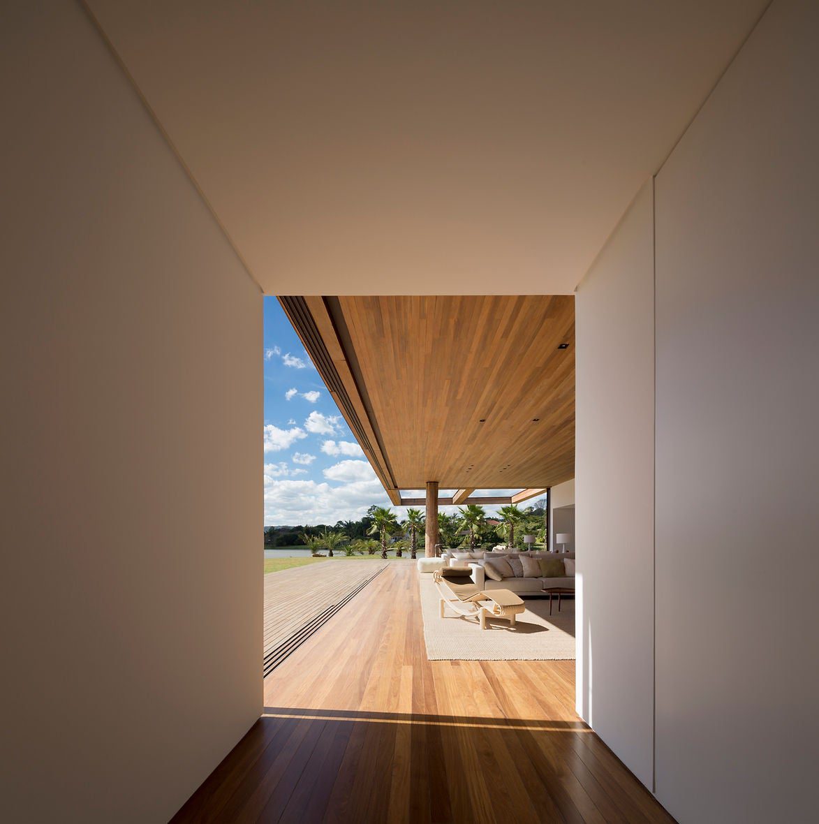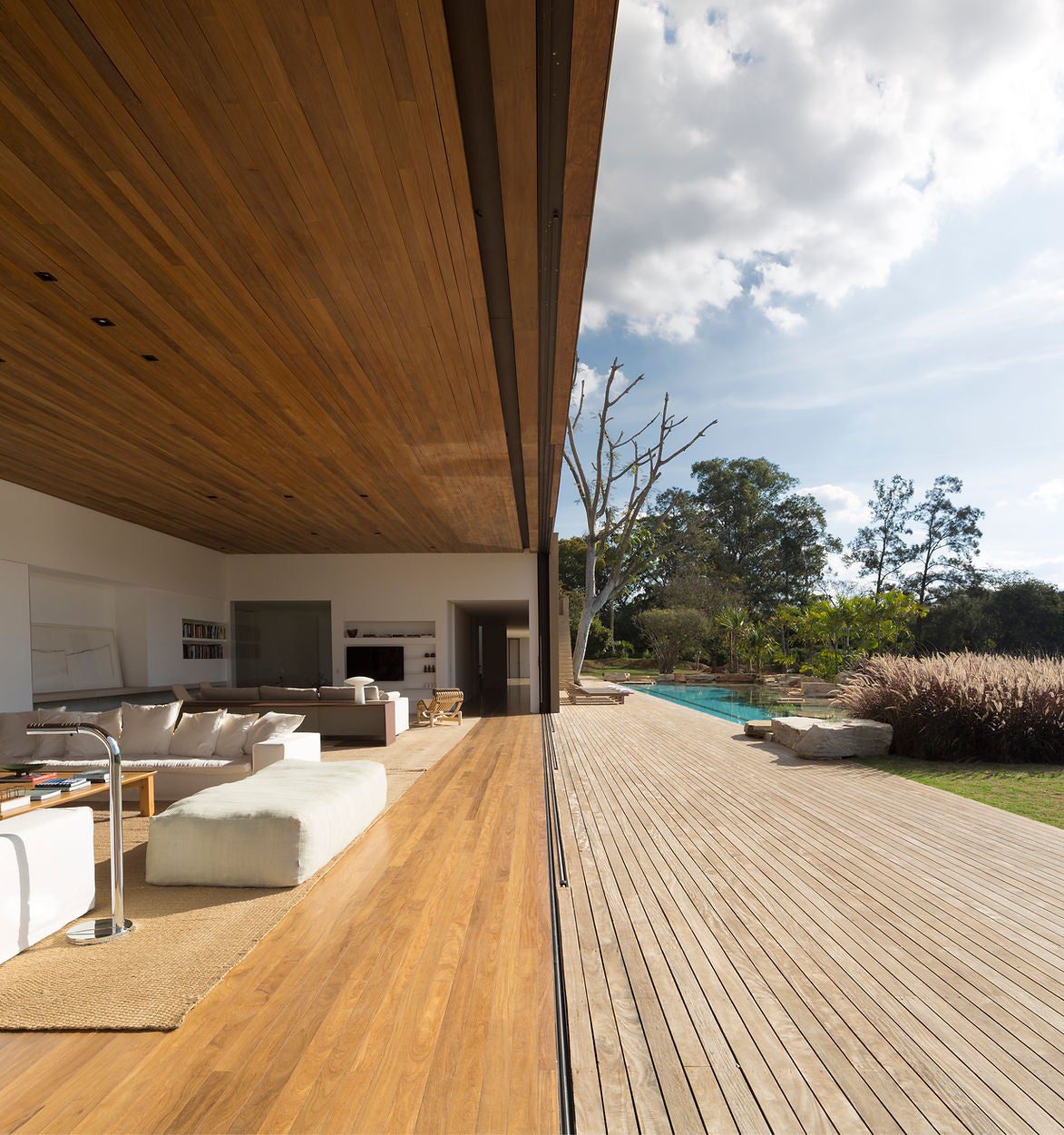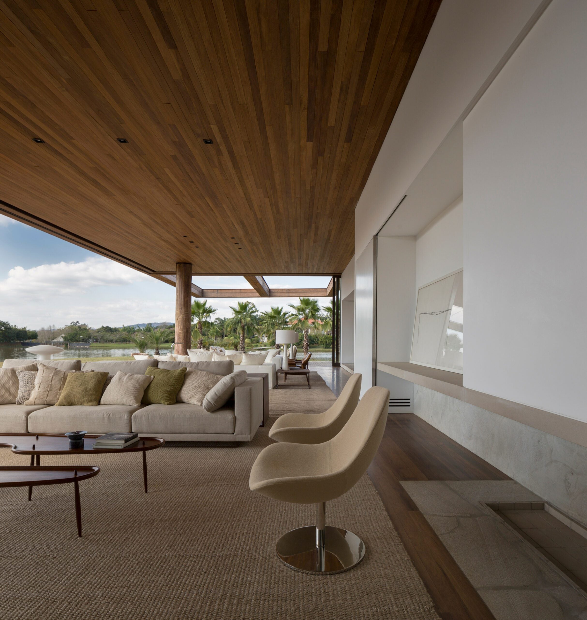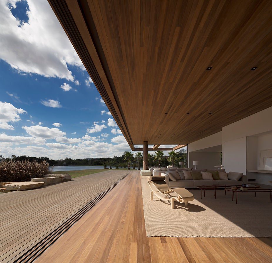 A orientação horizontal da construção maximiza as vistas panorâmicas do lago, estabelecendo uma conexão íntima com o entorno. Dentro da casa, a predominância de madeira e pedra em pisos e forros aquece os ambientes, promovendo uma sensação de aconchego que permeia a residência. A transição suave entre os espaços internos e externos é enfatizada pelo design que favorece a integração, como o piso de pedra que se estende do interior para o exterior, mesclando-se naturalmente com o gramado e o deck da piscina.