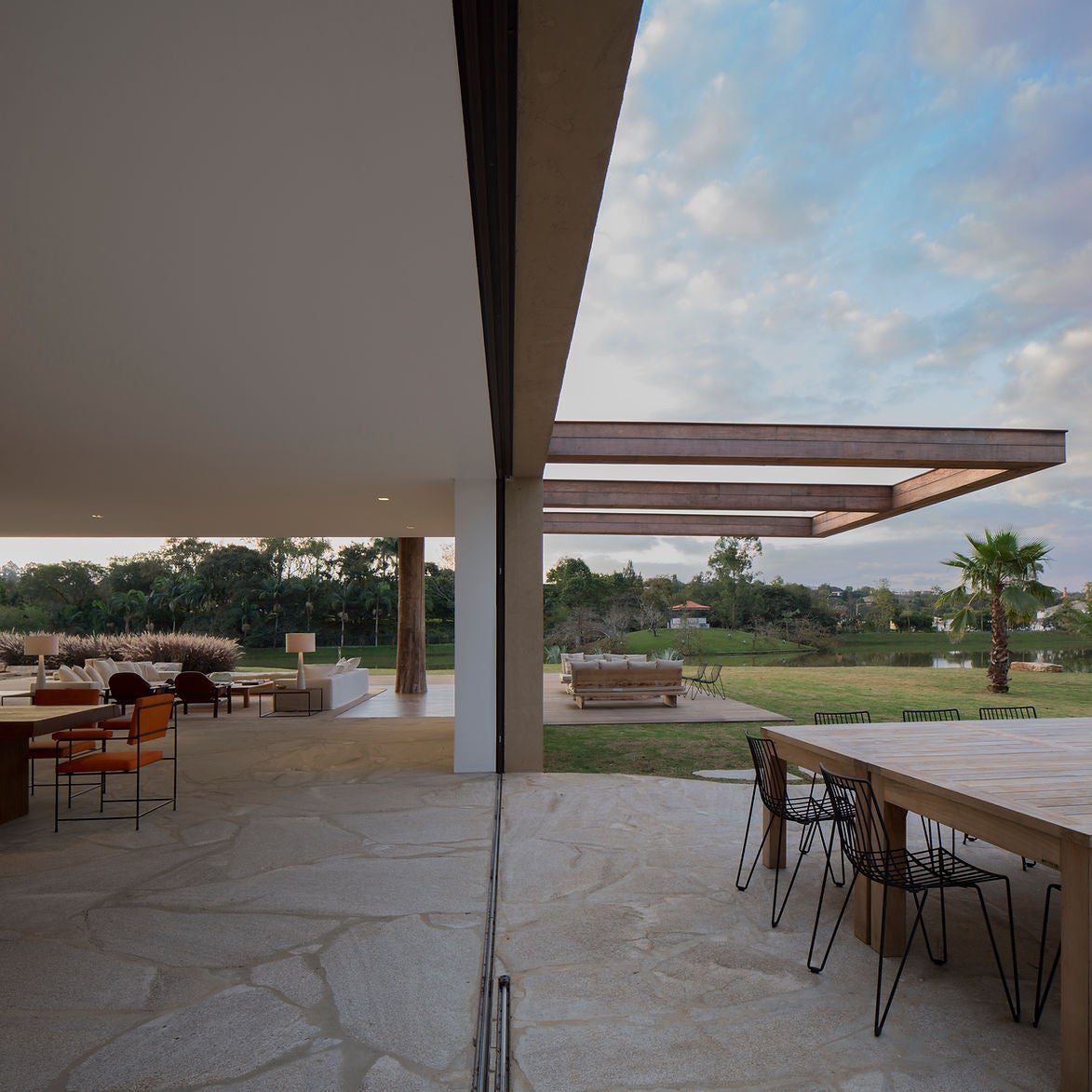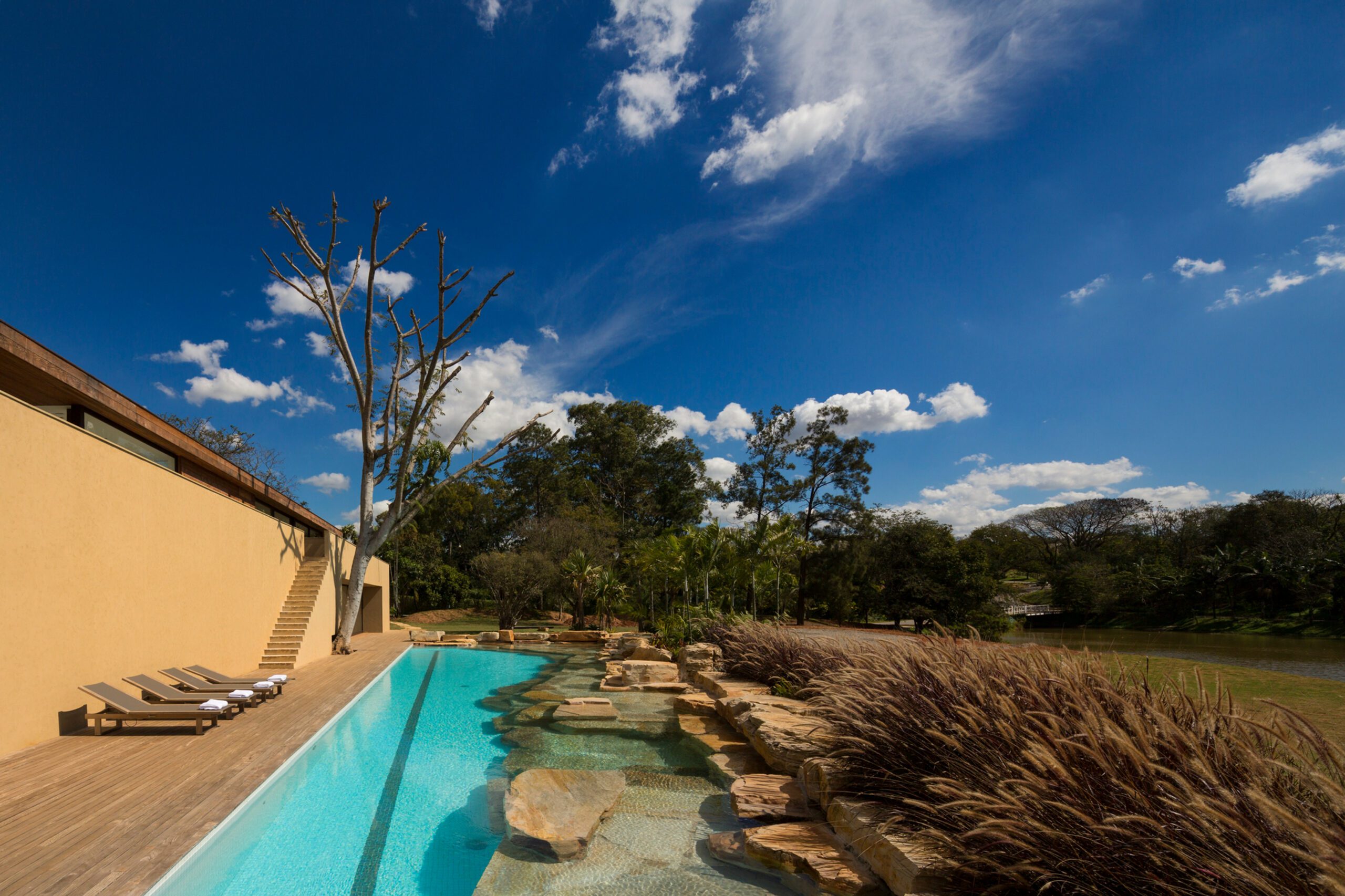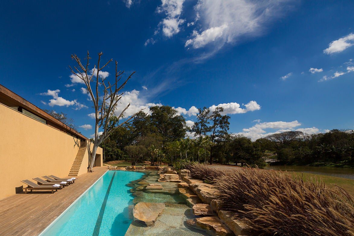 O terraço adicional oferece um cenário encantador para refeições ao ar livre, complementando o estilo de vida integrado à natureza que esta casa promove. A piscina de raia, alinhada com o lago, e cercada por rochas e um paisagismo meticuloso de Luiz Carlos Orsini, convida à reflexão e ao relaxamento, proporcionando um retiro idílico dentro da própria propriedade.