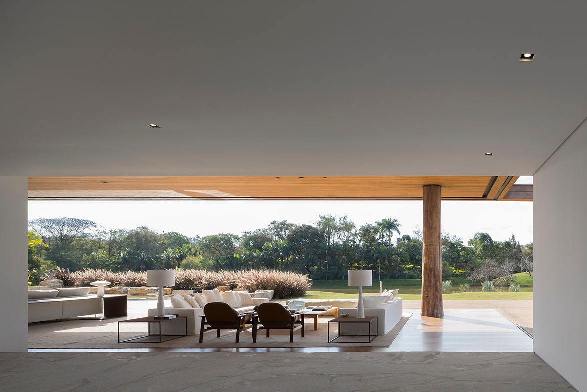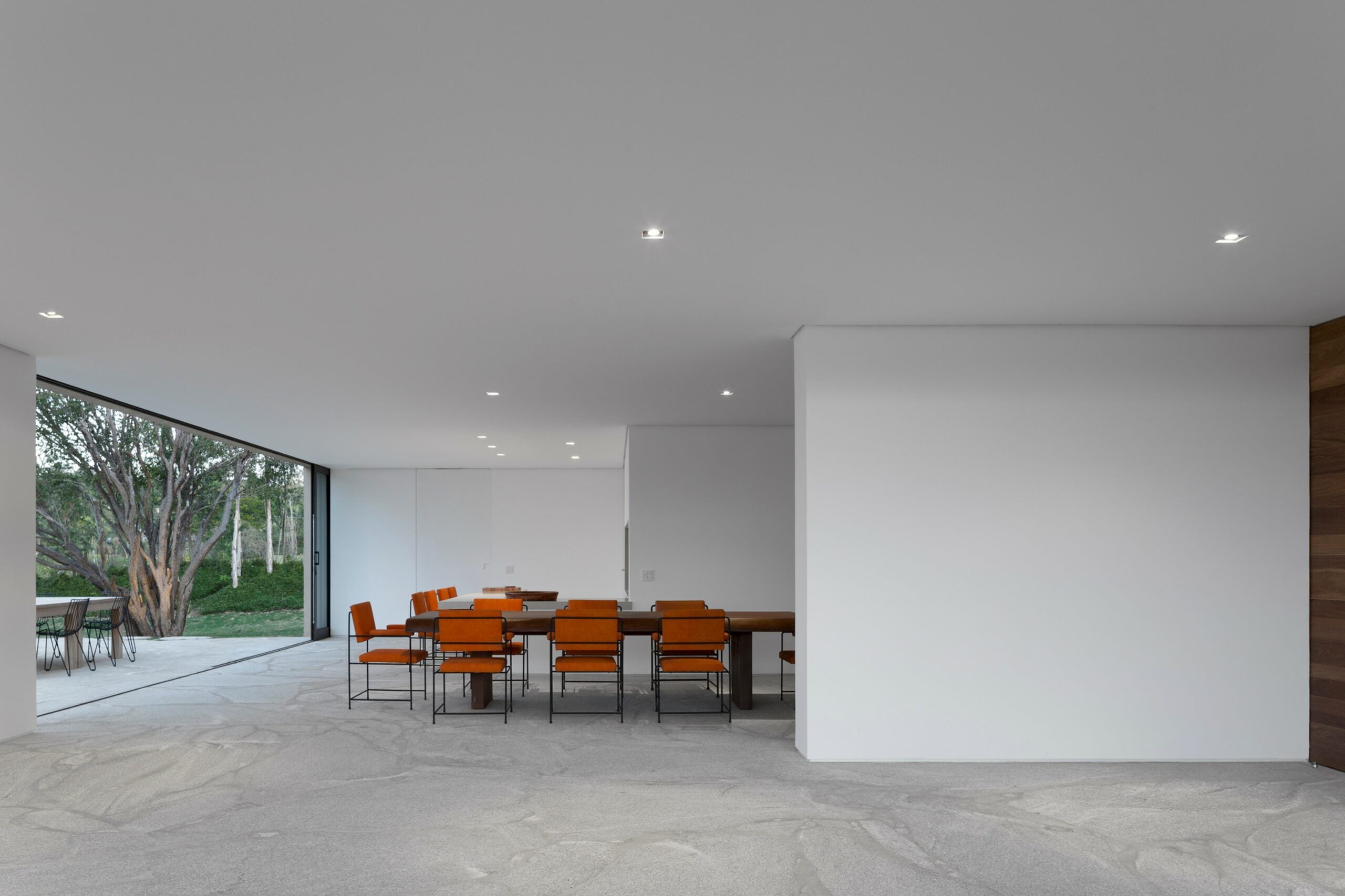 A residência é composta por dois volumes principais: o primeiro abriga a área social e de lazer, enquanto o segundo, mais reservado, é dedicado aos espaços de jantar e estar. O paisagismo, assinado por Luiz Carlos Orsini, enriquece o ambiente com tamareiras e cicas, criando um véu de privacidade e integrando organicamente a casa à natureza circundante.