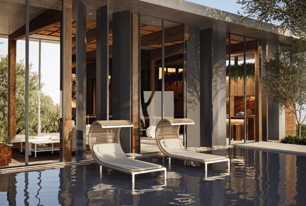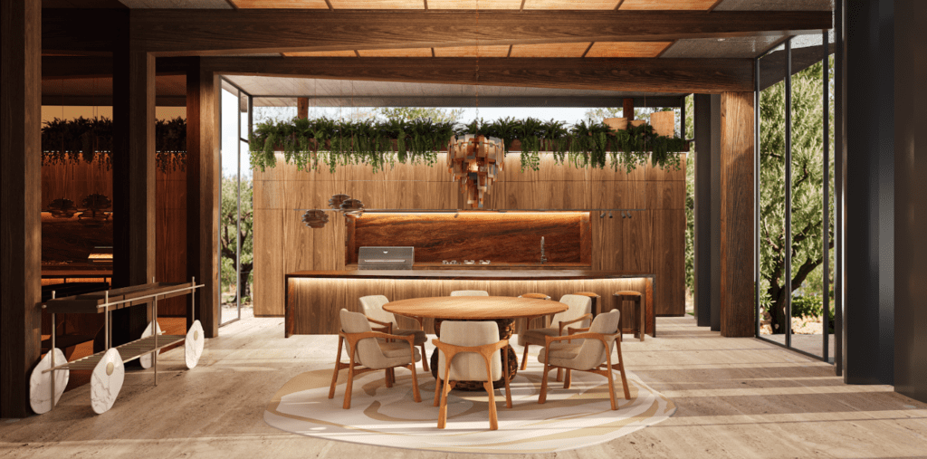O ambiente ainda é complementado pelo Aparador Balha, do estúdio Sá RiVá, em pedra e madeira; pelas Cadeiras Mira; pelas Mesas de Centro Junco; pela Chaise Nalu, de Linda Martins; e pelas Banquetas Disco, assinadas por Caio e Carlos Carvalho. A combinação desses elementos resulta em um espaço versátil, de atmosfera rústico-moderna, que traduz a harmonia entre madeira, pedra e aço.