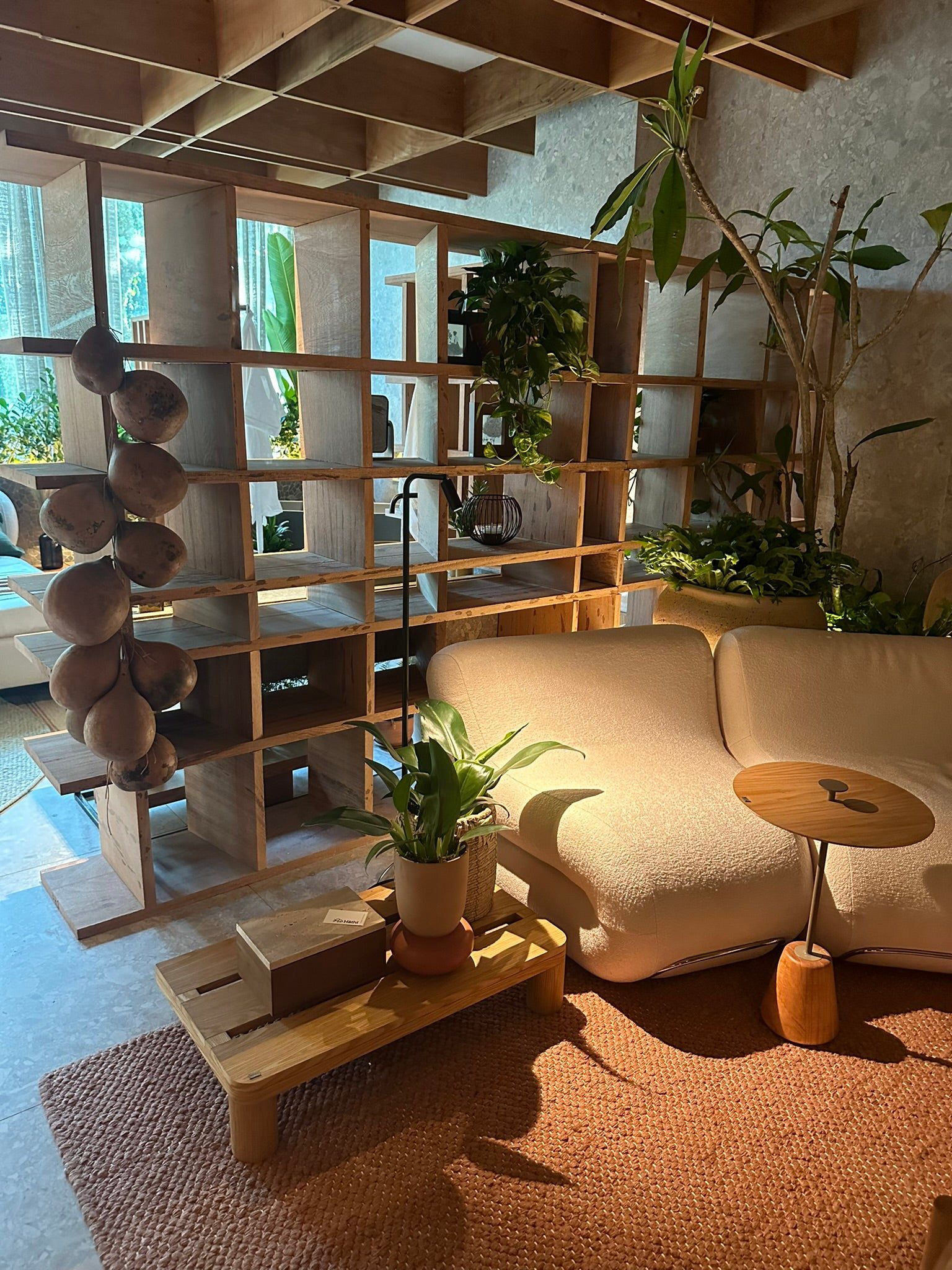 O ambiente ainda é complementado pelo Aparador Balha, do estúdio Sá RiVá, em pedra e madeira; pelas Cadeiras Mira; pelas Mesas de Centro Junco; pela Chaise Nalu, de Linda Martins; e pelas Banquetas Disco, assinadas por Caio e Carlos Carvalho. A combinação desses elementos resulta em um espaço versátil, de atmosfera rústico-moderna, que traduz a harmonia entre madeira, pedra e aço.