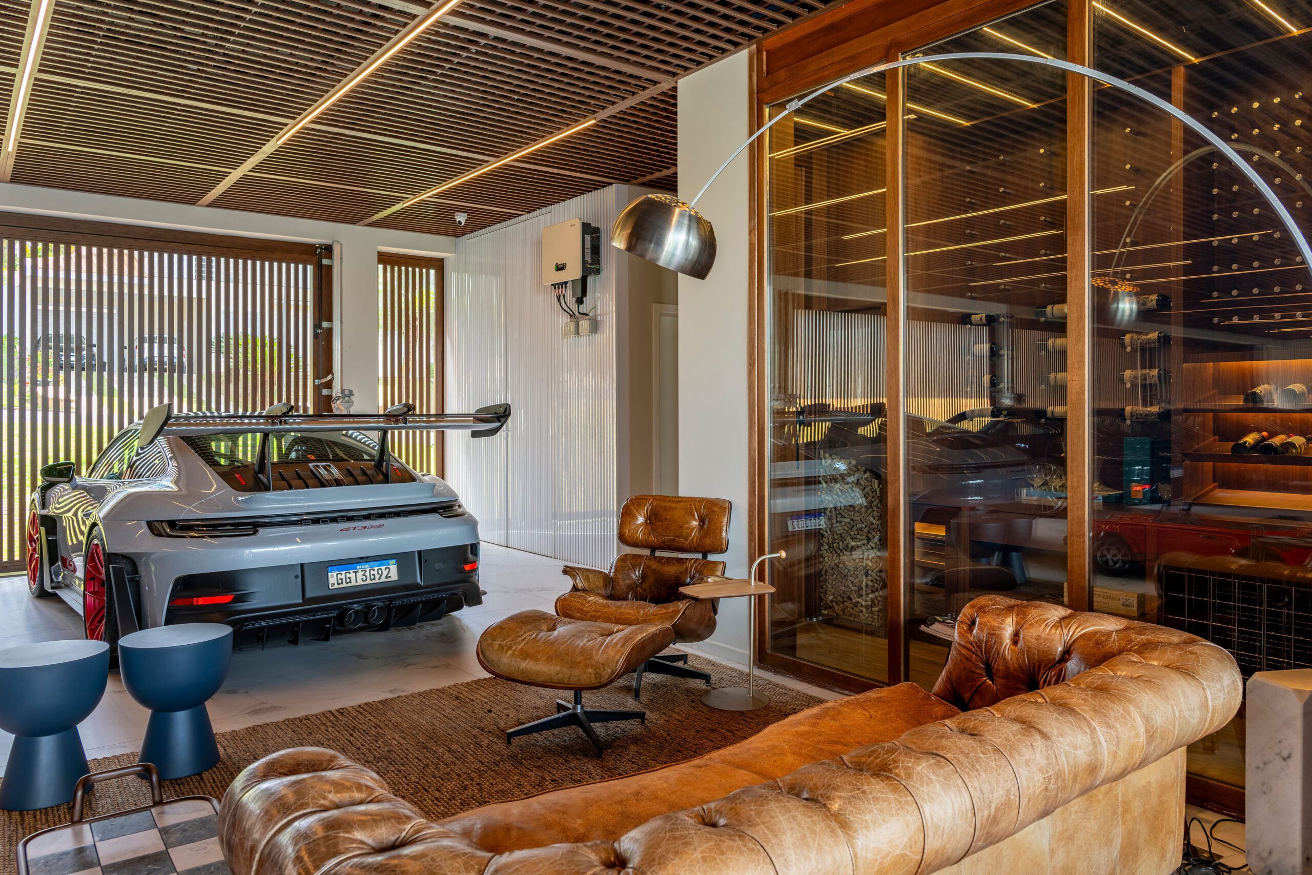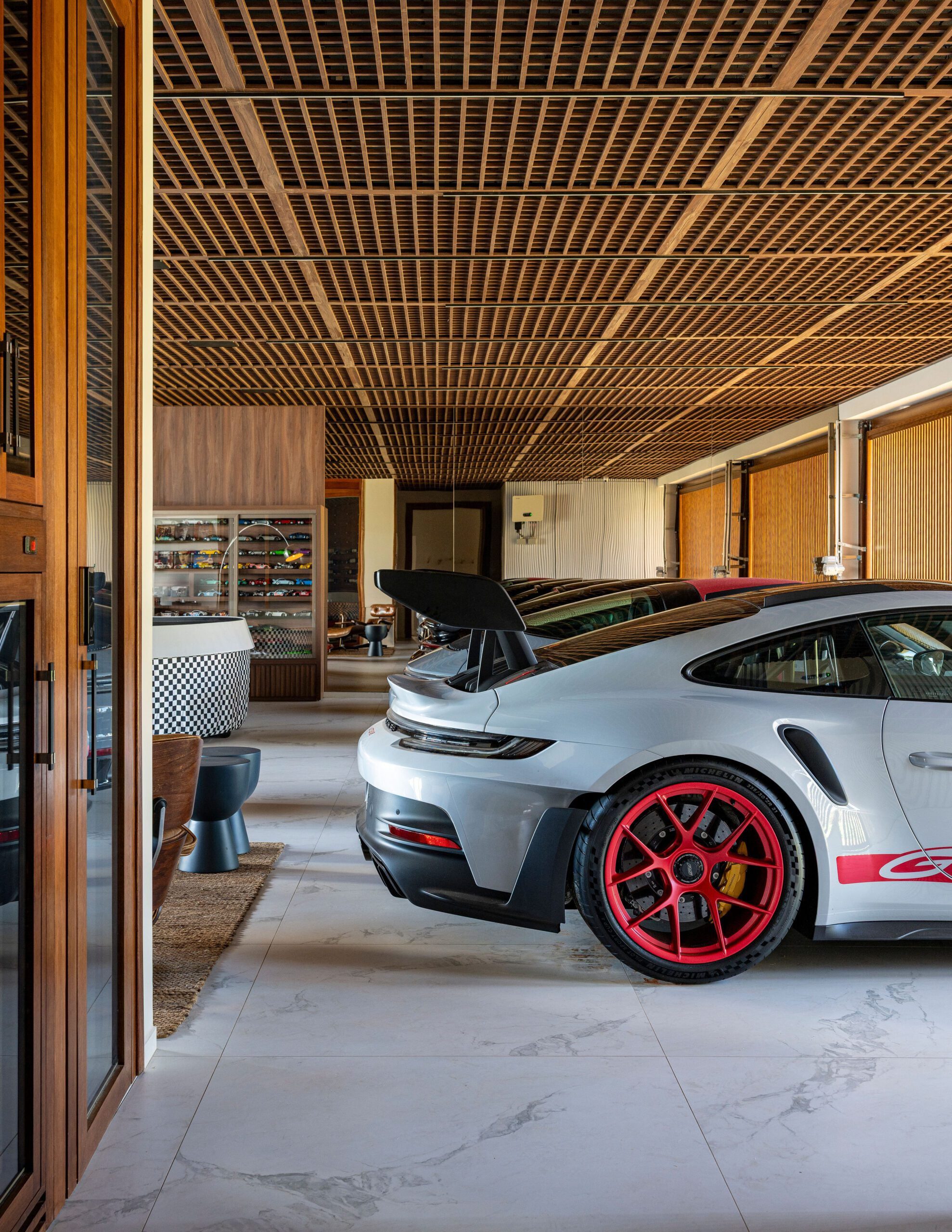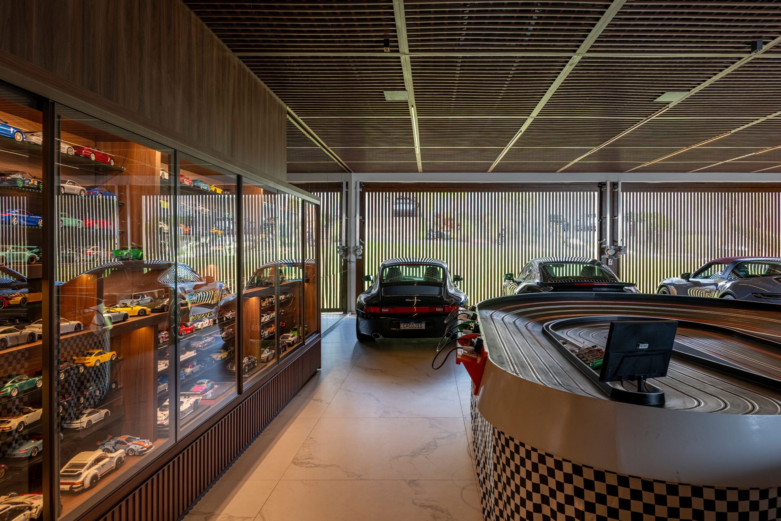 A garagem, porém, foi além da função convencional. Projetada para abrigar a coleção de Porsches da família, incluindo veículos reais e miniaturas, ela se tornou também um ambiente de lazer e identidade. Sinuca, pingue-pongue e um autorama profissional transformam o espaço em um núcleo de diversão e memória afetiva.