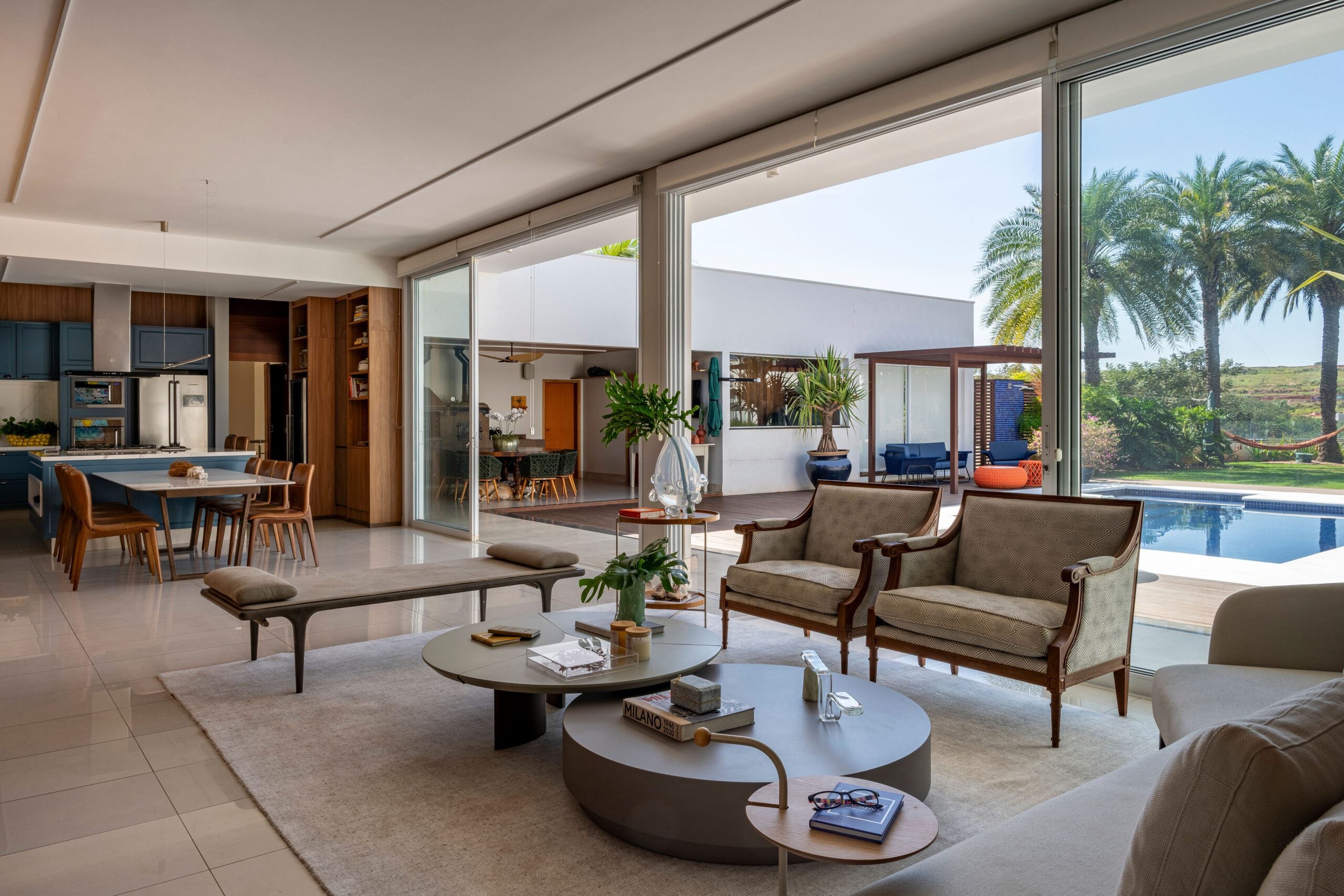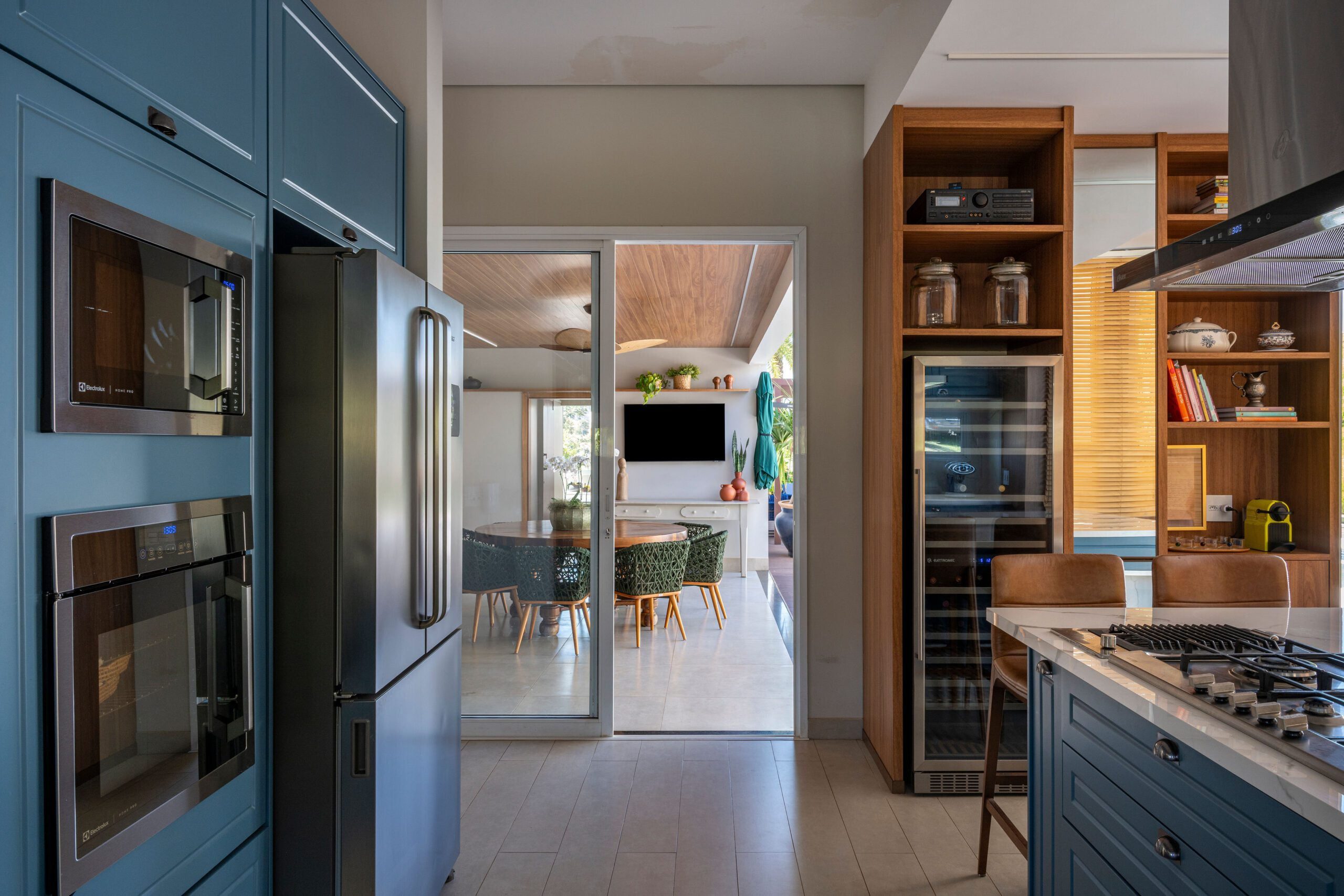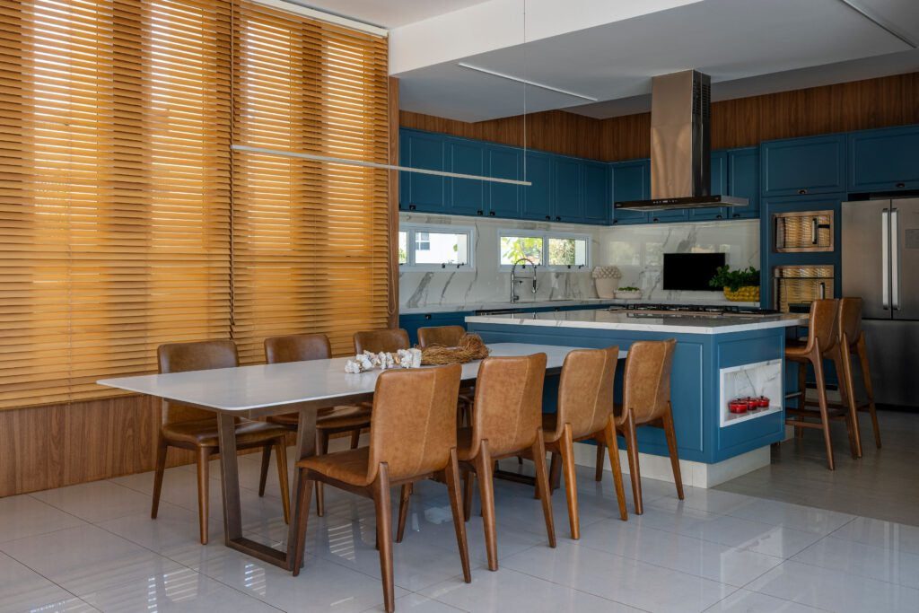A área social tornou-se o coração da casa, com sala e cozinha integradas em um espaço fluido e convidativo. A marcenaria sob medida, a escolha de materiais naturais e a iluminação abundante criaram uma atmosfera calorosa, favorecendo tanto a rotina familiar quanto a recepção de amigos. A integração visual e funcional aproxima as pessoas e valoriza a vivência coletiva.