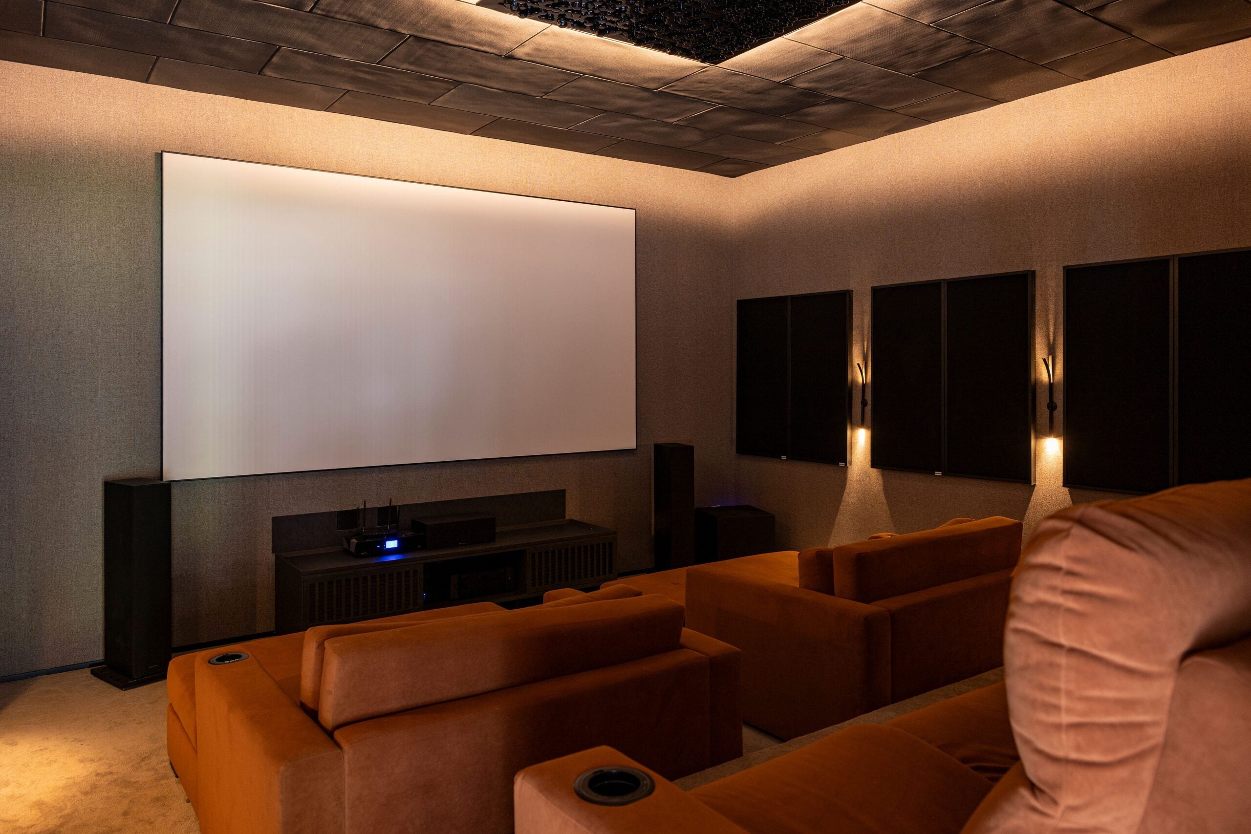 A ampliação da residência trouxe novos espaços sem romper com a linguagem estética original. Um cinema residencial com tratamento acústico proporciona experiências imersivas de entretenimento, enquanto um escritório anexo foi planejado para atender às demandas do home office com ergonomia e isolamento adequados.