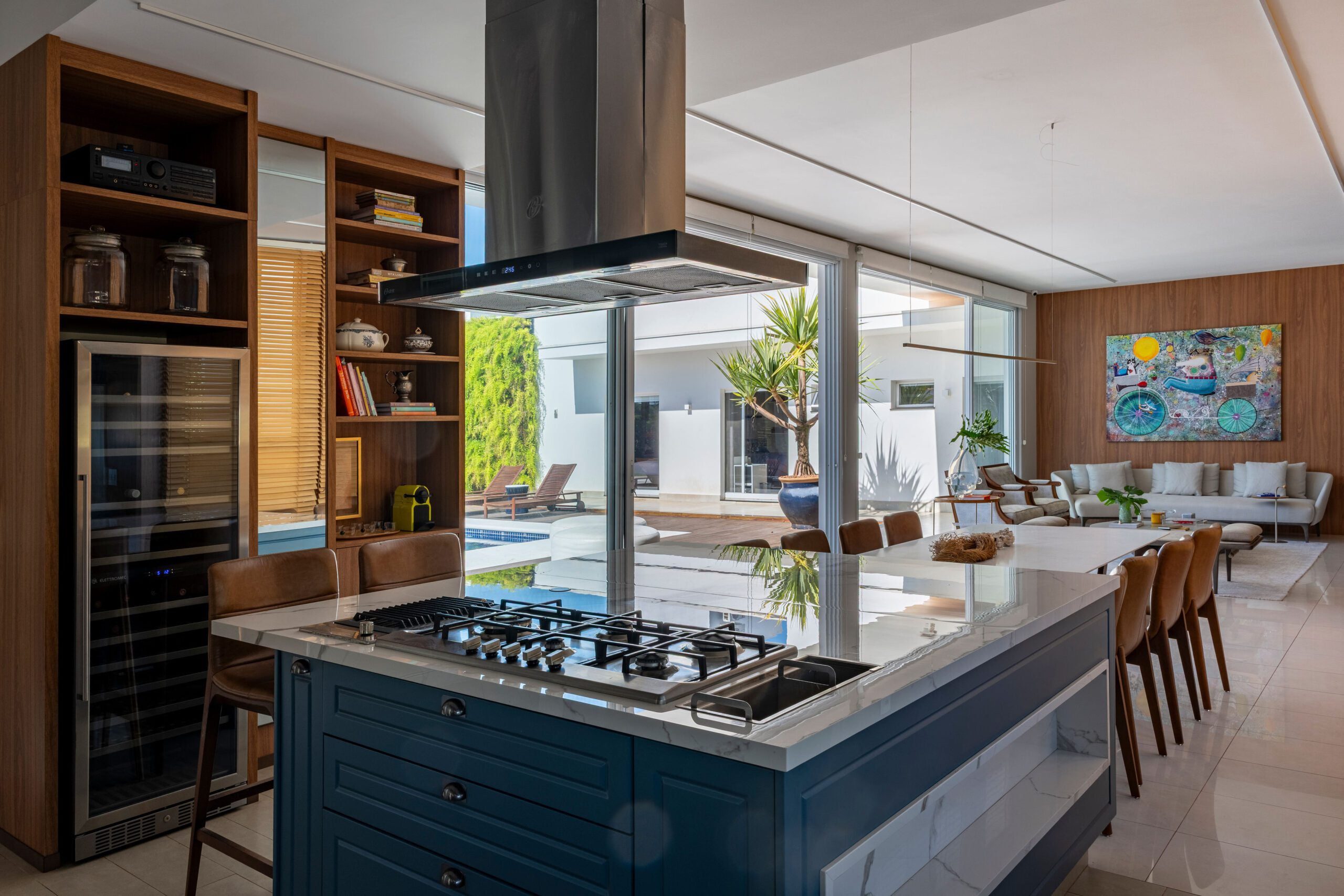 Entre os complementos, destacam-se ainda uma adega climatizada, desenhada para momentos de degustação e encontro, e um quarto de hóspedes com banheiro exclusivo, garantindo conforto e privacidade aos visitantes.