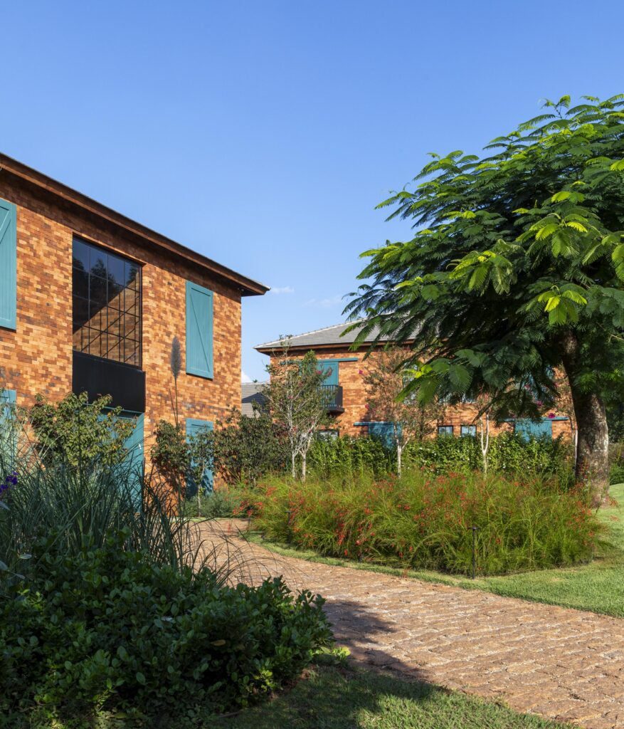 O design das fachadas remete ao charme rústico das vilas inglesas, mas com uma interpretação contemporânea e tropicalizada.