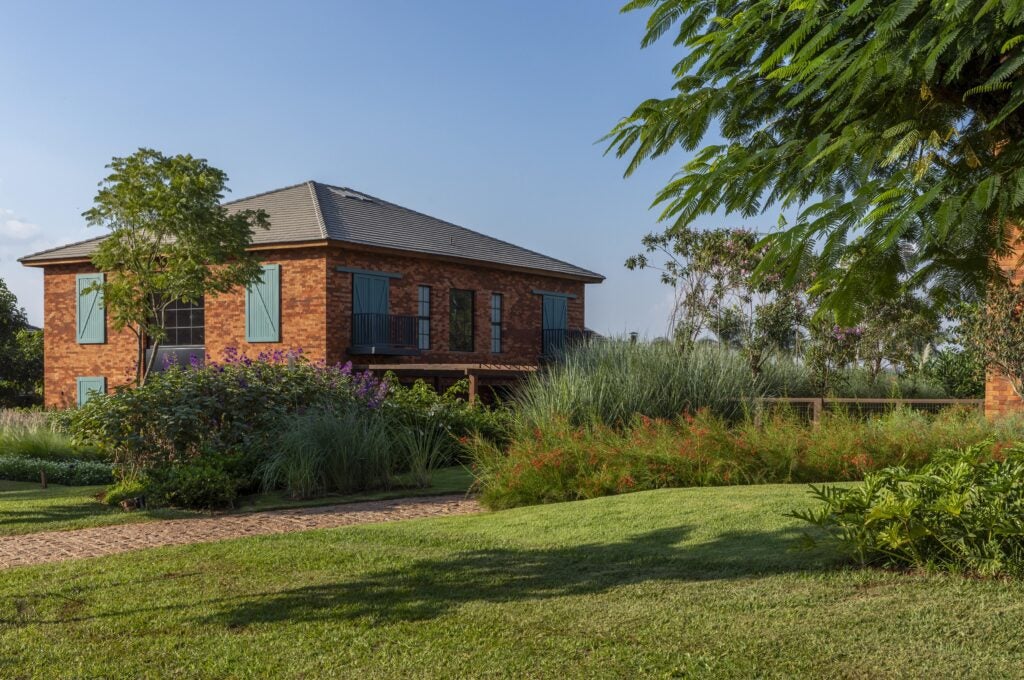 O paisagismo de Daniel Nunes envolve a construção com vegetação abundante, aproximando o imóvel do cenário natural do condomínio.
