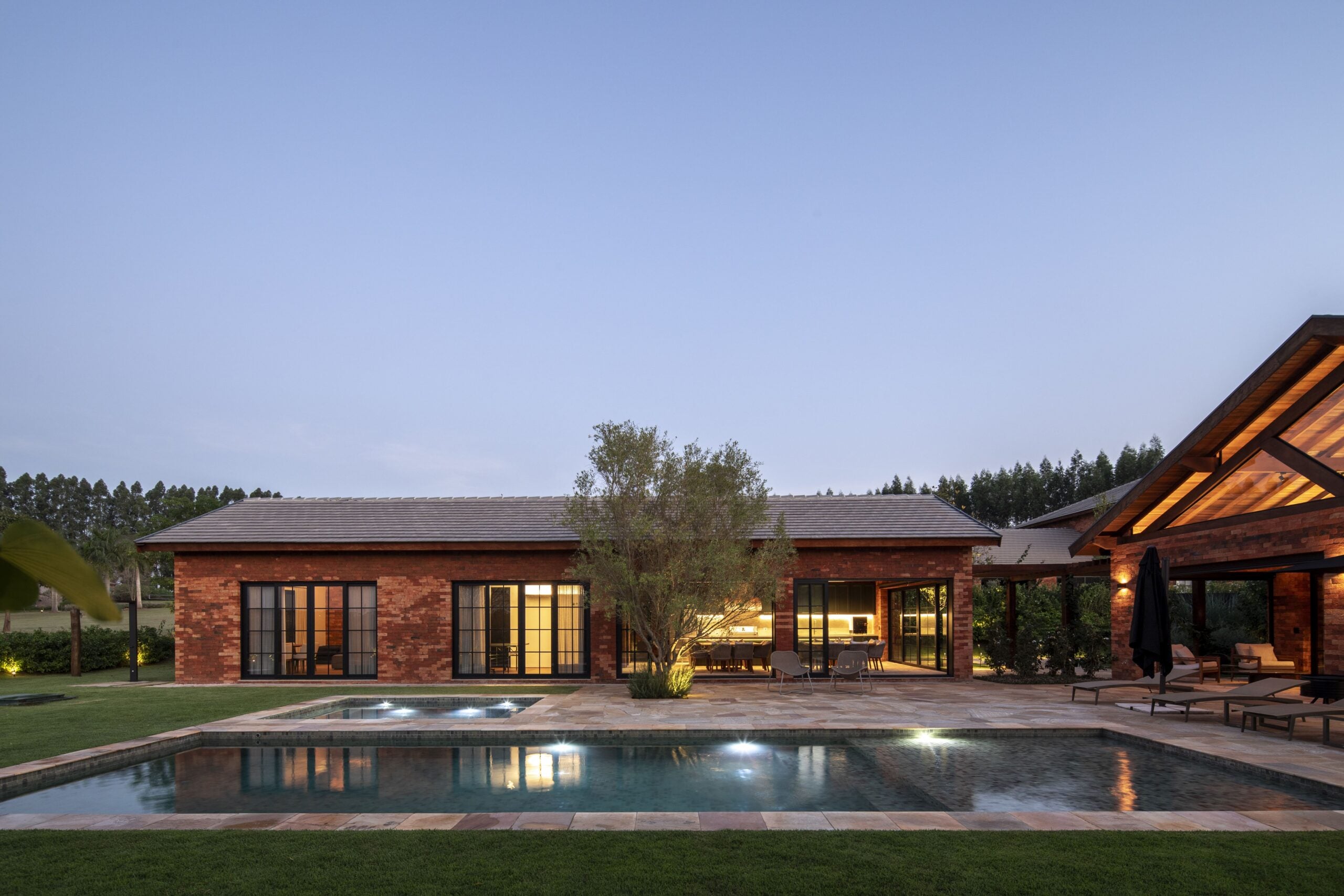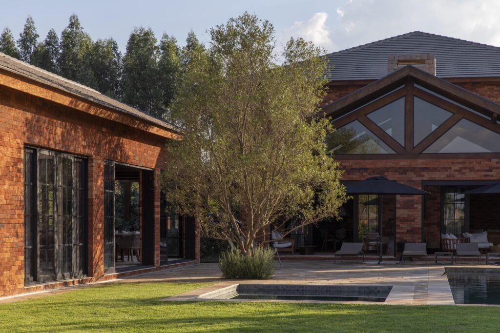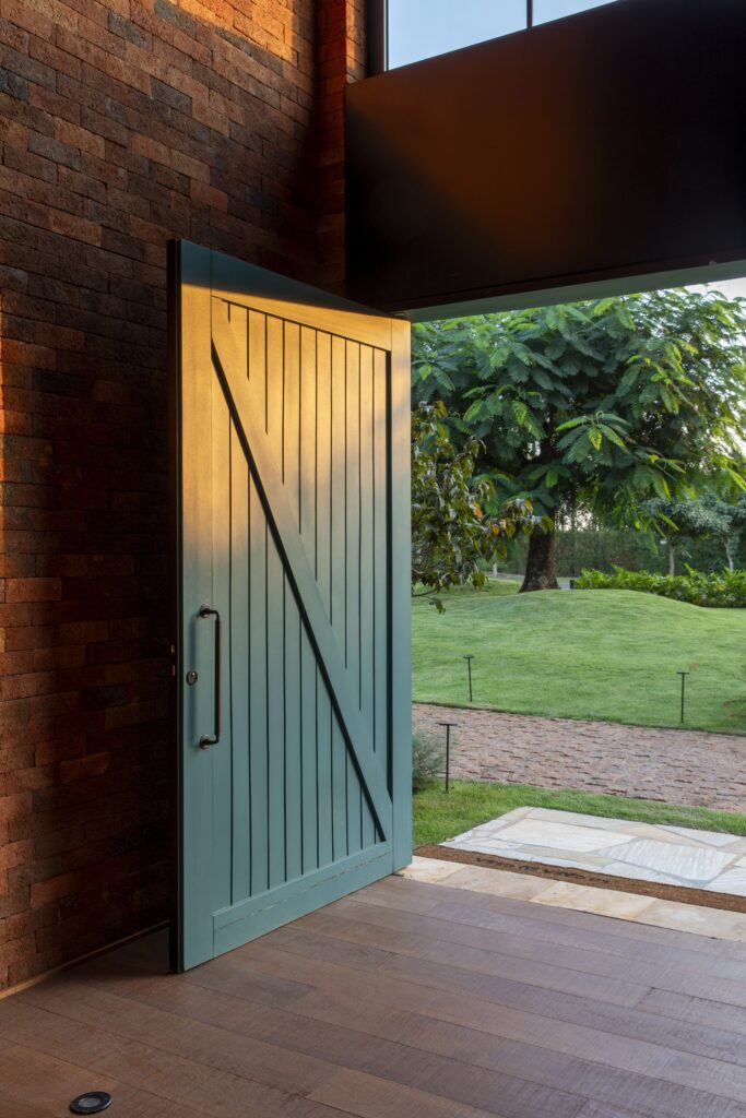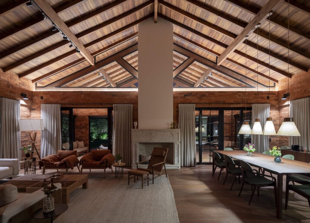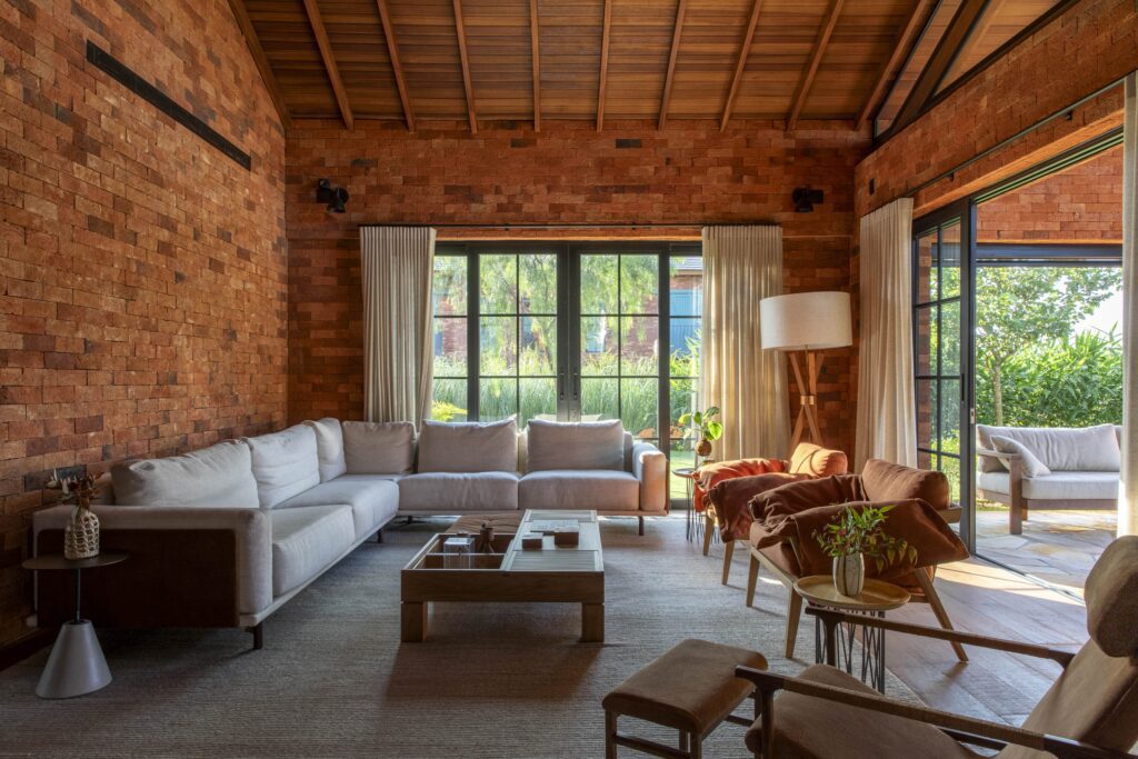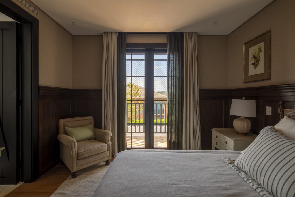 Com referências das casas de campo europeias, o projeto valoriza materiais como pedra, madeira e tijolo, que reforçam o caráter rústico e acolhedor.