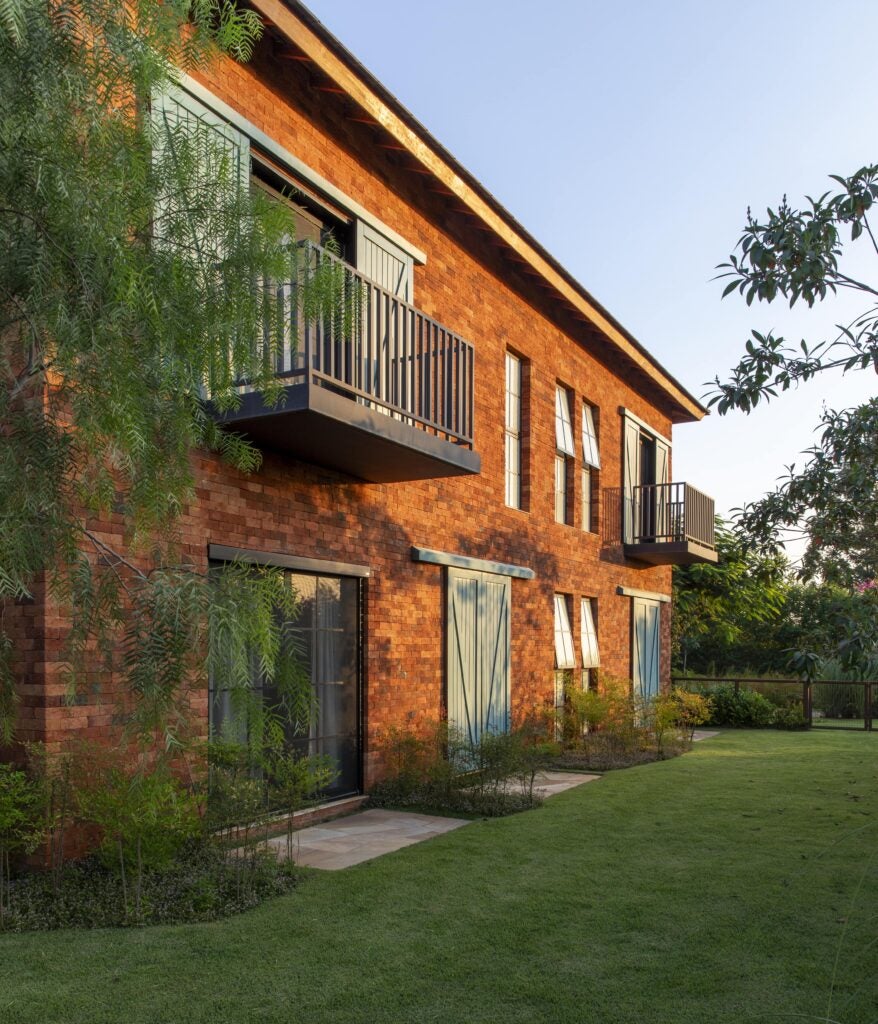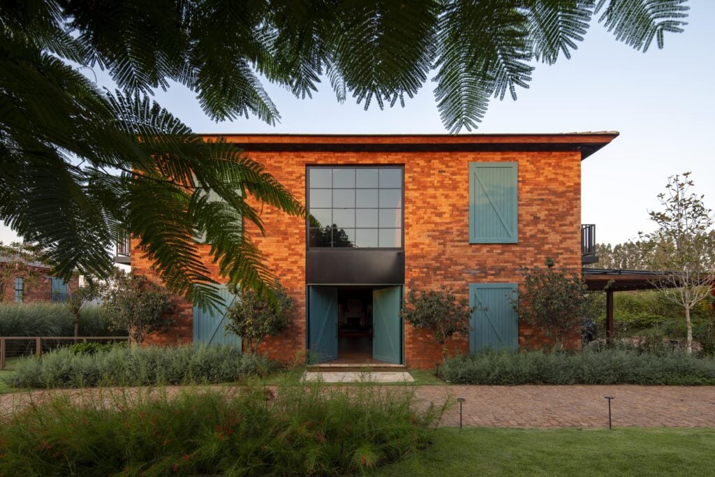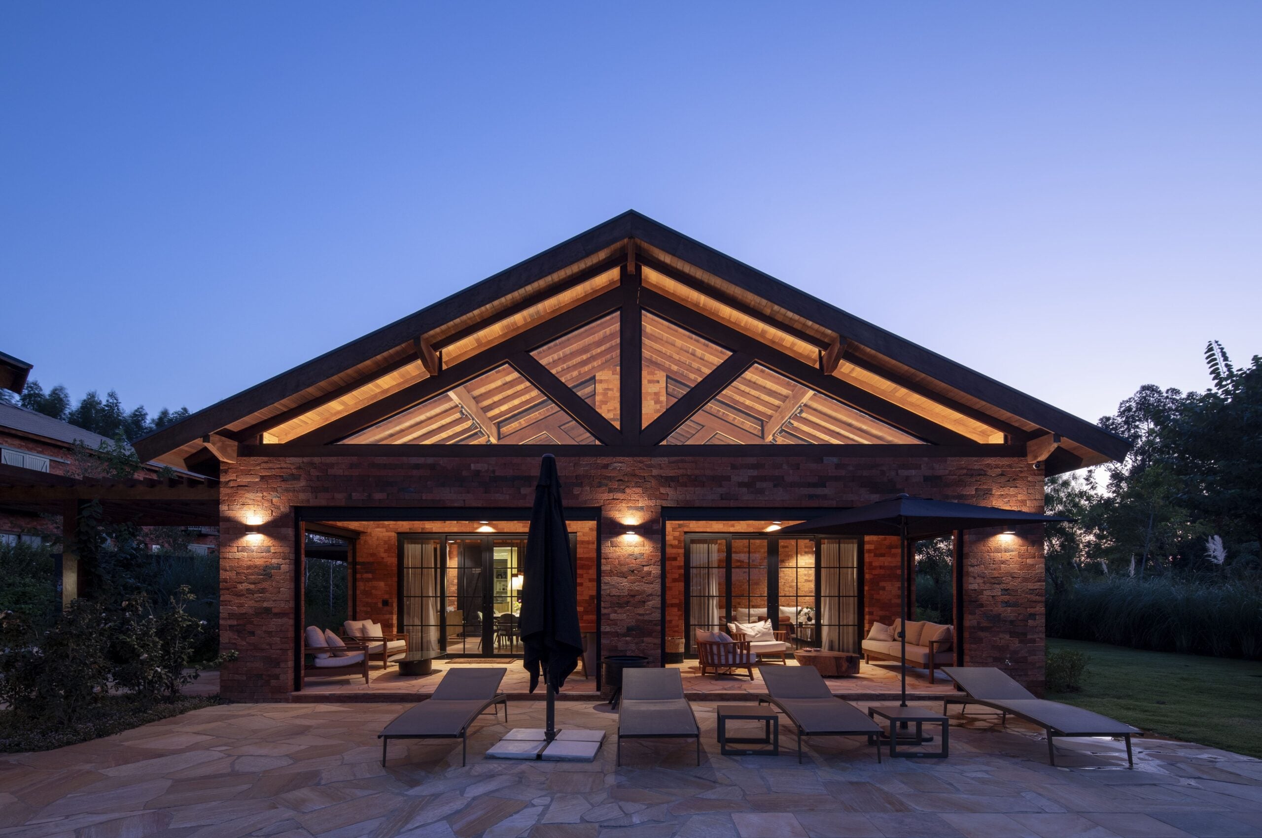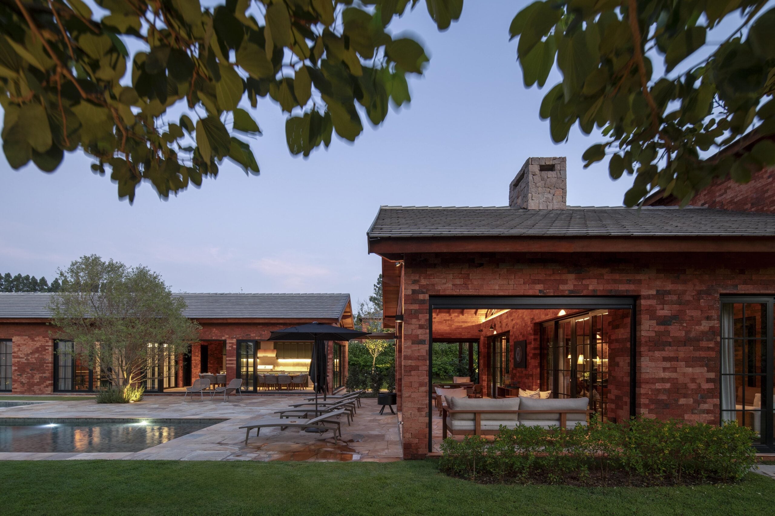 Com referências das casas de campo europeias, o projeto valoriza materiais como pedra, madeira e tijolo, que reforçam o caráter rústico e acolhedor.