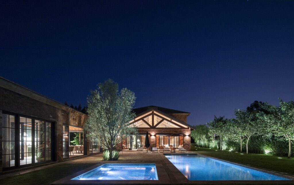 O paisagismo do condomínio, assinado por Maria João d’Orey, complementa a harmonia entre a residência e o entorno.