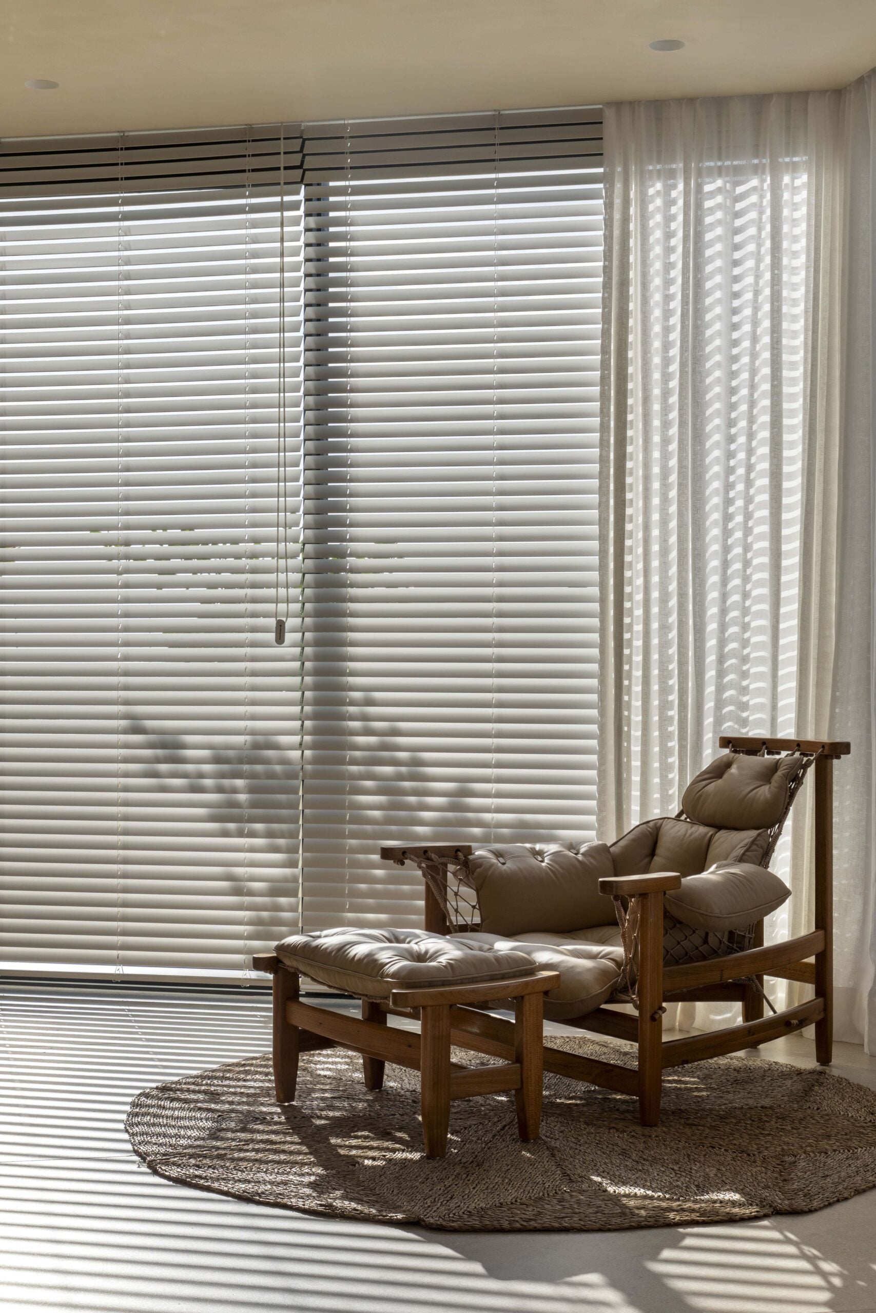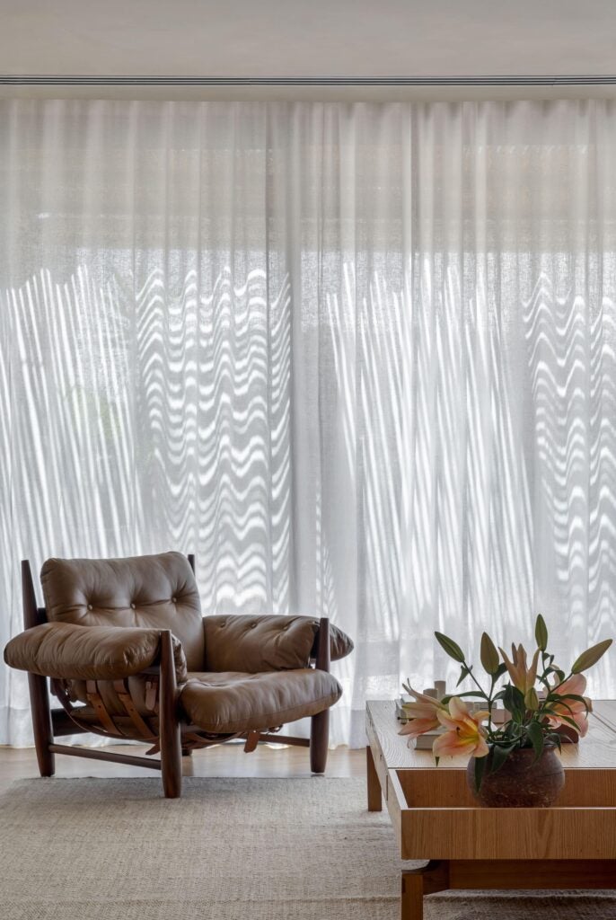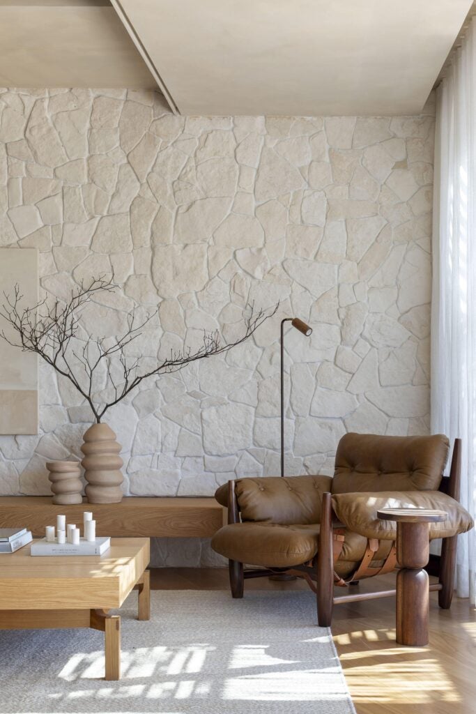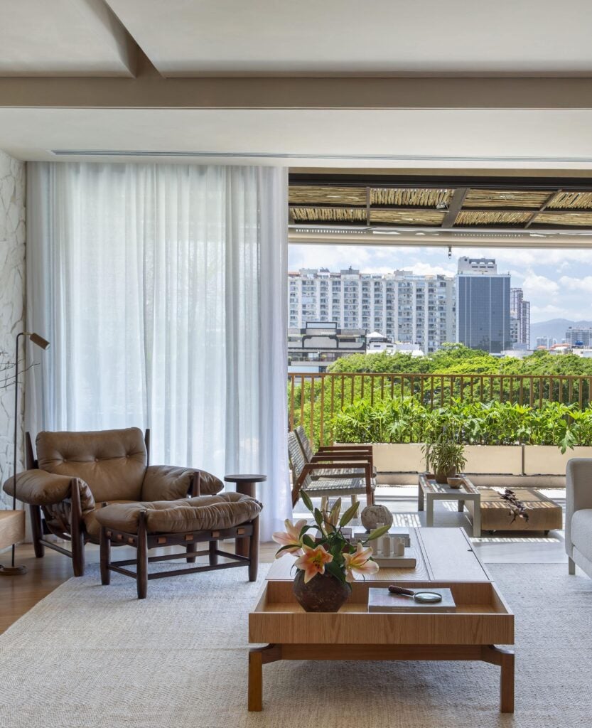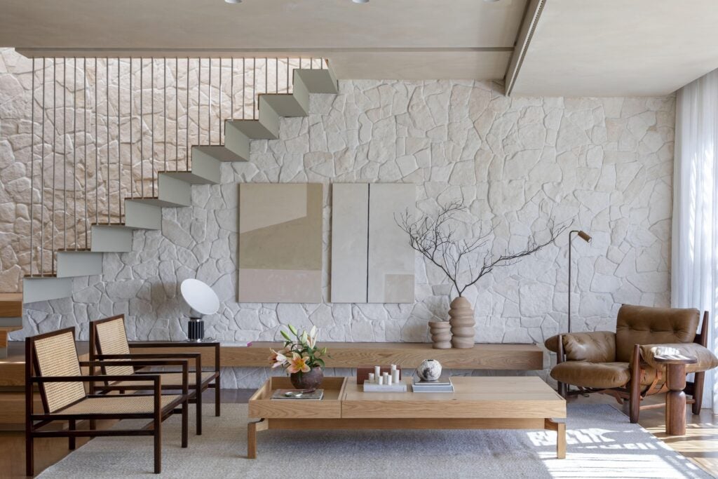 A decoração reforça a conexão com os materiais naturais, com destaque para peças de design contemporâneo.