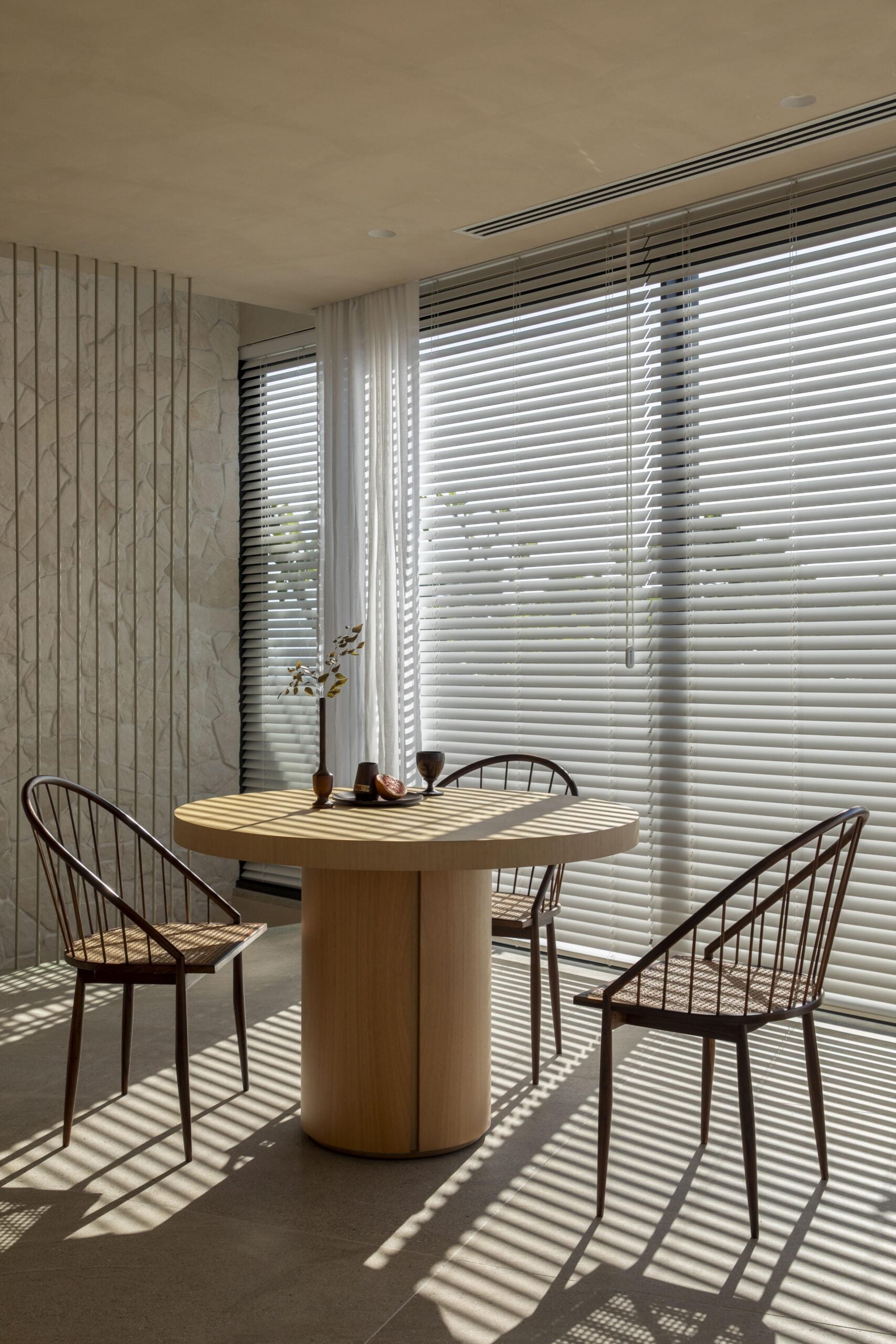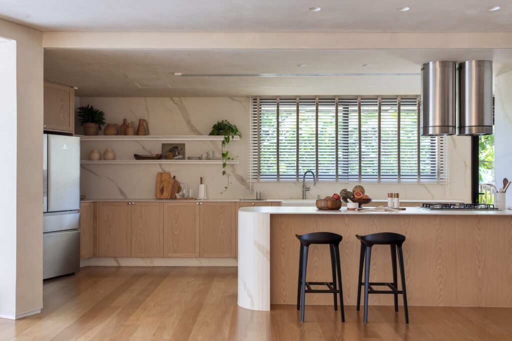 As marcenarias em carvalho natural aquecem os ambientes, enquanto o teto em cimento queimado acrescenta textura e personalidade à composição.