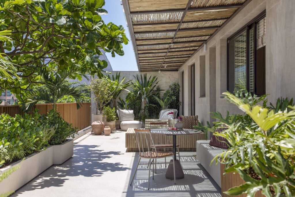 O paisagismo tropical assinado pelo Horto Girassol leva frescor e verde para diferentes áreas da cobertura. Plantas exuberantes envolvem a varanda, reforçando a sensação de estar em um refúgio próximo à natureza.