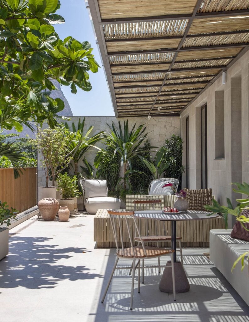 Na varanda, o ripado de biribas de eucalipto nos pergolados filtra a luz do sol e desenha sombras geométricas no piso.