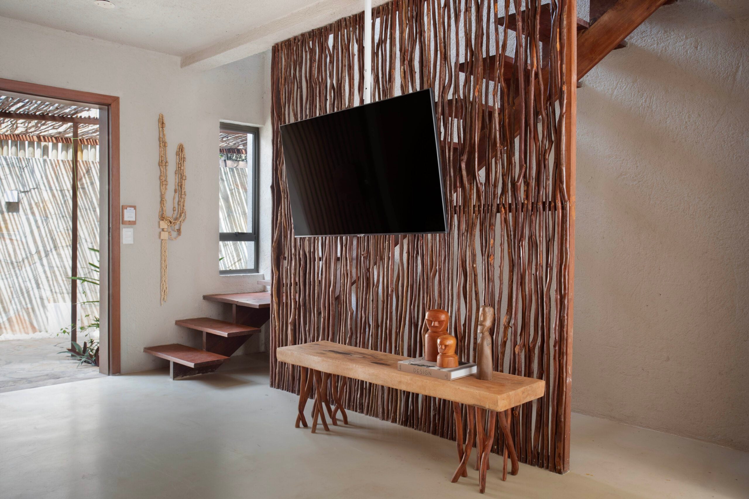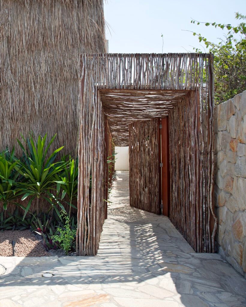 Um dos destaques do projeto é a fachada cega totalmente revestida em palha, que confere caráter rústico e promove uma integração quase camuflada com a paisagem. O acesso à casa se dá por um túnel formado por galhos de pau canela, criando uma experiência de transição sensorial. Ao atravessá-lo, o visitante é convidado a desacelerar e se desconectar do ritmo urbano antes de adentrar os espaços de convivência.