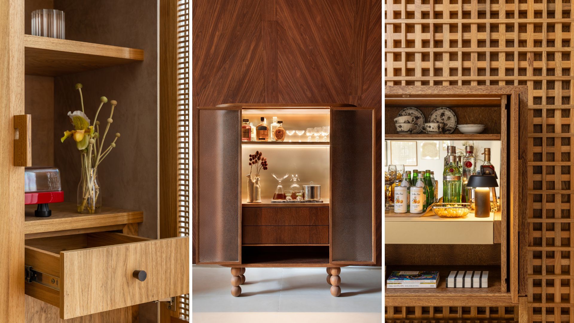 Com três áreas – lareira, ilha com mesa de jantar e estar – o ambiente com itens afetivos foi pensado para celebrar experiências em uma atmosfera convidativa e elegante. Destaque para o piso e lareira em barro branco rústico, e para a presença da madeira escura no muxarabi e nas ripas no teto que lembram dormentes.