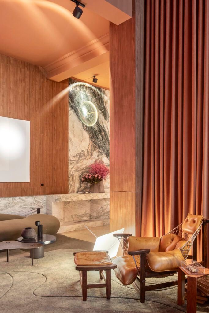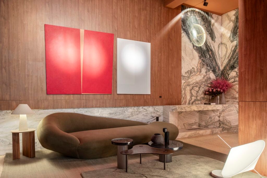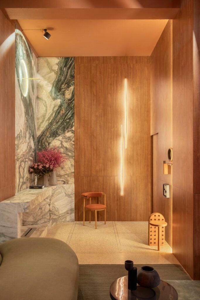 O ambiente de 33 m² nasce como um refúgio sensorial no meio da mostra. Tudo ali aponta para um ritmo mais lento e intencional. A paleta de cores suaves, os materiais naturais e a luz que percorre o espaço com suavidade ajudam a construir essa atmosfera. Nada grita. Tudo acolhe.