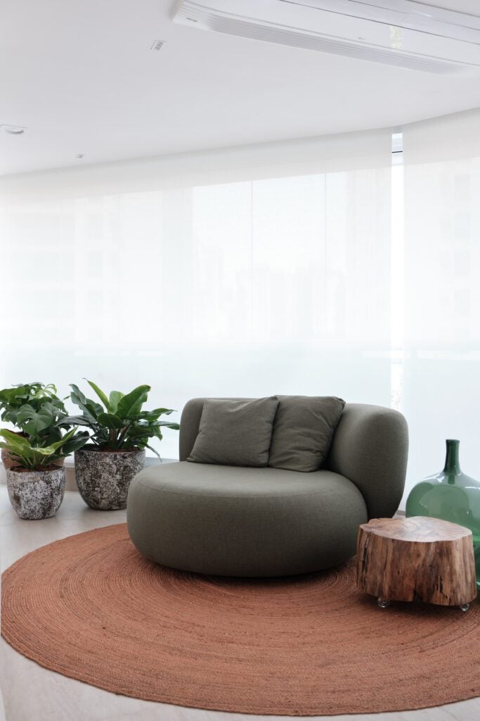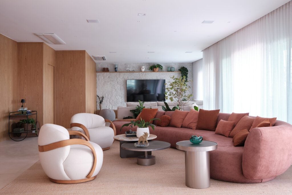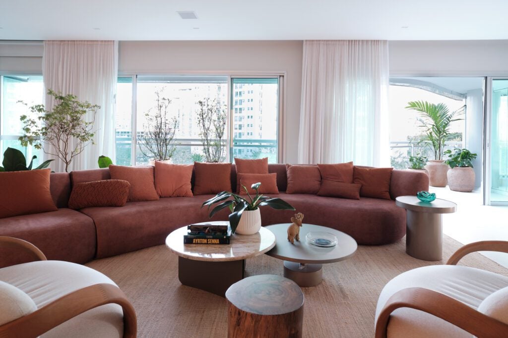 A área social se estrutura a partir da integração entre sala de estar, varanda e cozinha, formando um grande ambiente contínuo e generoso. O living, com 50 m², se abre para a varanda gourmet de mesma proporção, criando uma atmosfera ensolarada, fluida e convidativa. A luz natural, protagonista do projeto, é potencializada por uma paleta de tons neutros e terrosos, pelo uso da madeira freijó e pelo quartzito Taj Mahal, que trazem textura, calor e sofisticação na medida certa.