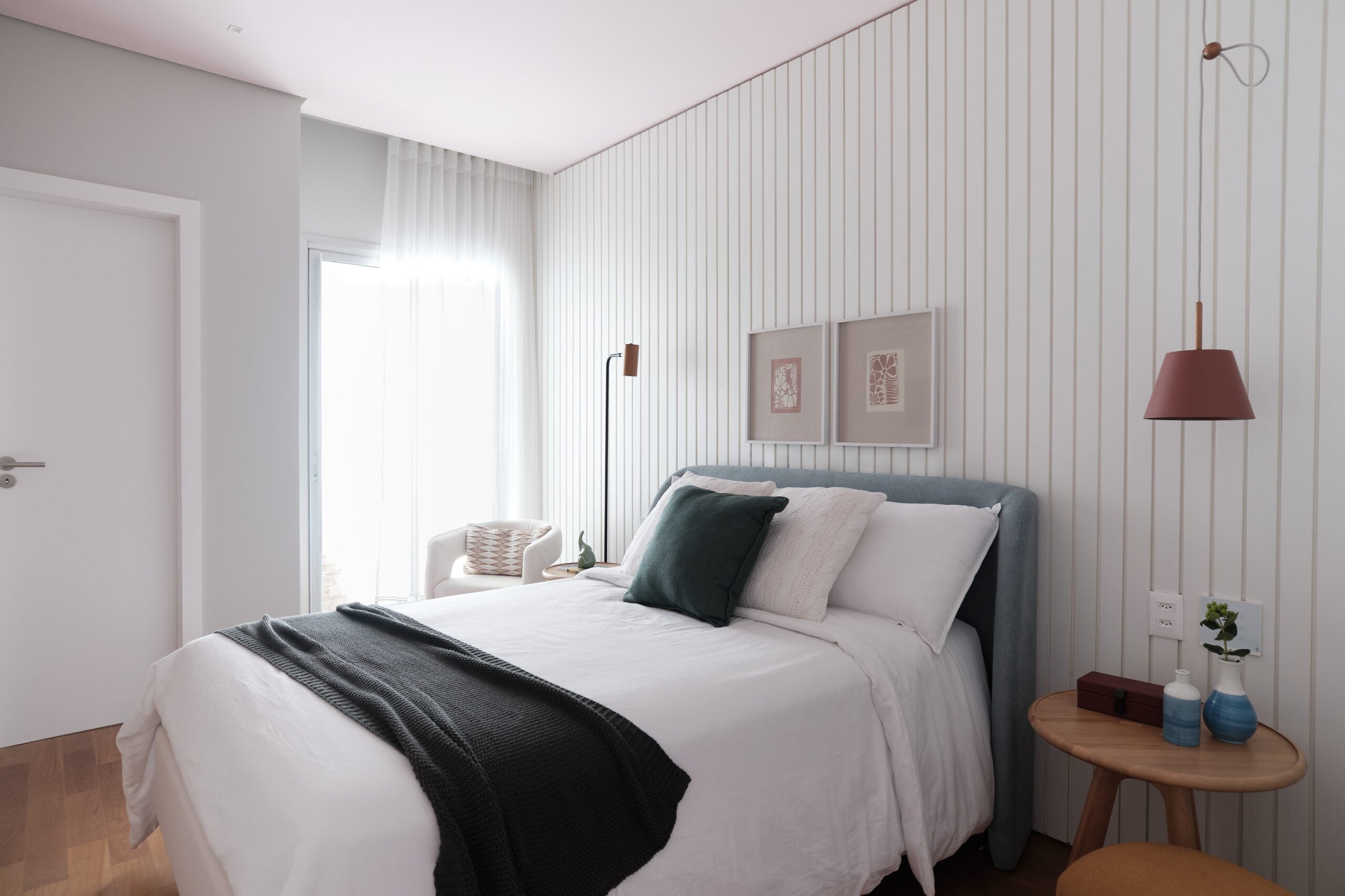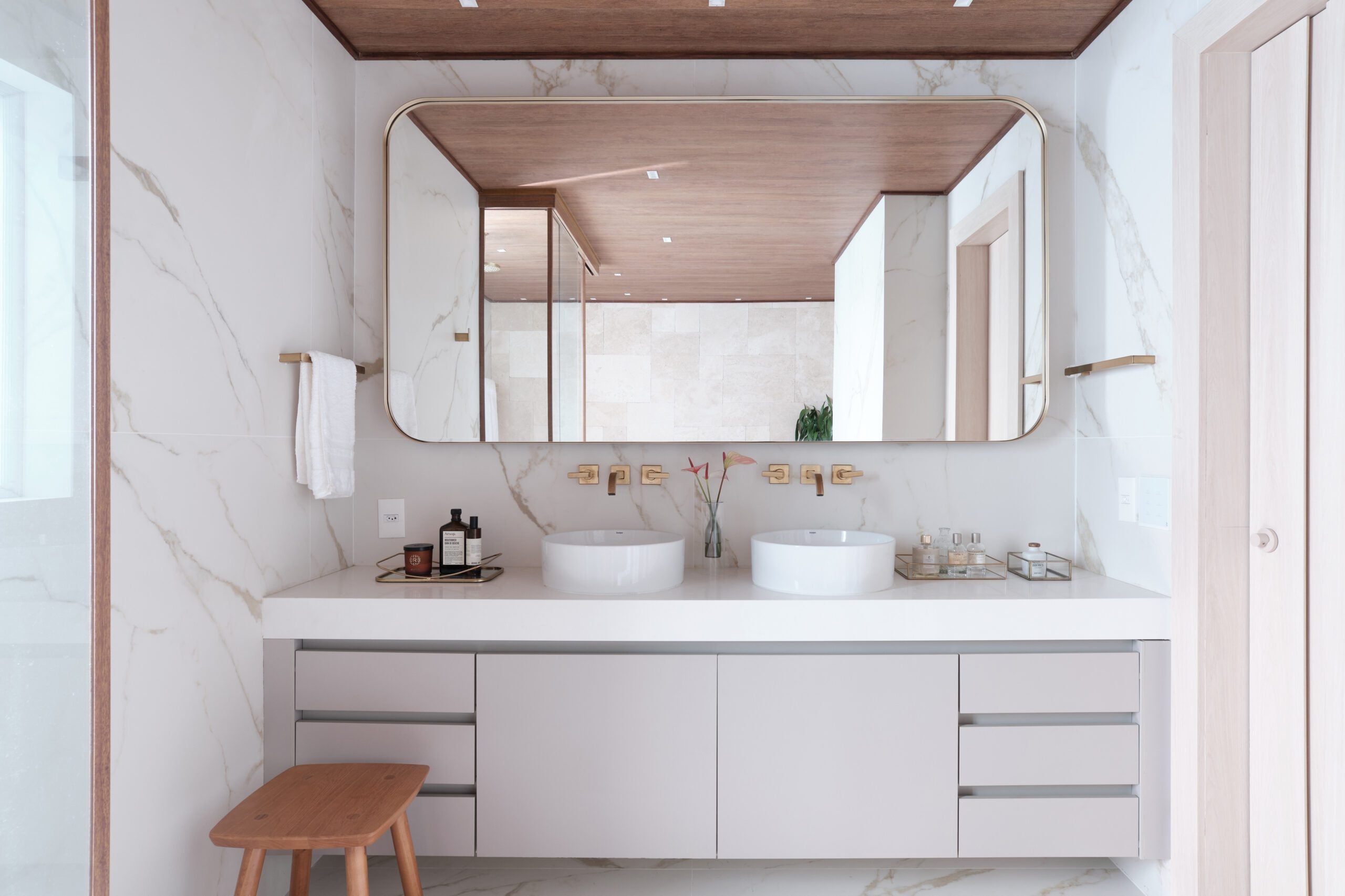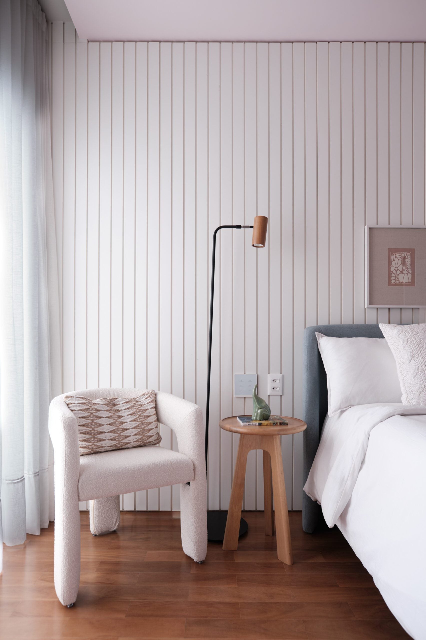 Na área íntima, a suíte master passou por uma reformulação completa para abrigar um closet amplo e um banheiro com atmosfera de spa. O espaço recebeu revestimentos em travertino, deck de ipê para a banheira e bancada dupla, criando um cenário pensado para desacelerar e promover bem-estar. As suítes dos filhos e a suíte de hóspedes, que também funciona como home office, complementam o setor íntimo. O quarto da filha ganhou uma linguagem leve e delicada, com tons de rosa seco e azul, marcenaria branca ripada e cabeceira em tecido bouclé.