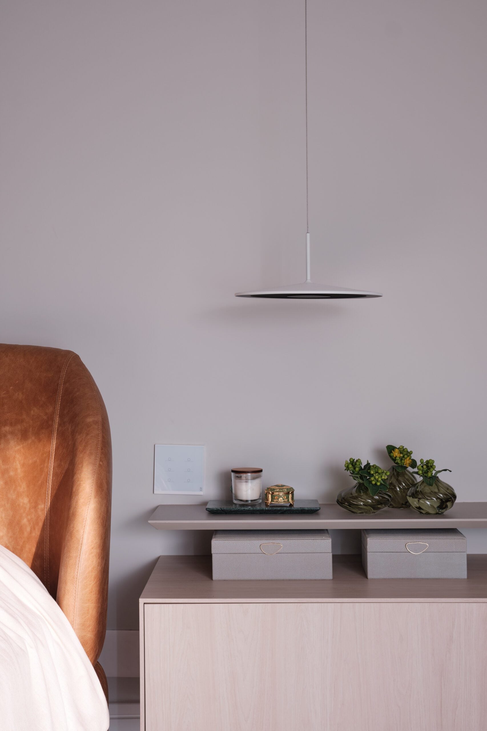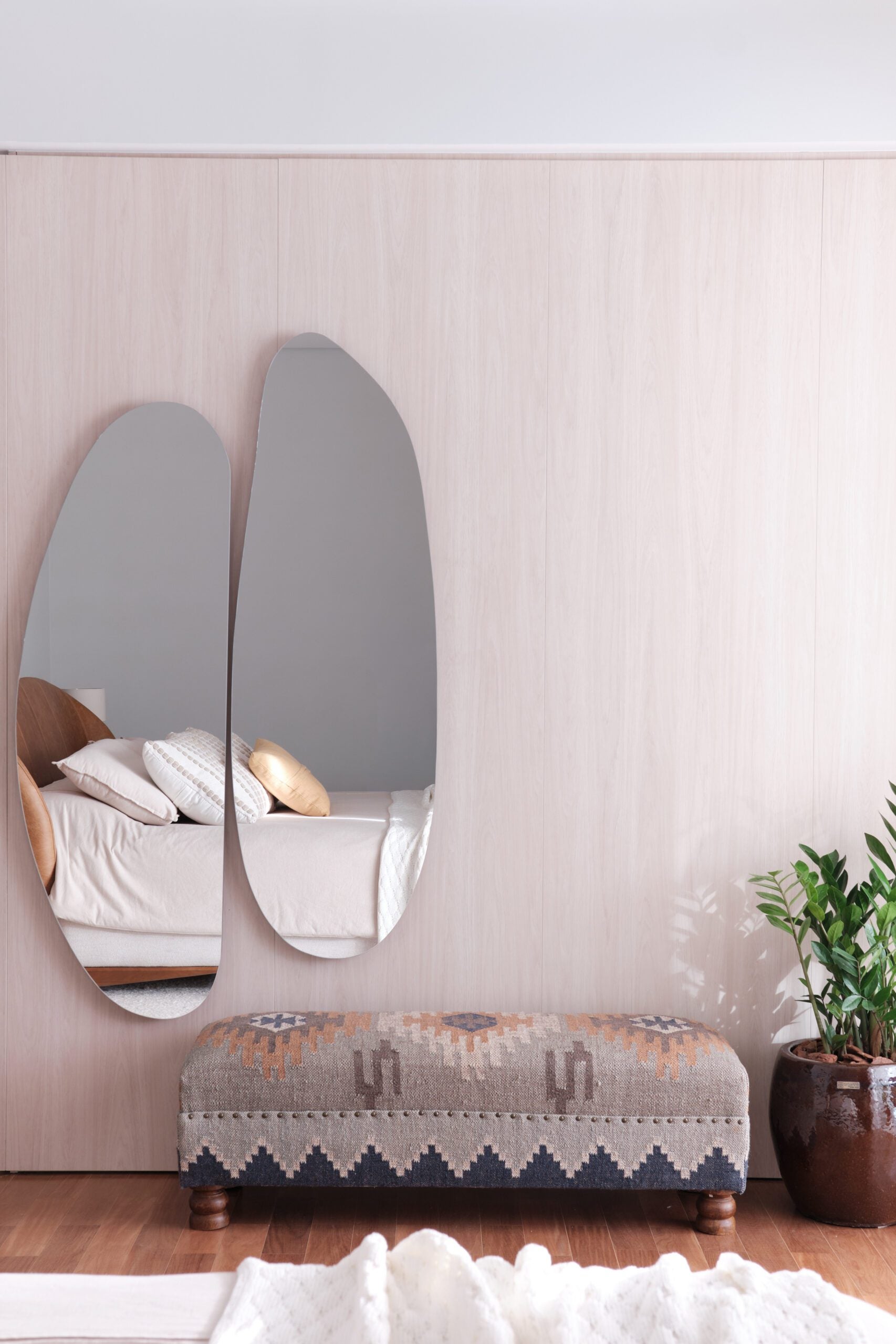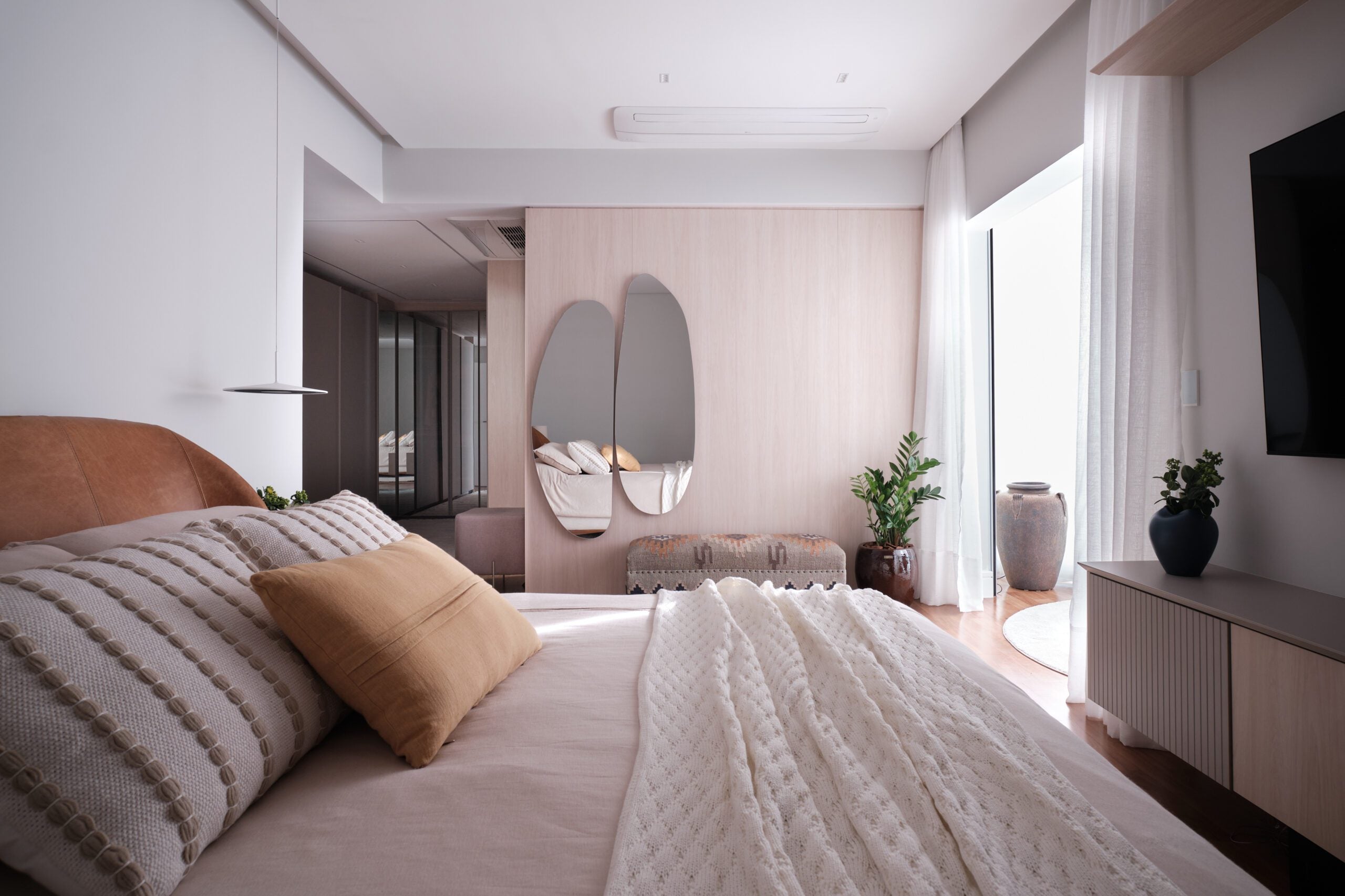 Na área íntima, a suíte master passou por uma reformulação completa para abrigar um closet amplo e um banheiro com atmosfera de spa. O espaço recebeu revestimentos em travertino, deck de ipê para a banheira e bancada dupla, criando um cenário pensado para desacelerar e promover bem-estar. As suítes dos filhos e a suíte de hóspedes, que também funciona como home office, complementam o setor íntimo. O quarto da filha ganhou uma linguagem leve e delicada, com tons de rosa seco e azul, marcenaria branca ripada e cabeceira em tecido bouclé.
