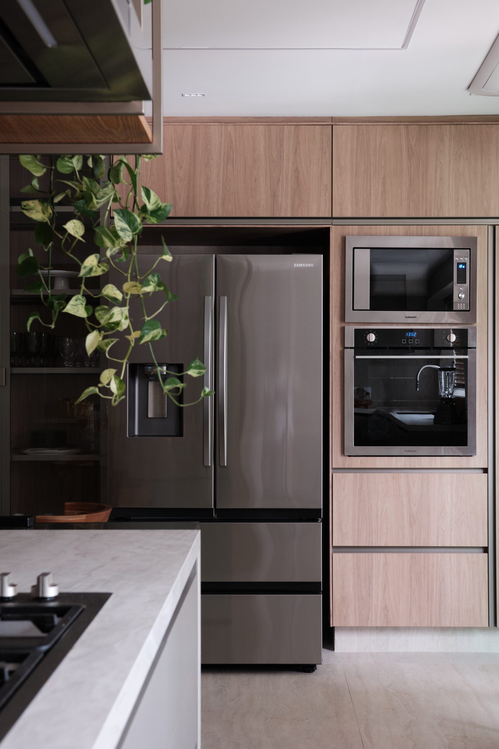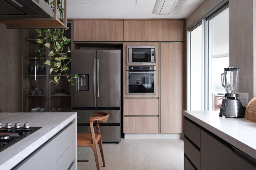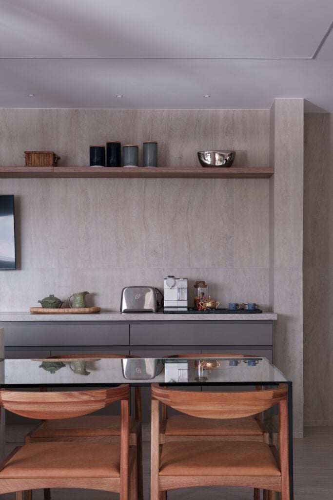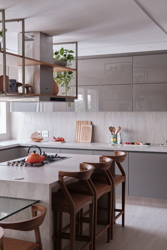 A cozinha, concebida como o coração do apartamento, alia funcionalidade e afeto. O espaço ganhou uma ilha central com fogão e banquetas, ideal para refeições rápidas e para acompanhar o preparo dos pratos. Totalmente revestida com porcelanato da Portobello, conta com bancadas em superfície Ultra Compact e eletrodomésticos da Celdon. Um desejo especial da moradora, a cristaleira para exibir suas louças favoritas, tornou-se um dos elementos mais emblemáticos do ambiente, reforçando o caráter emocional do projeto.