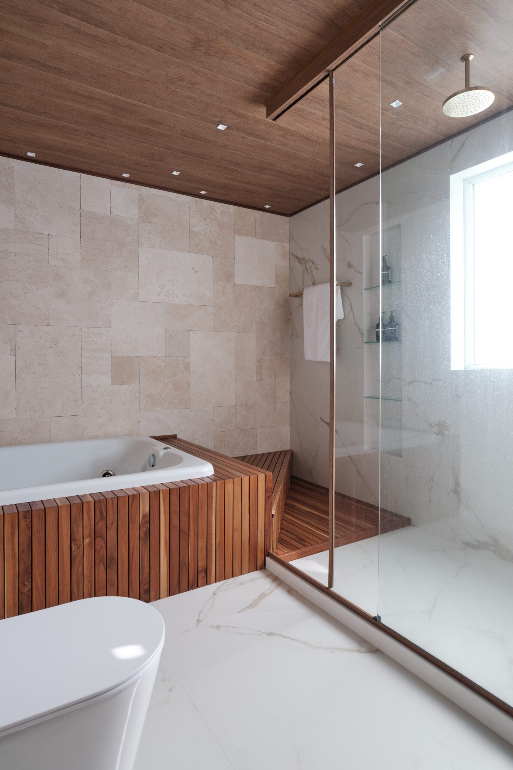 Na área íntima, a suíte master passou por uma reformulação completa para abrigar um closet amplo e um banheiro com atmosfera de spa. O espaço recebeu revestimentos em travertino, deck de ipê para a banheira e bancada dupla, criando um cenário pensado para desacelerar e promover bem-estar. As suítes dos filhos e a suíte de hóspedes, que também funciona como home office, complementam o setor íntimo. O quarto da filha ganhou uma linguagem leve e delicada, com tons de rosa seco e azul, marcenaria branca ripada e cabeceira em tecido bouclé.